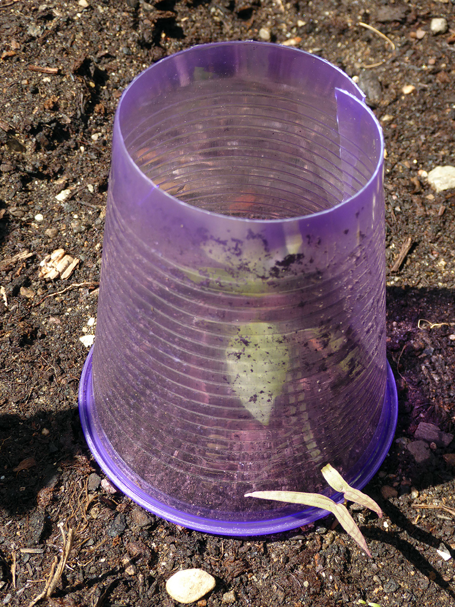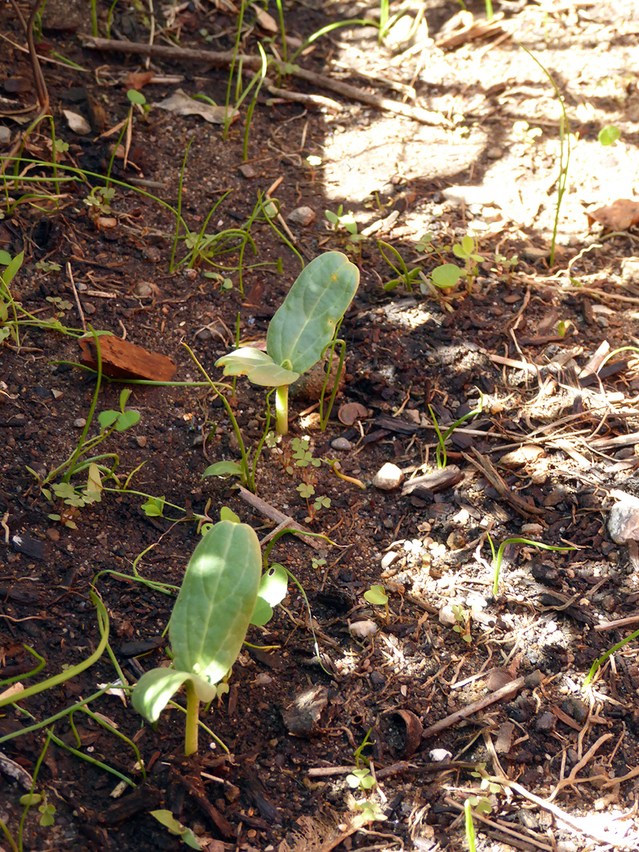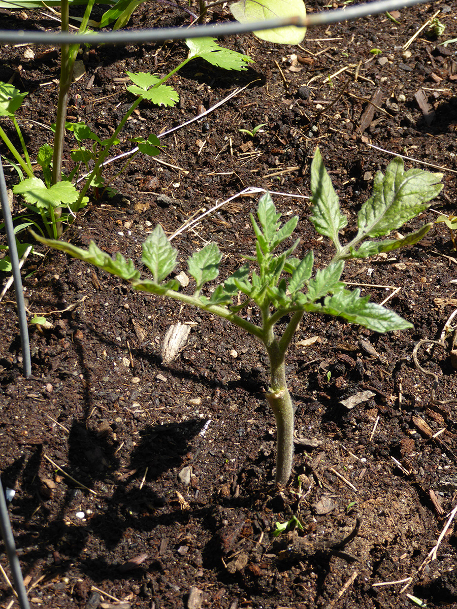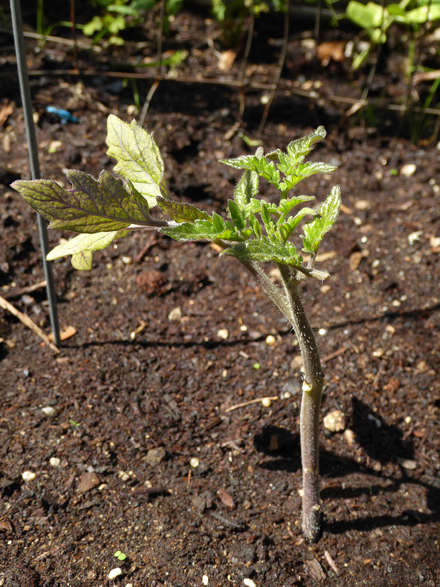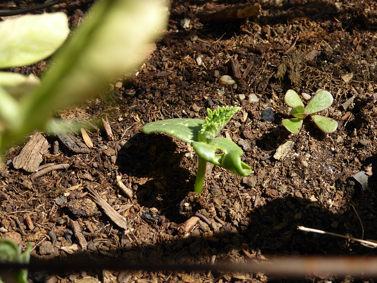 elsewhere in the garden: i noticed no difference in the iron treated jasmines, the leaves still show signs of chlorosis. we moved them to a sunny location, hopefully the light will induce the leaves to turn green. i noticed this last week, but the morning glory and moon flower seeds have germinated along the southern wall. they will grow slowly because the fence blocks the light, but once they crawl up the trellis they will get the sunshine they need. a few dahlias have also sprouted, i put plastic collars around them to protect them from possible critters.