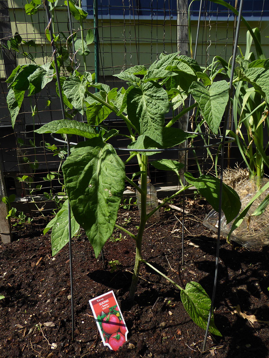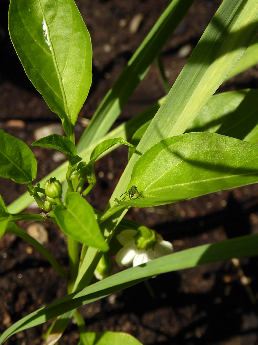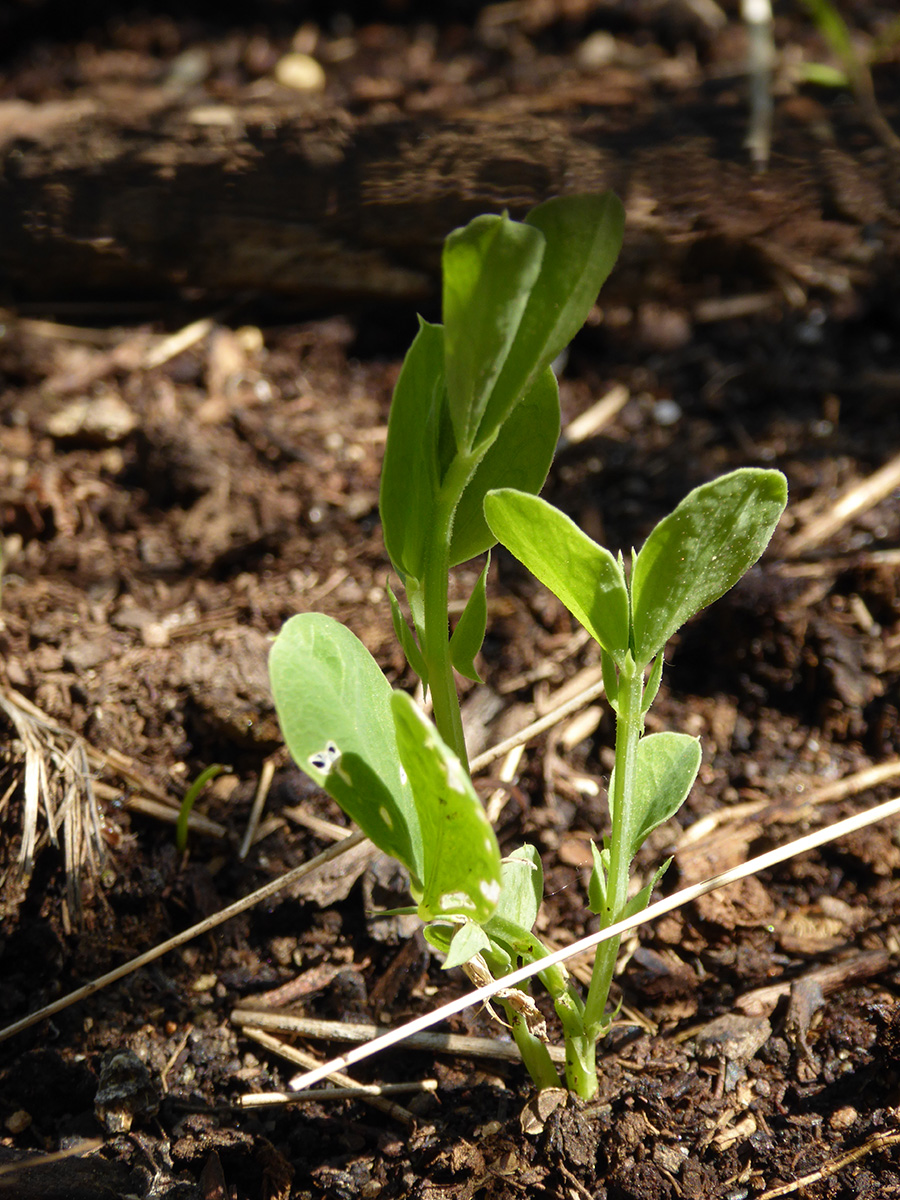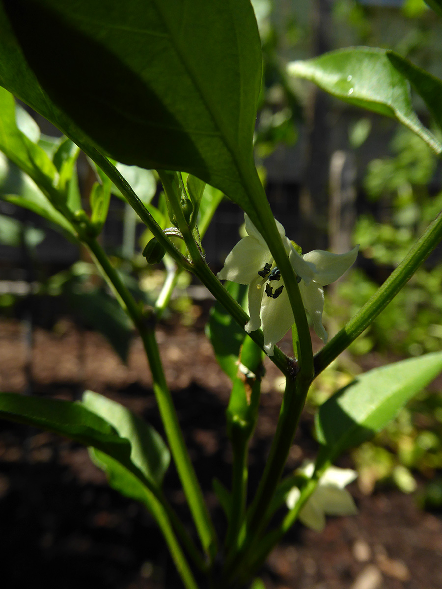 white sugar snap pea flowers have formed, but the weather is getting warmer, and peas like it colder, so we'll see how many peas we can get. there are also fragrant peas but they seem stunted. a few hyacinth beans hide within their midst as well. cucumber seedlings have also sprouted, as well as bottle gourds. the potted gardenia has completely defoliated but remarkably tiny leaves are starting to reemerge from the bare branches. with a sharp alcohol-sanitized knife i pruned off some lower branches on the tomato and pepper plants. my father spotted a stray bamboo shoot and we quickly dug it up. finally, i spotted some bird droppings on our solar panels so i climbed a ladder with the garden hose and washed them off.