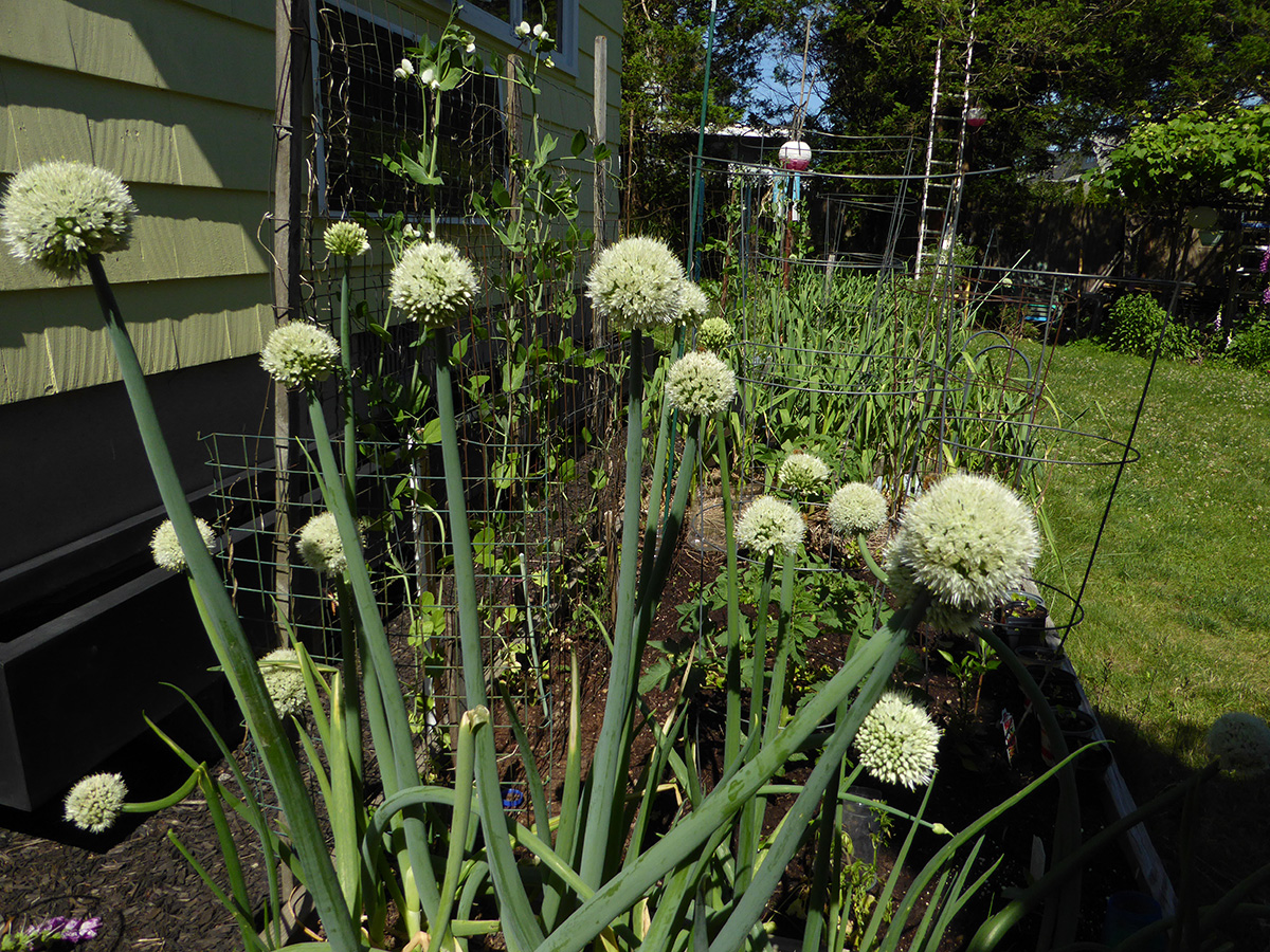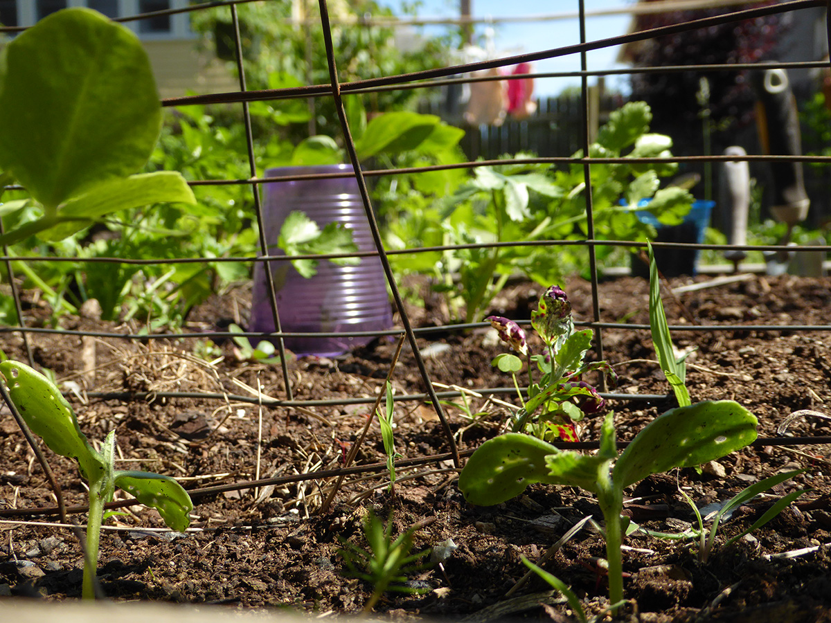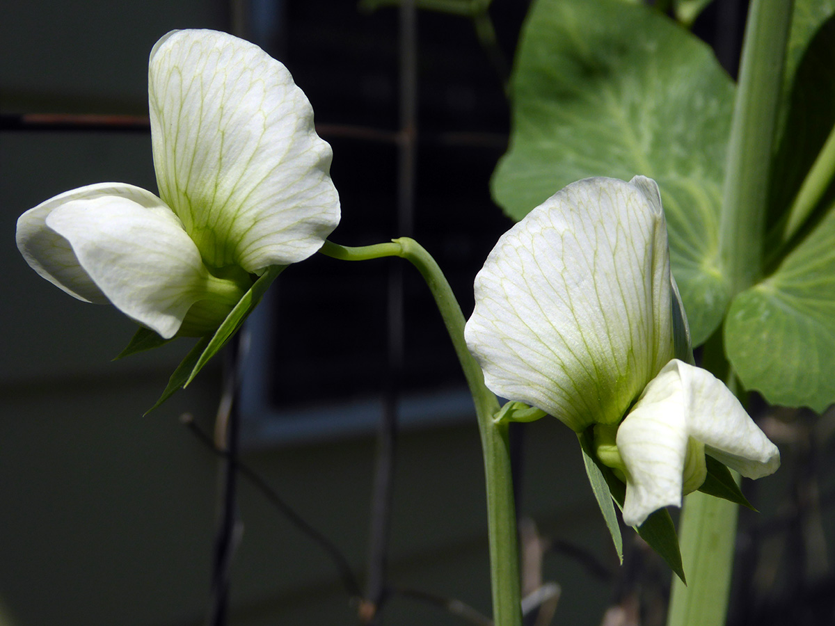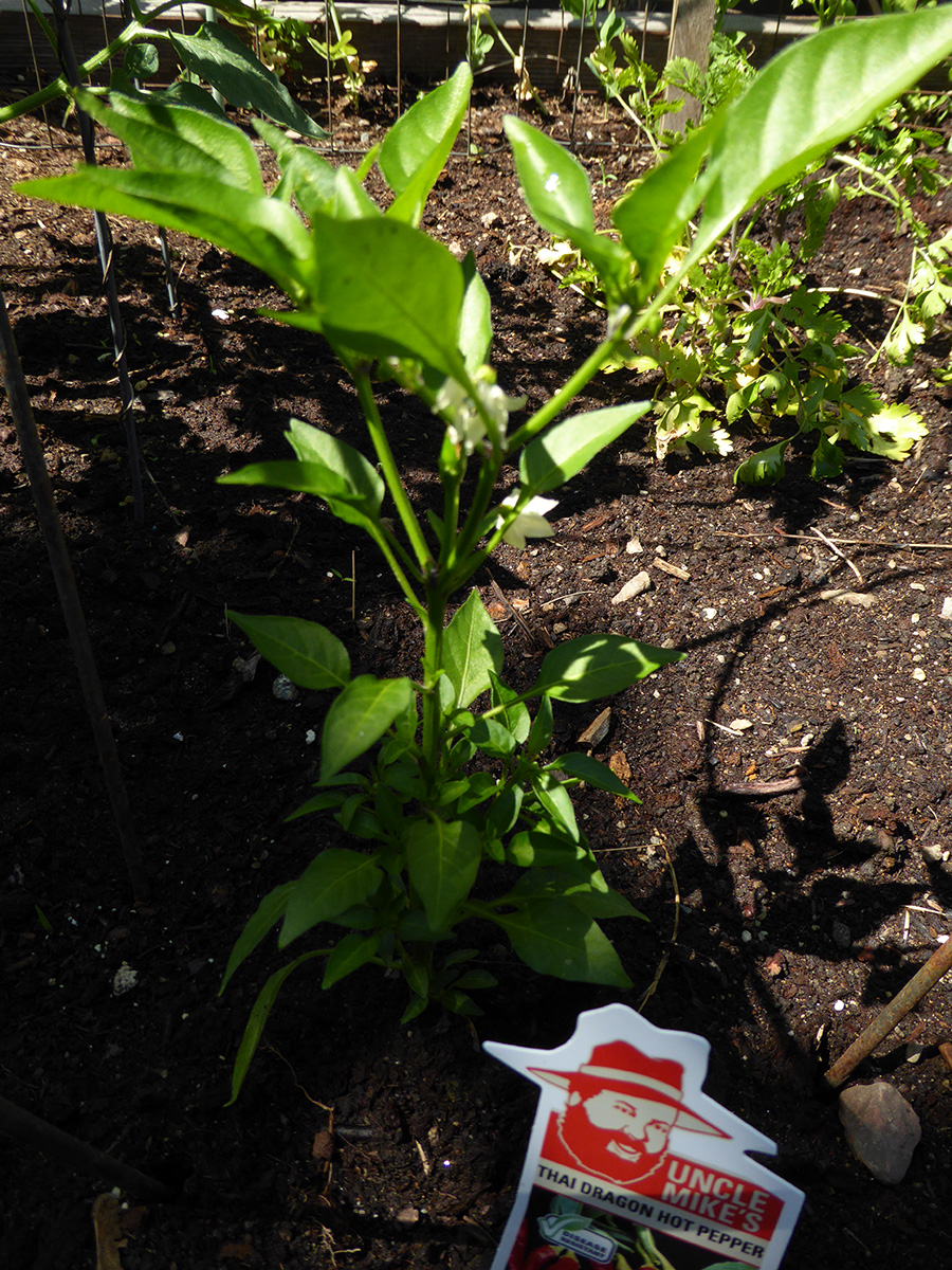 white sugar snap pea flowers have formed, but the weather is getting warmer, and peas like it colder, so we'll see how many peas we can get. there are also fragrant peas but they seem stunted. a few hyacinth beans hide within their midst as well. cucumber seedlings have also sprouted, as well as bottle gourds. the potted gardenia has completely defoliated but remarkably tiny leaves are starting to reemerge from the bare branches. with a sharp alcohol-sanitized knife i pruned off some lower branches on the tomato and pepper plants. my father spotted a stray bamboo shoot and we quickly dug it up. finally, i spotted some bird droppings on our solar panels so i climbed a ladder with the garden hose and washed them off.