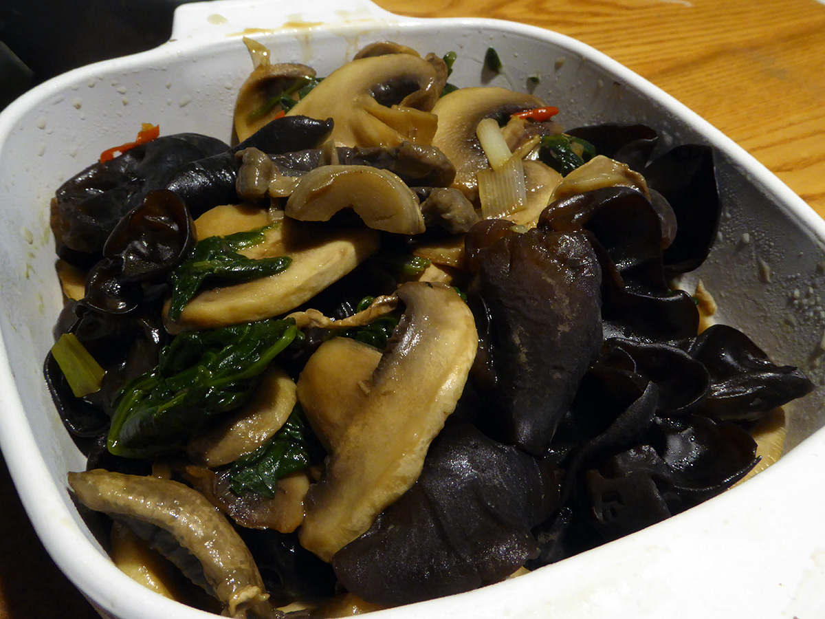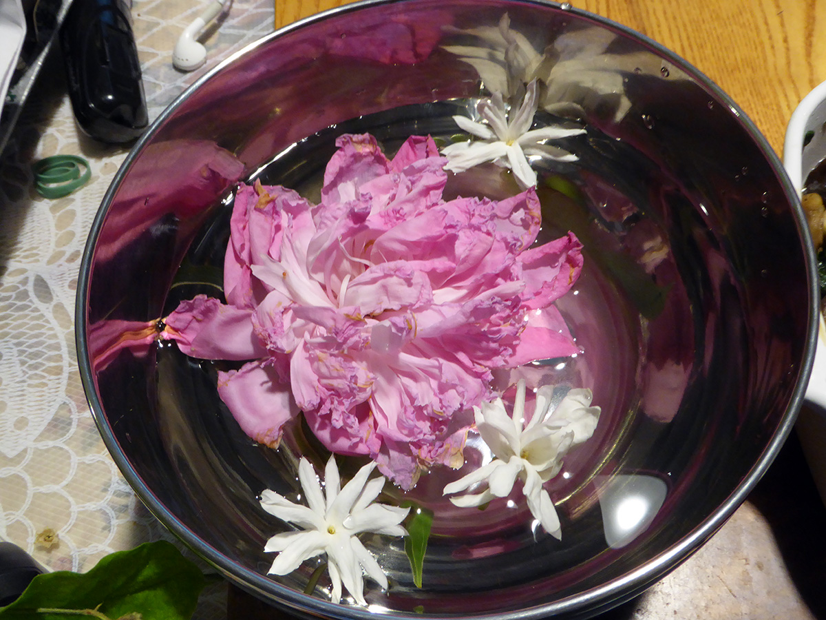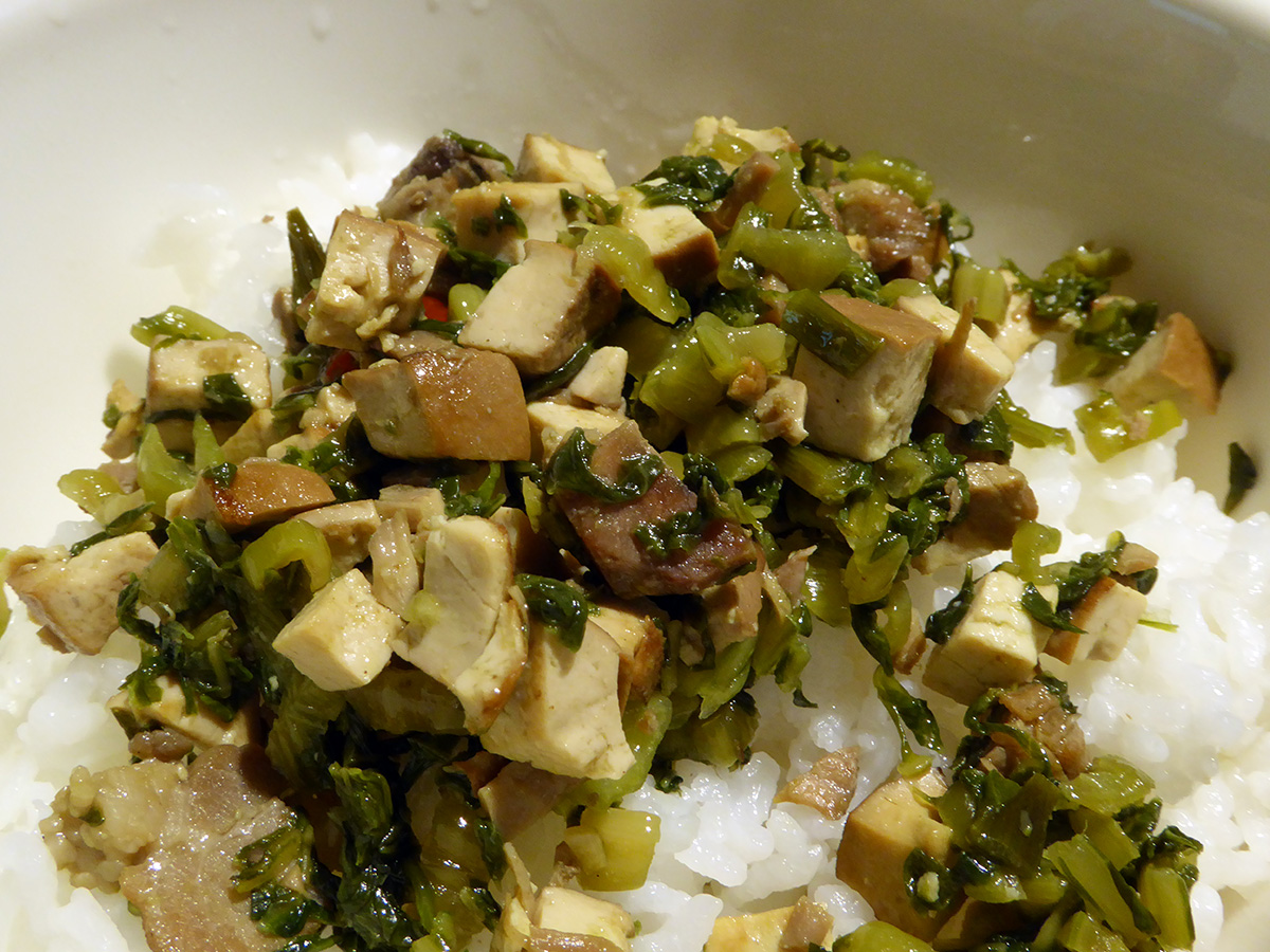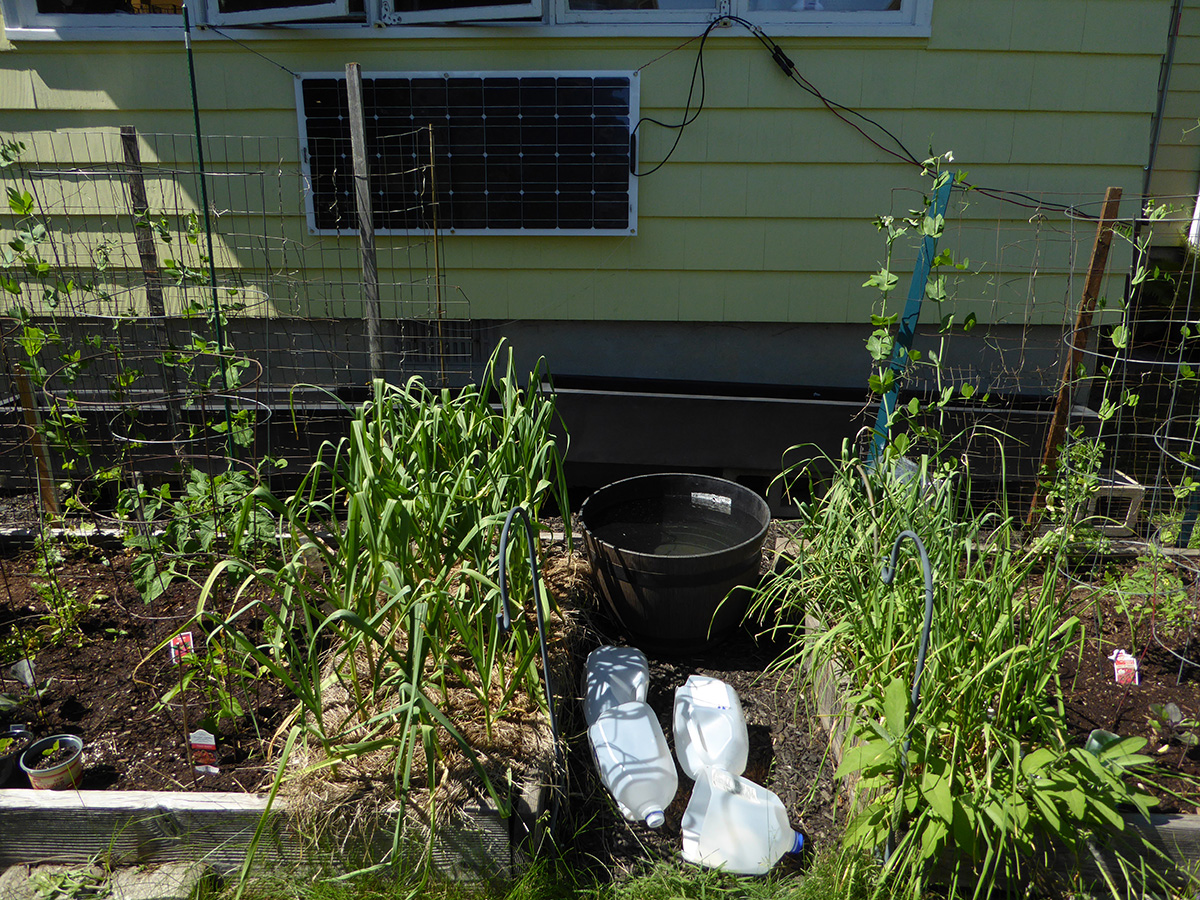 white sugar snap pea flowers have formed, but the weather is getting warmer, and peas like it colder, so we'll see how many peas we can get. there are also fragrant peas but they seem stunted. a few hyacinth beans hide within their midst as well. cucumber seedlings have also sprouted, as well as bottle gourds. the potted gardenia has completely defoliated but remarkably tiny leaves are starting to reemerge from the bare branches. with a sharp alcohol-sanitized knife i pruned off some lower branches on the tomato and pepper plants. my father spotted a stray bamboo shoot and we quickly dug it up. finally, i spotted some bird droppings on our solar panels so i climbed a ladder with the garden hose and washed them off.