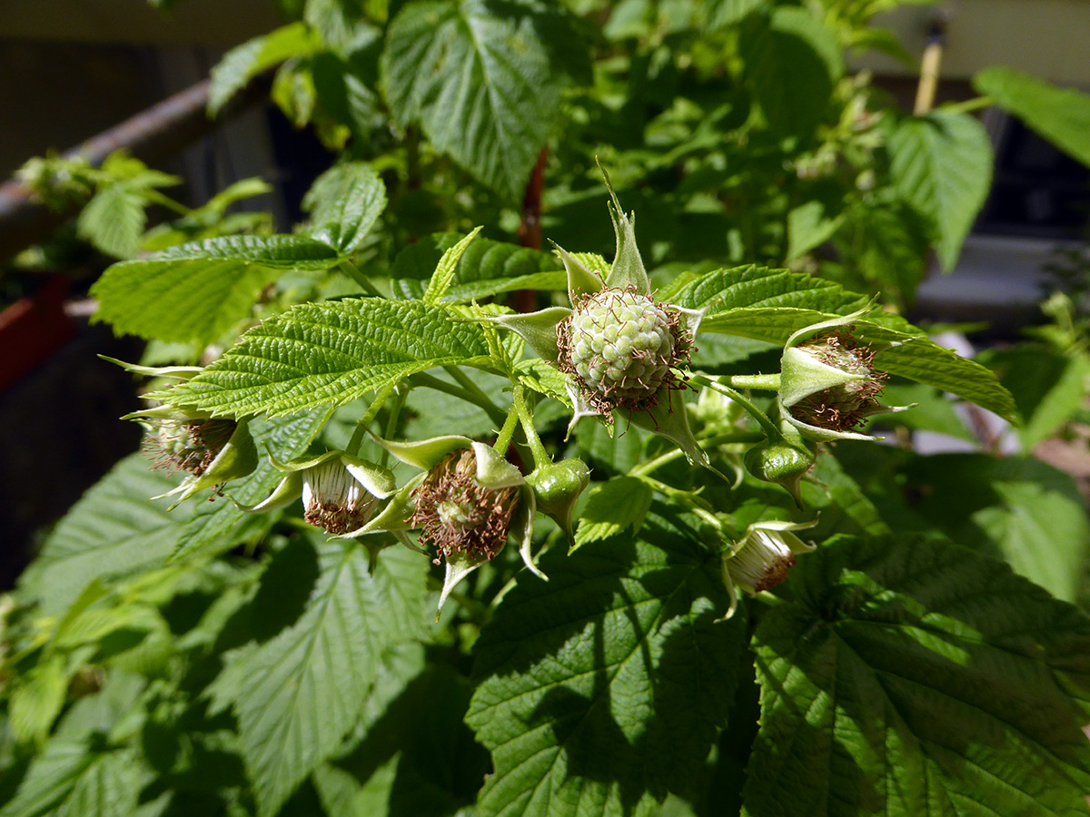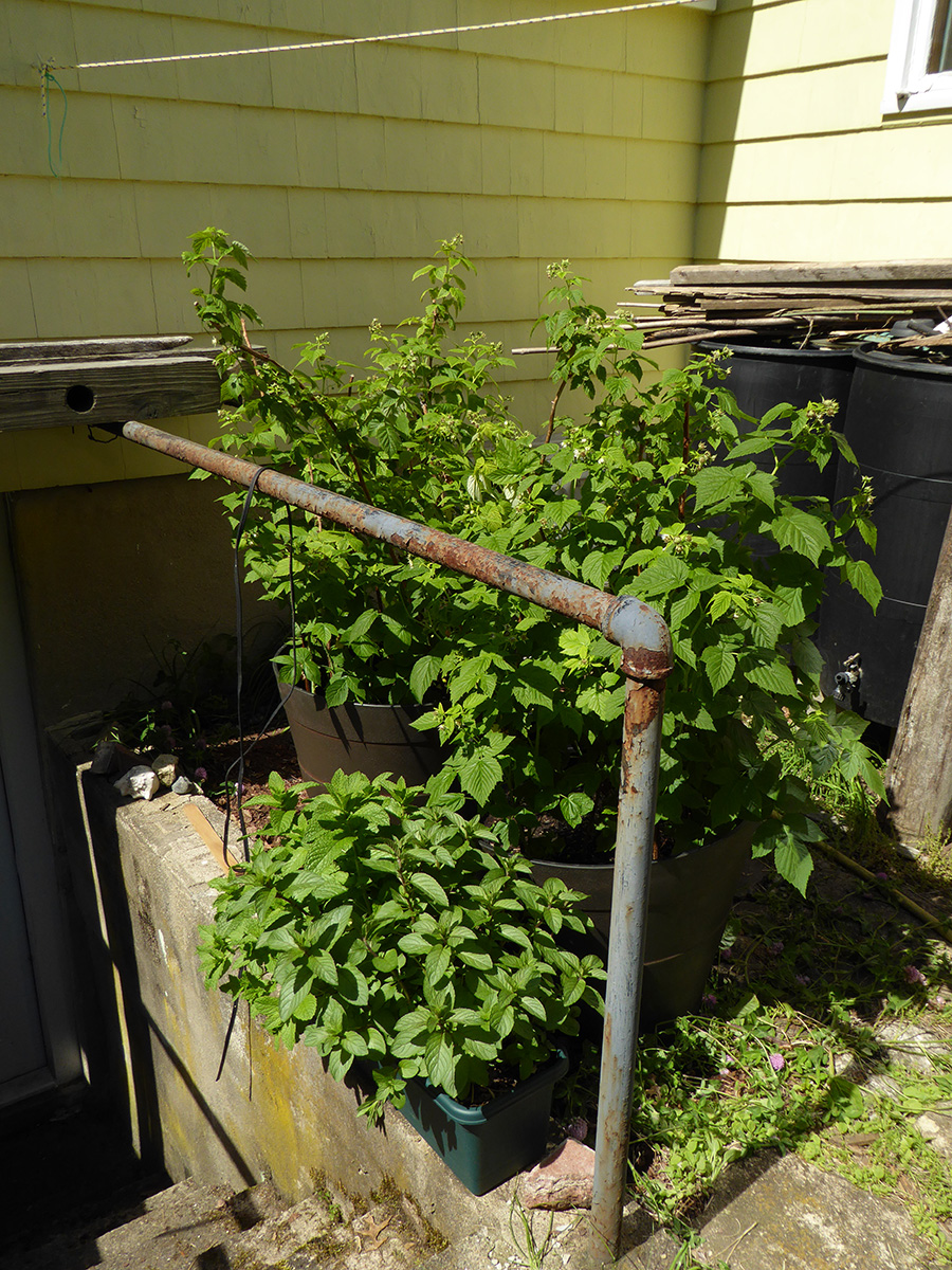 we also moved the two large potted raspberries to the western side of the sunroom, by the basement entrance. this is actually a much better place for these raspberries since we noticed the leaves on the side facing the house (instead of facing south) were stunted. moving them to a more open spot will give them better sun exposure.