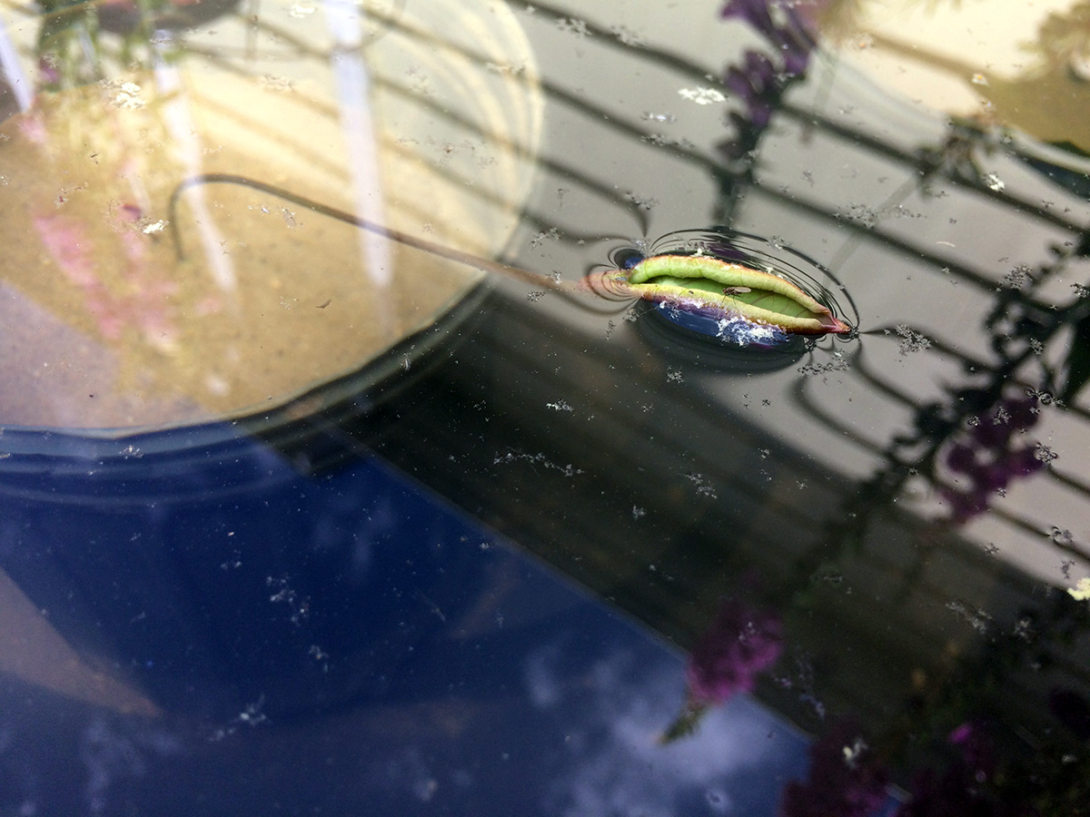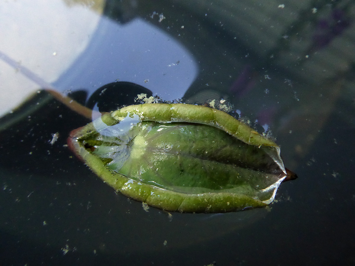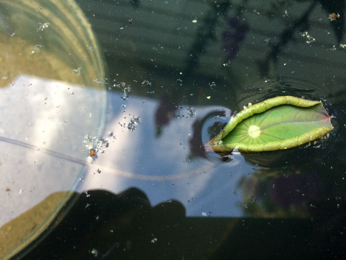 where the lotus barrel is now, behind the garage, it takes about 11:30am before it gets any sun, and lasts until 4:30pm or so. is it getting enough sunshine? none of that will matter since we're planning on relocating it to a spot between raised beds 2 and 3, directly facing south where it can get the maximum amount of daylight. the coin leaves are still closed, but the lotus with the longer stem was finally beginning to open up its leaf, slowly unfurling. hopefully by tomorrow it will be completely open.