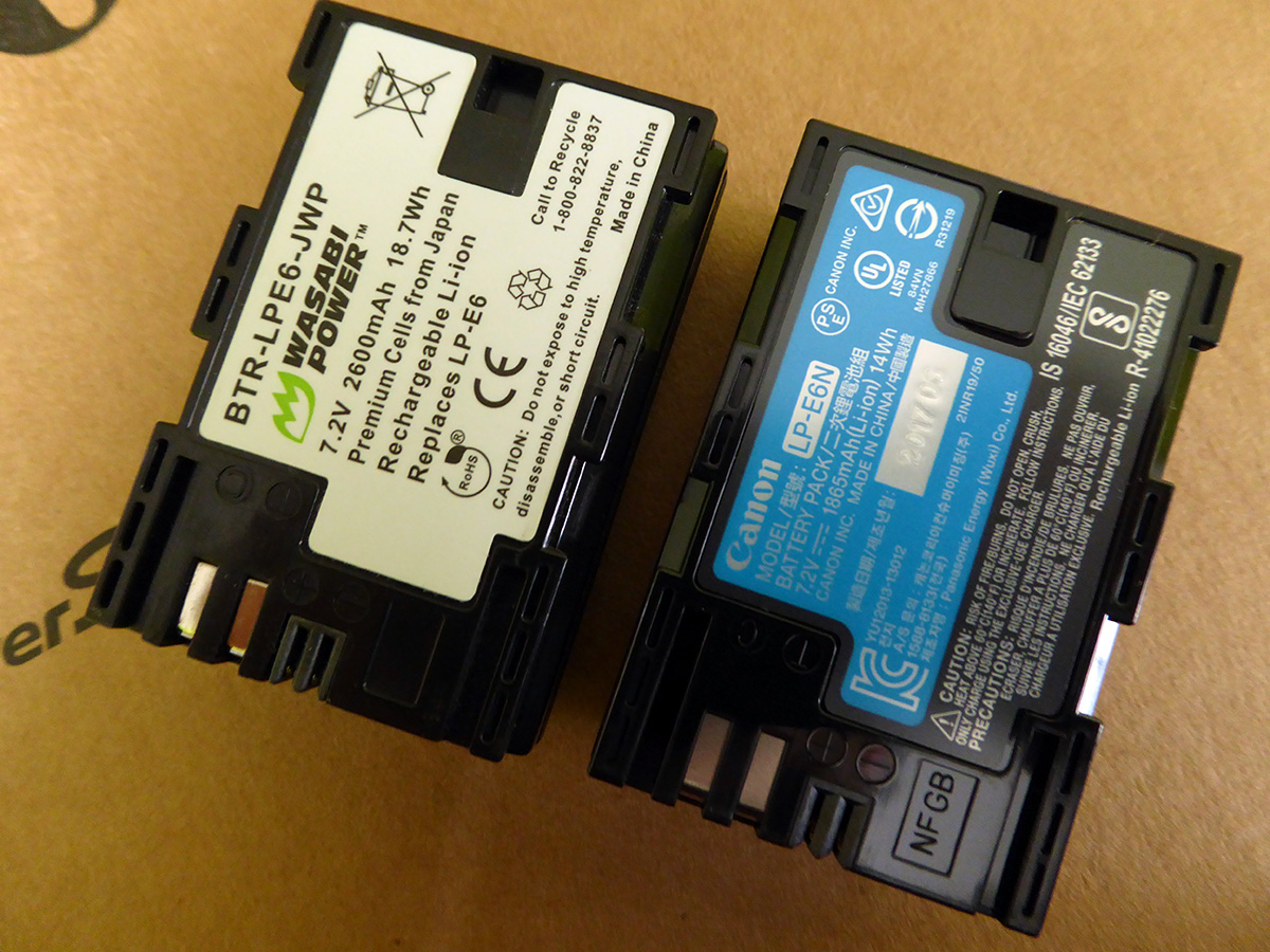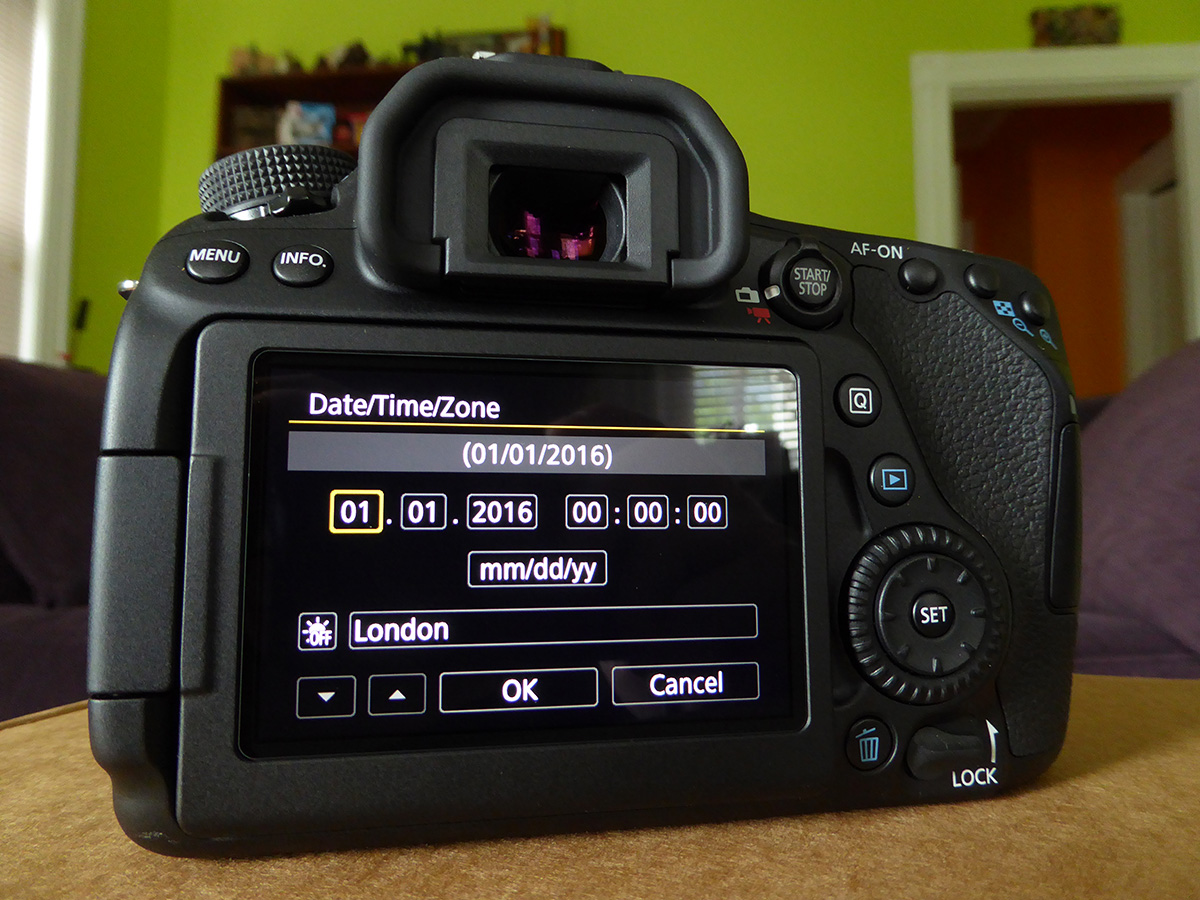 even though this was refurbished equipment, i couldn't tell the difference. i tried looking for signs of usage, but there was none. everything was pristine, everything seemed brand new, even had that new equipment smell. i attached the kit lens (also light-weight which gave it a cheap quality) and put in the included battery. the camera didn't turn on. i then put it one of my spare batteries (wasabi power BTR-LPE6-JWP), which has a lot more juice than the canon LP-E6N battery - 7.2V 2600mAh 18.7Wh versus 7.2V 1865mAh 14Wh. a few things happened: the camera turned on, but i got a screen asking if i was using an actual canon-branded battery. when i answered no, i was afraid it wouldn't allow me to continue, but it just gave me a warning saying it wasn't responsible for 3rd party battery damages. then it put me on the date-time screen. i waited too long trying to find my phone (so i could get the official atomic time), and the screen disappeared. when i woke the camera back up, it just threw me into the regular menu screen, so i had to manually navigate back to the date-time screen to make the correct settings.