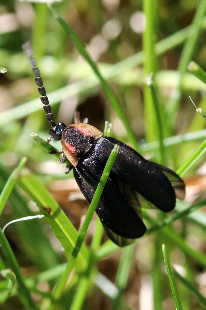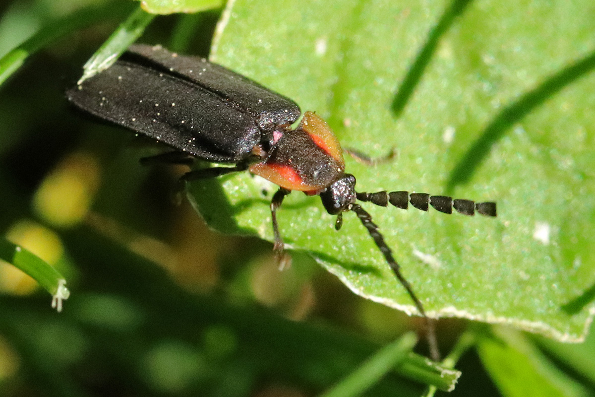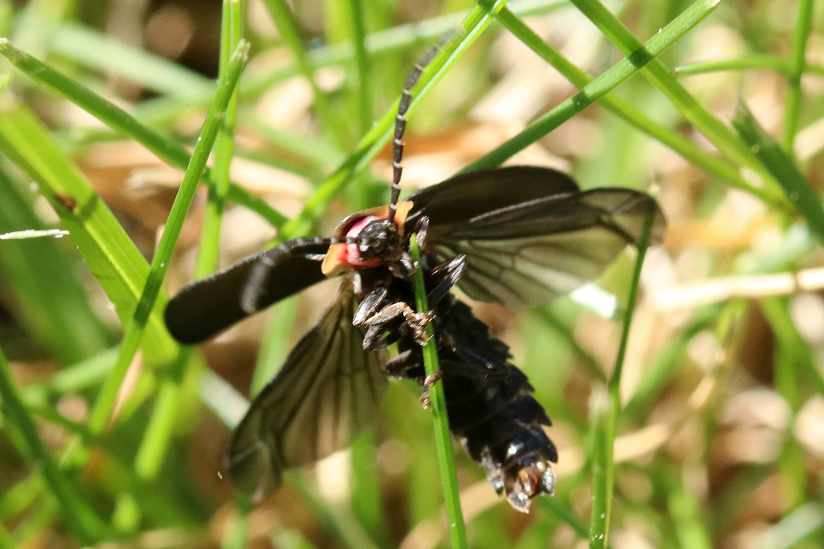 my father was outside enjoying the weather but came to get me to check out some bugs he saw outside. originally he thought they were cockroaches, and even killed one a few days ago when it came into the house. they were in fact fireflies congregating on the lawn besides the maple tree. why there were so many i don't know, if i had to guess maybe they'd all just hatched. i tried to take some photos with my fancy new camera with the fast focus but even that was no match to the fluttering non-stop flights of these insects. i'd known about fireflies for a while now, but whenever i turn one over, i never see the glow section on their abdomen. the only time i've ever seen fireflies was back in high school, playing laser tag with friends around claypit pond. besides mosquitoes, there were also the tell-tale soft eerie glow of fireflies. [correction: the reason why i've never seen the glowing tail section of these fireflies is because these are daytime fireflies - Lucidota atra AKA black fireflies - that don't have bioluminescence as adults].
