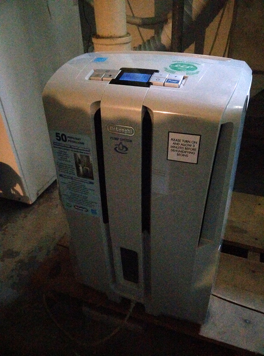 my mother wanted my father and i to checked the basement delonghi dehumidifier (DD50PSC), she said it wasn't working because she hadn't noticed any water coming out of the pump tube in a while now. turns out the pump just wasn't turned on. the moment i hit the pump button, i could see air bubbles in the clear vinyl tubing then finally water coming out. i also attached a smart plug to the dehumidifier so we could 1) control it remotely and 2) get a power consumption readout. my father was thinking about installing one of our many AC's in one of the basement window, because an AC can function as a more efficient dehumidifier. unfortunately the daewoo DWC-055RL we have in the basement is missing the window shutter frame attachments.