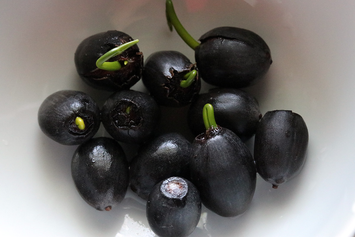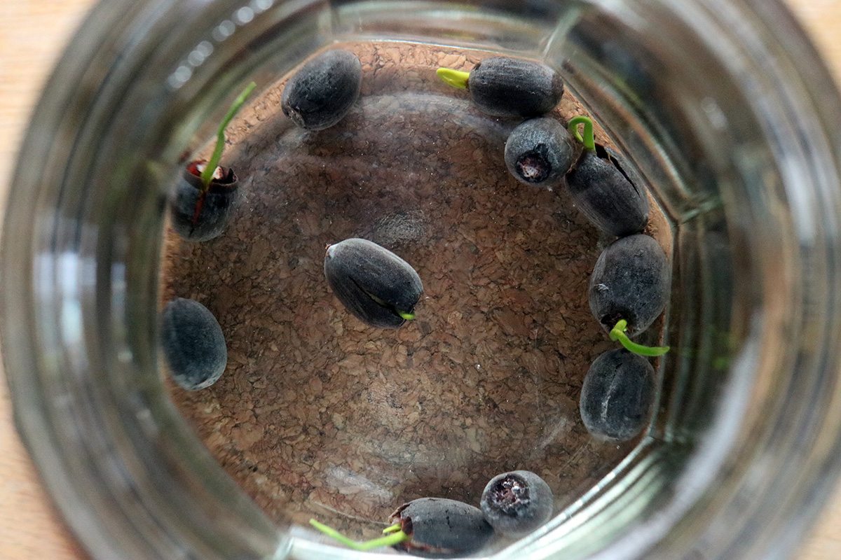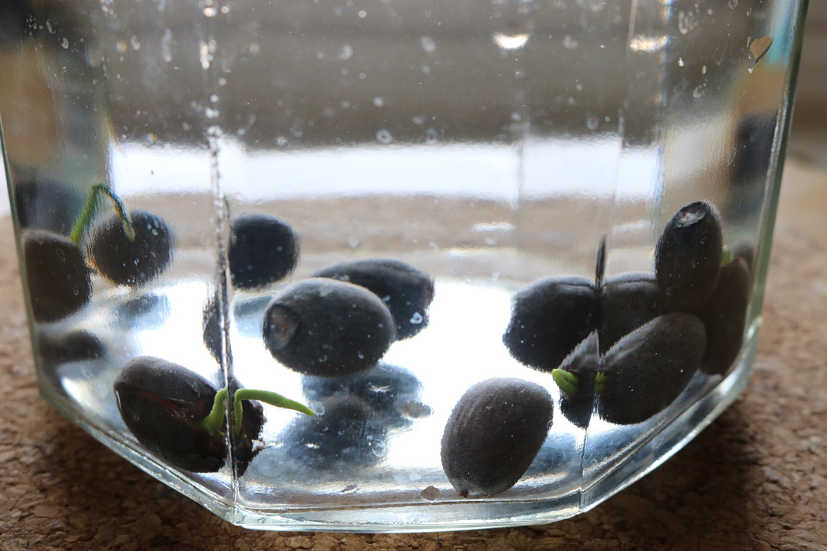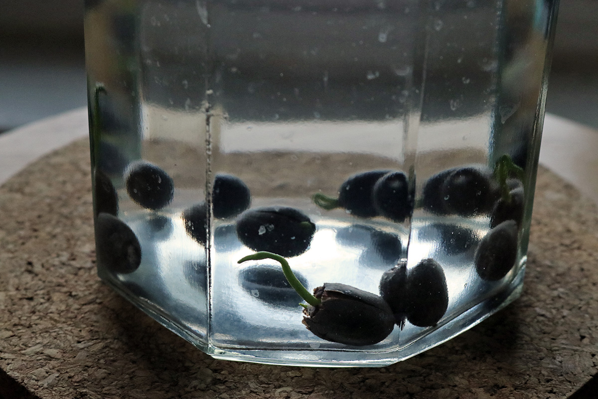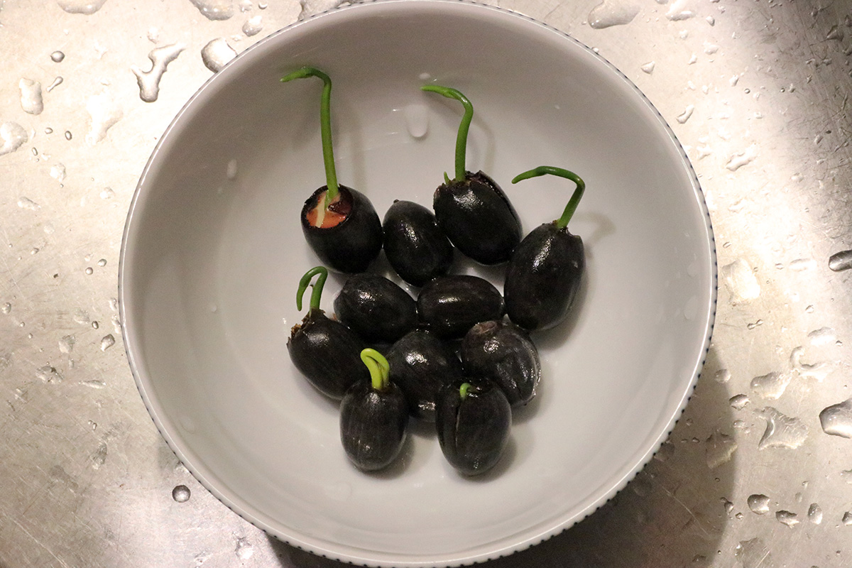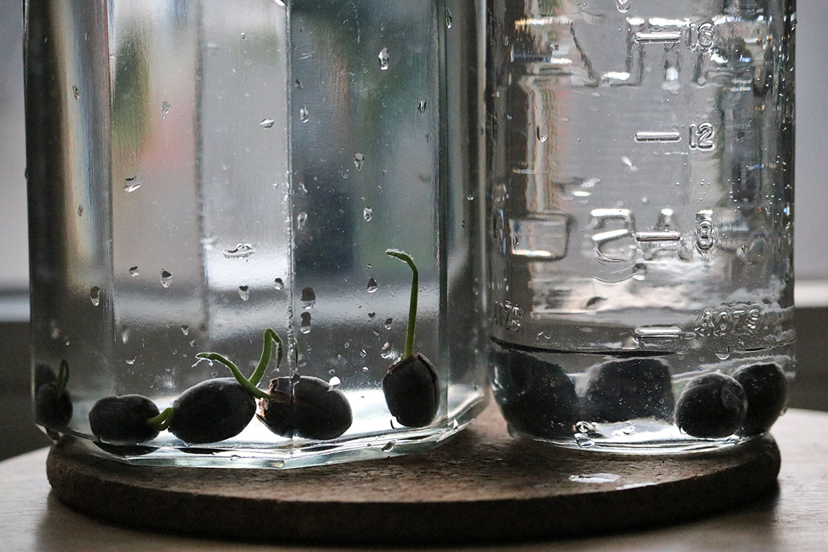 one of the things i look forward to when coming back home is seeing the progress of my lotus seeds. the 6 germinated seeds have grown longer, the 5 non-germinated seeds remain inactive. two of the germinating seeds look like their sprouts are barely squeezing out of the seeds, while 3 others look like the seeds had burst open. then there's one seed with a sprout that seems to be struggling to get out, but there's a large seam down the side so i'm optimistic it'll find a way to break through. based on my father's advice, i ended up separating the germinated seeds from the non-germinated seeds, so the rotting seeds don't contaminate the living seeds.