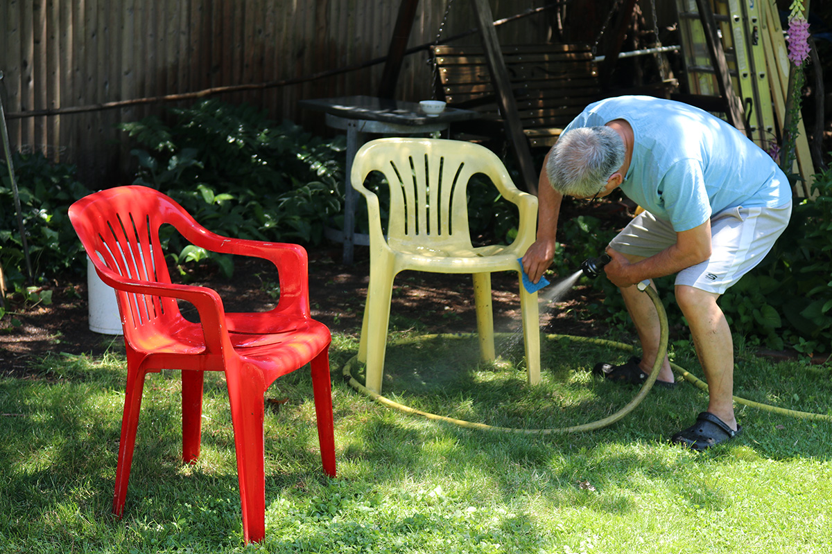 after a shower, i took the motorcycle to my parents' place a bit before 11am. today was even warmer and drier, with some wispy clouds in the sky but mostly sun, an optimal day for solar production. i found my mother doing some laundry (taking advantage of the free electricity), hanging up the wash on our makeshift shepherd's pole clothesline. she also hung up some blankets to deodorize in the sun. my father was cleaning up the area around the wooden swing chair and later washed all the lawn furnitures.