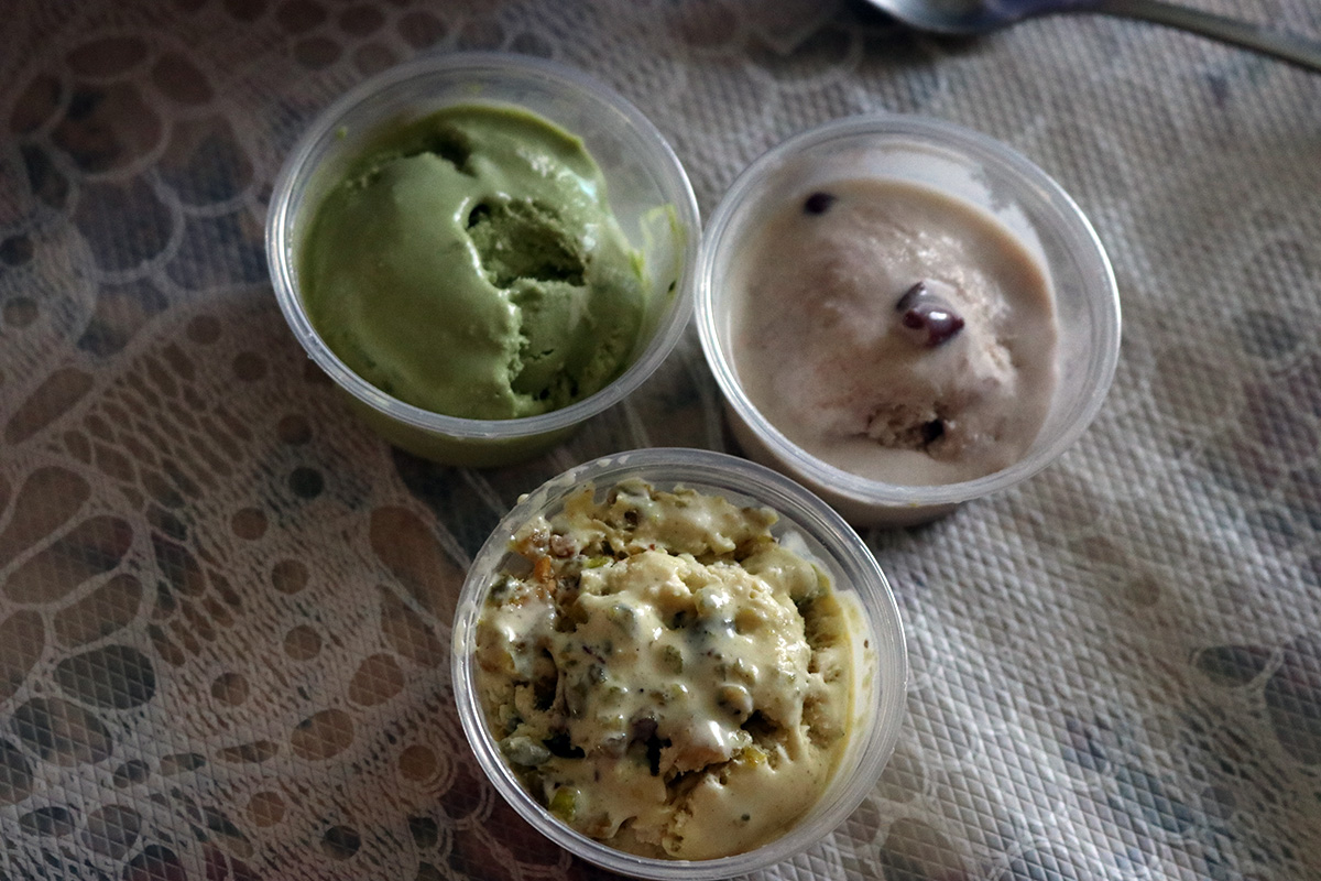 i had chinese chive boxes (éŸèœç›’å) for lunch while watching the world cup match between england and cameroon. the english were the odds favorite to win. cameroon managed to score twice but both times were negated by penalties. england ended up winning 3-0. later i had a slice of green tea honey cake. in the afternoon my sister stopped by with her homemade ice cream which she's been asking for us to try all week long: green tea, adzuki bean, and pistachio. she wants to sell them at the cafe but the cost of ingredients (especially the pistachio ice cream, which was half pistachios) might be prohibitive. she said she didn't use a machine, just heavy cream and condensed milk. i'm no stranger to sweets but even i draw the line on condensed milk, that stuff is just too sweet.
