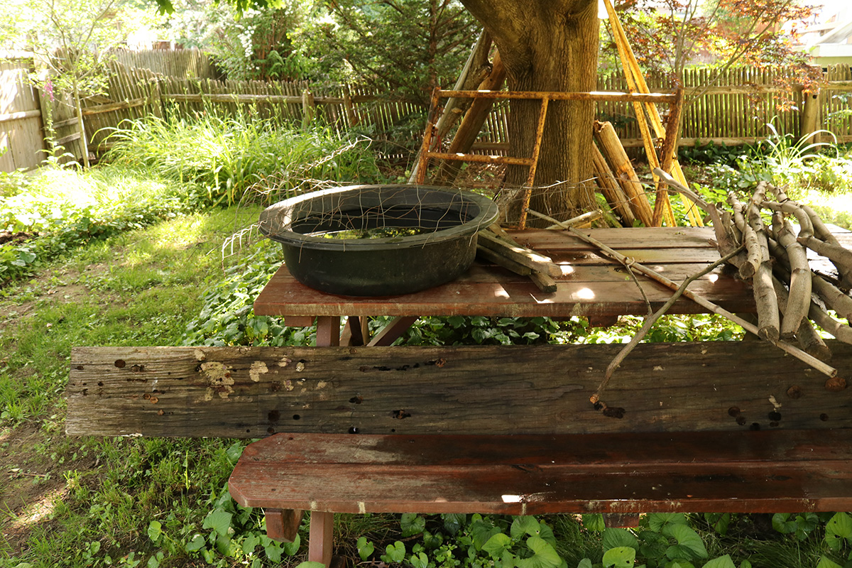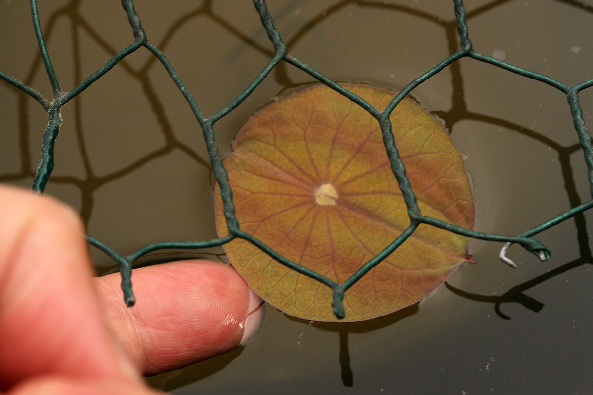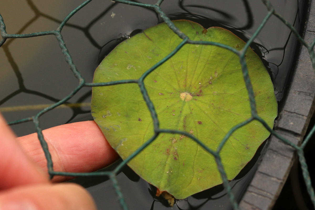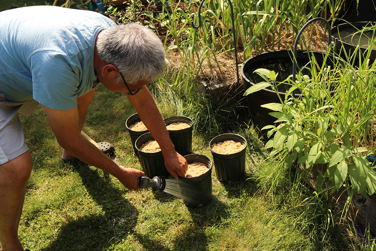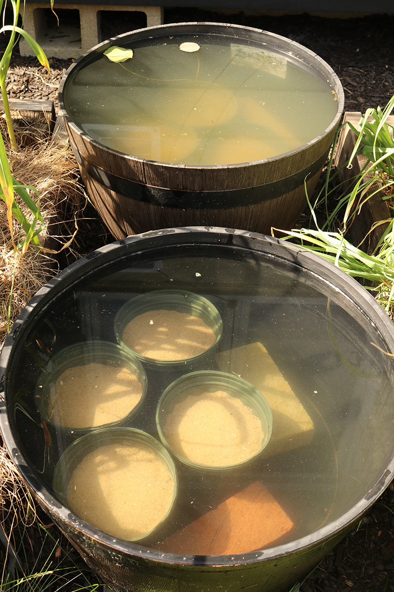 the OSJL wine barrel can fit 7 pots but we decided to split them between the 2 barrels to give them more growing room: 3 pots in the deeper barrel (there was already 2 pots, one with the only surviving lotus plant from the first batch of seeds, we can only fit 3 pots), 4 pots in the wider (OSJL) barrel. we submerged some bricks to put the pots in place and prevent them from tipping over.