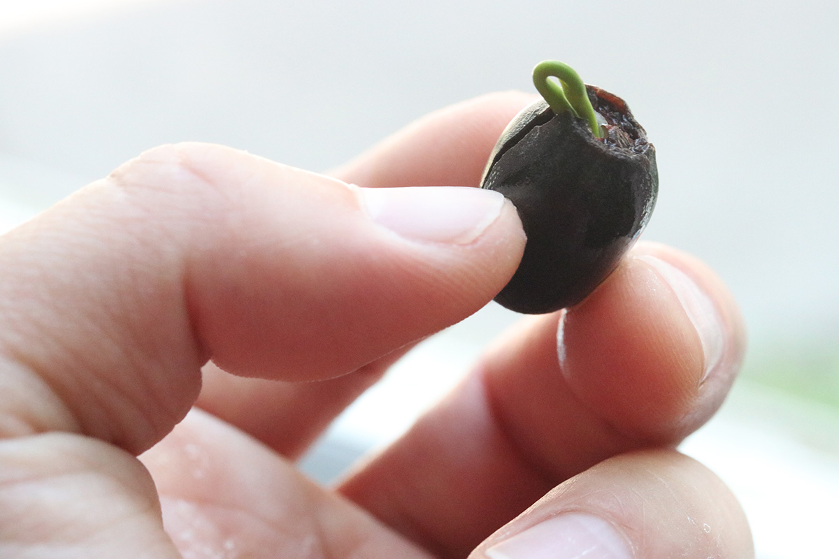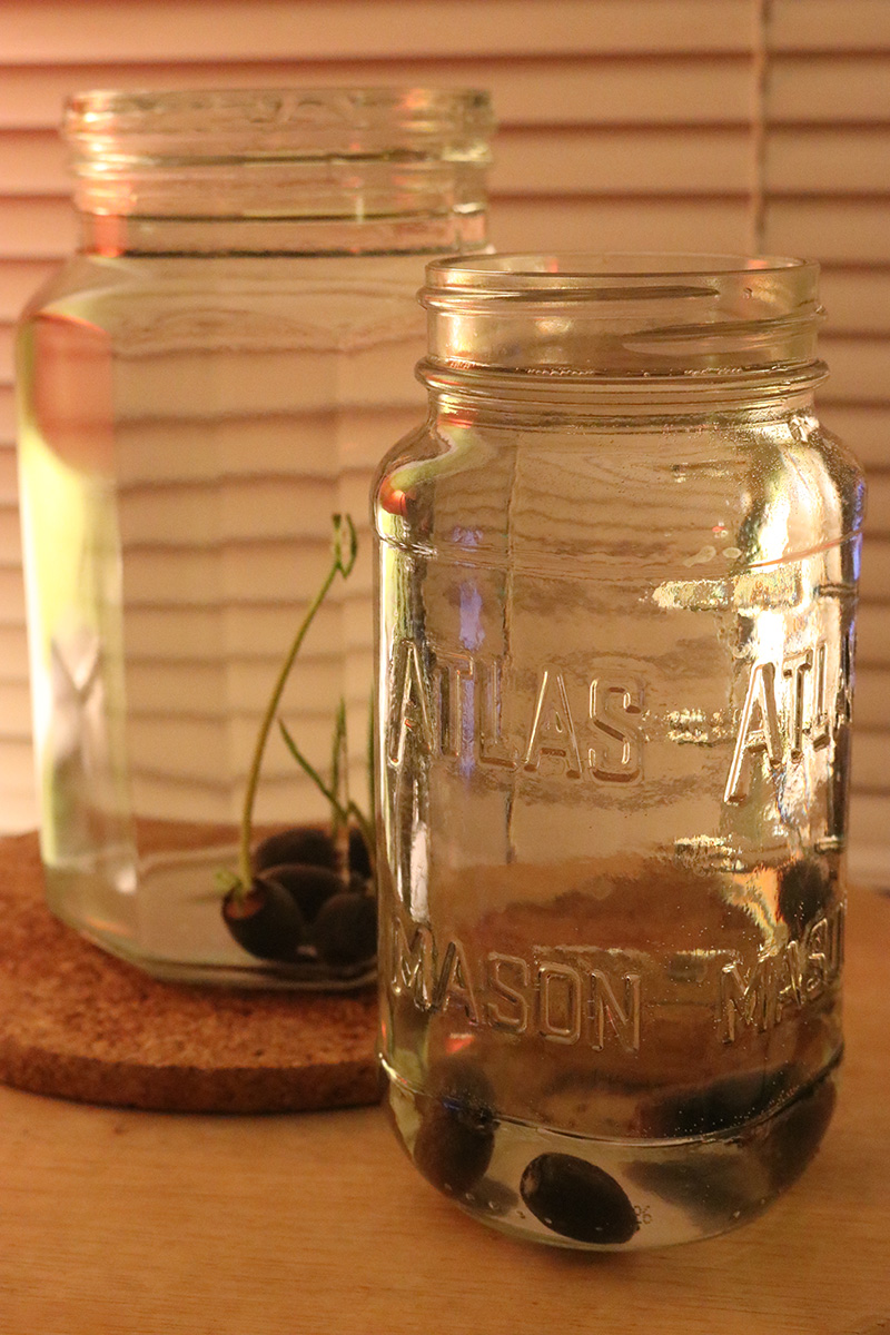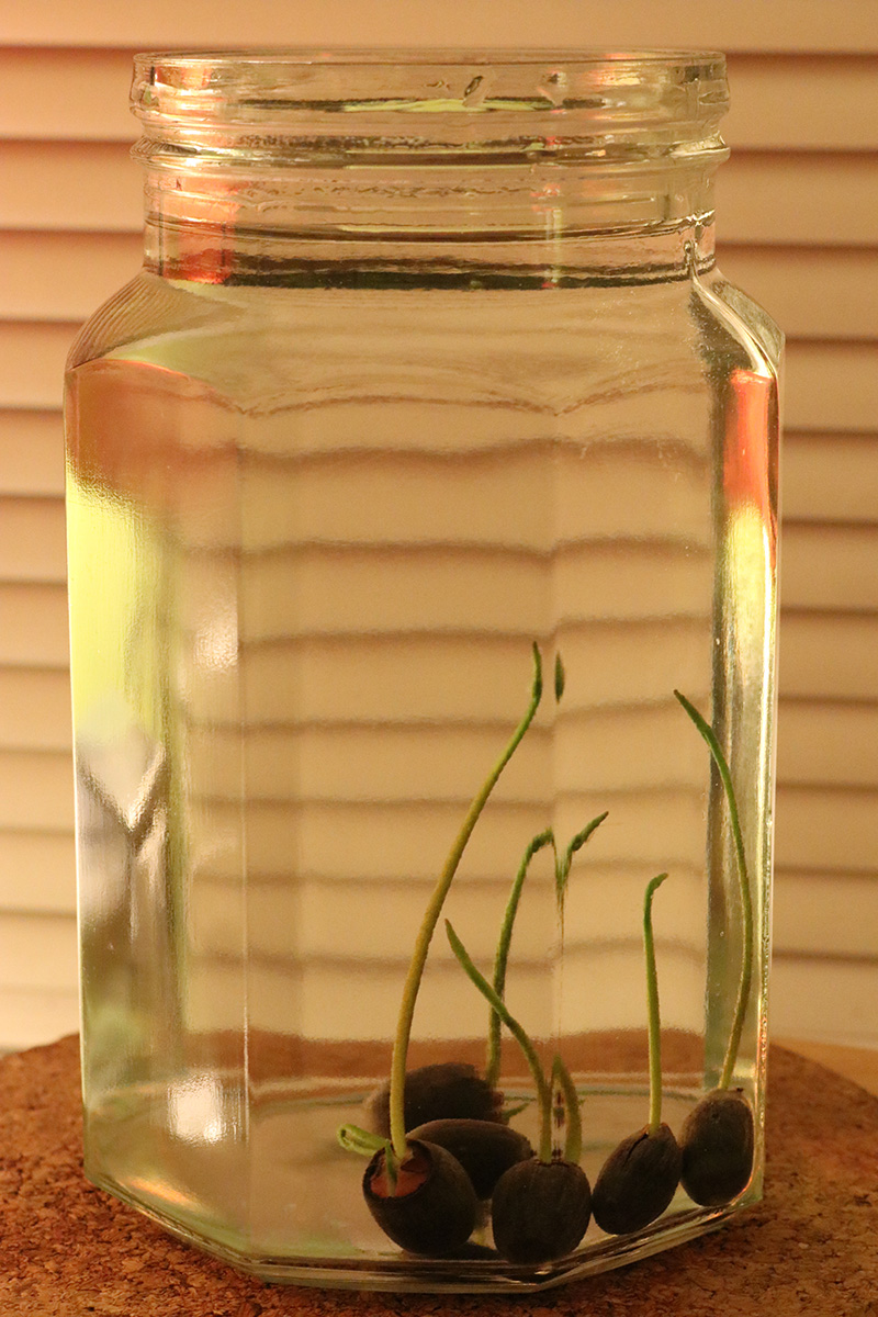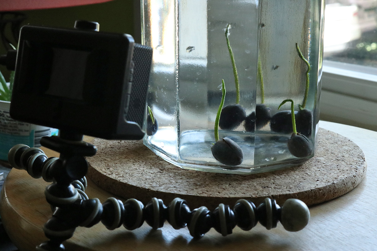 i was eager to get home to check out the latest growing lotus time lapse video. annie wasn't home yet, which was a surprise. besides the lotus stems getting longer, i noticed something else in the video: in the backyard is my jar of nonviable seeds, but one of the seeds seemed to be moving around a bit.