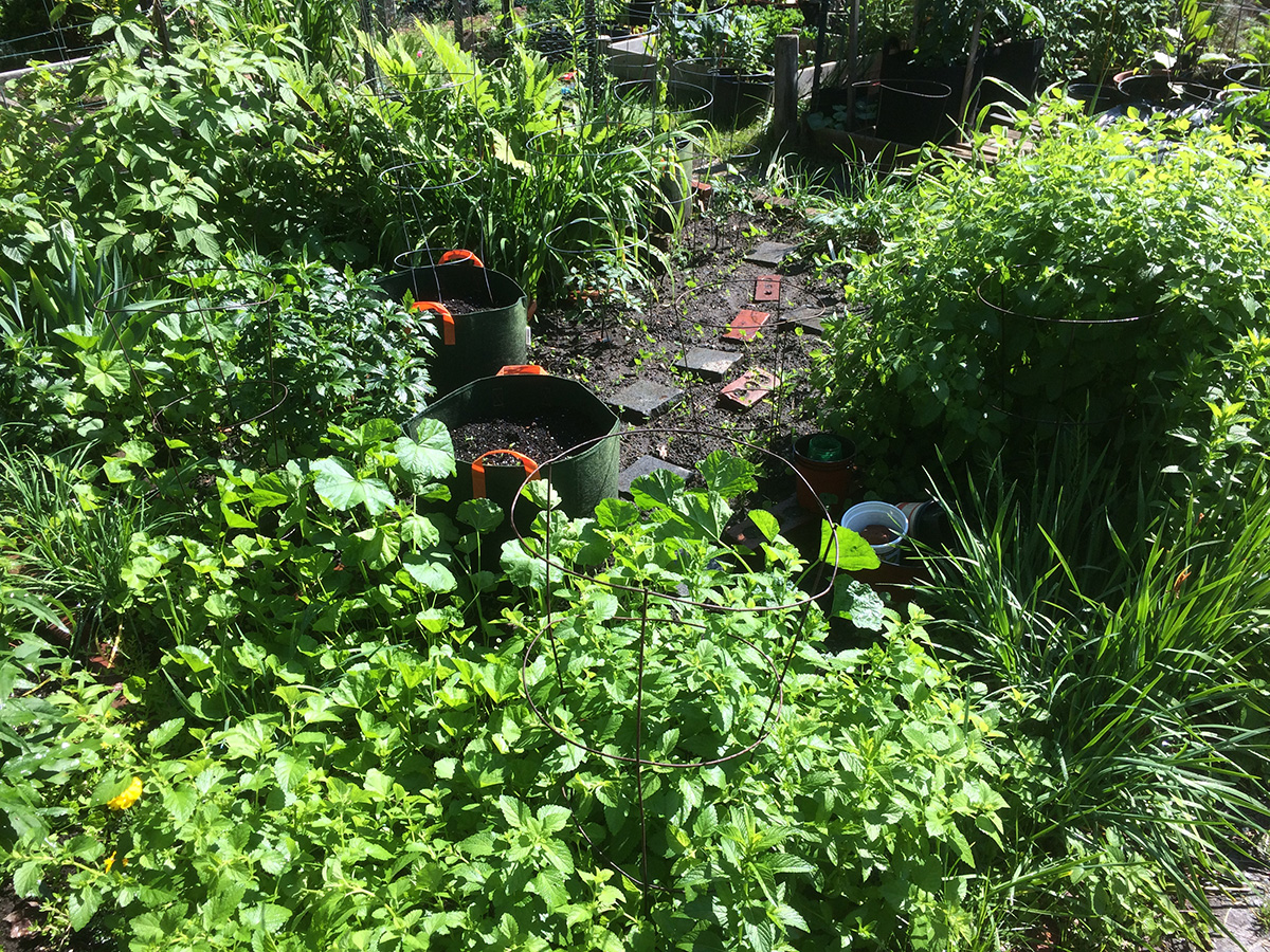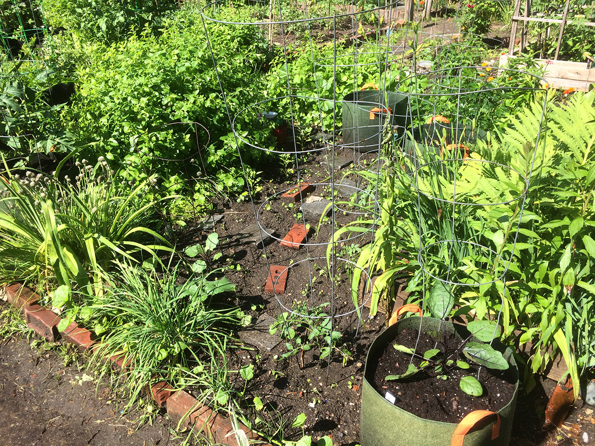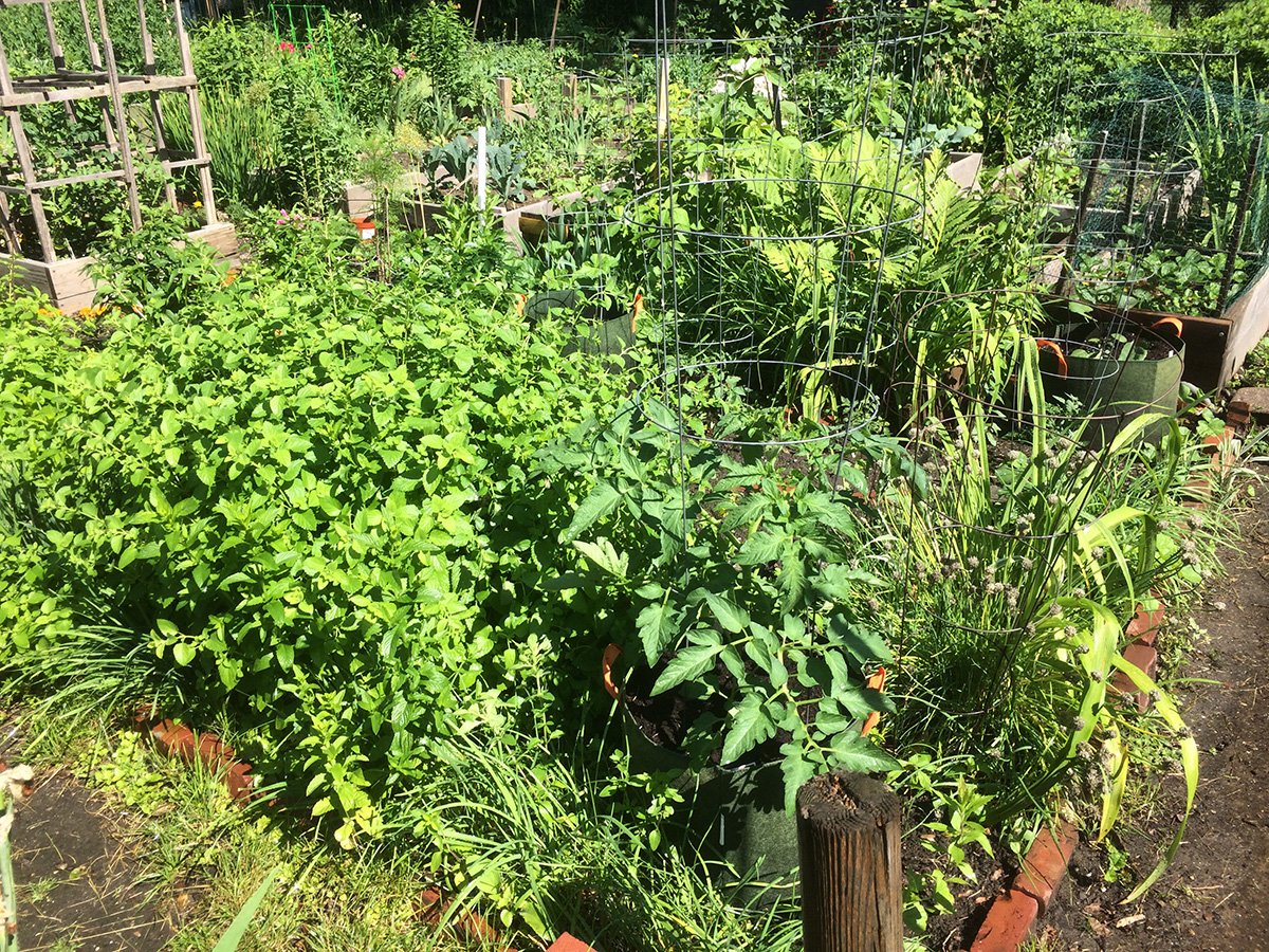 that lemon balm + chive bush, i should've gotten rid of it early in the season. for now it's taken over a large chunk of my plot, and up front too, so it blocks the sunlight of the smaller seedlings growing behind it. fortunately the summer sun is high up in the air, so it's not too bad. a lot of striped mallow seedlings all over my plot. some milkweeds have escaped into the plot next to mine, i want to contact the owner to ask them if they want me to weed it out for them.