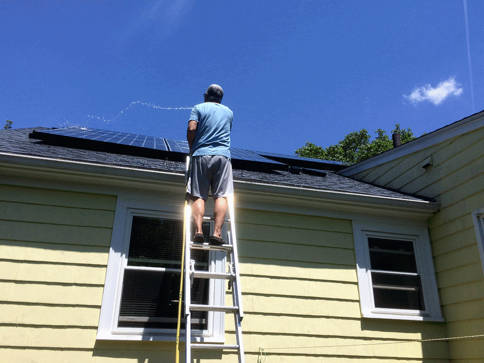 the first thing i did when i arrived in belmont was to get the ladder and climb the roof so i could spray the solar panels. today was a perfect day for solar production, but i noticed the numbers were slightly off-peak, and wondered if it wasn't because of pollen dust on the collectors. there was only a very light layer, and most likely would've washed off on its own from the rain forecasted for tomorrow, but i decided to spray the panels anyway, cleaned off a few bird droppings as well.