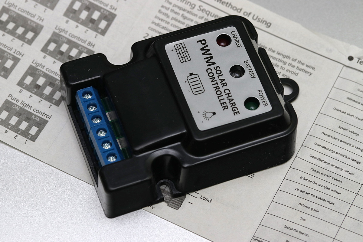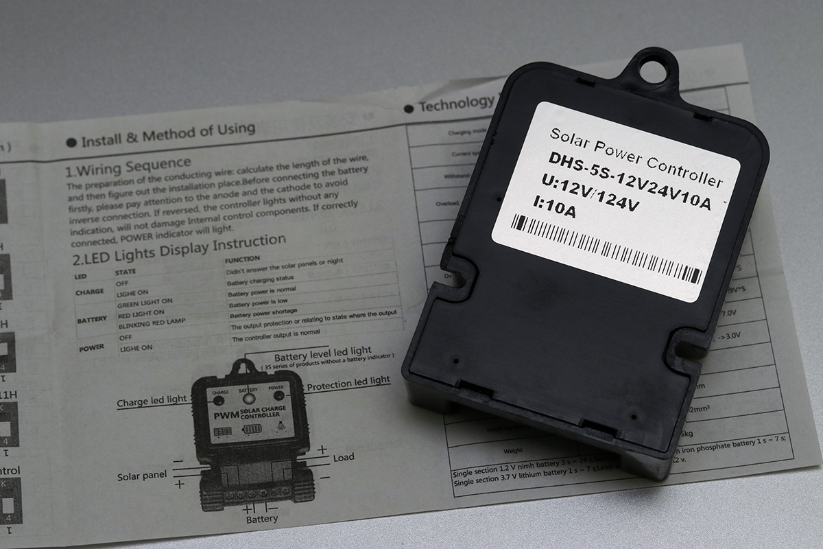 the tiny 10A solar power controller arrived in the mail today. it's actually robust enough to sustain our 100W flexible solar panel, it'll be good for some future solar projects. instead of a digital display it just has 3 LED's to provide status information, but that's all you really need. the LCD display is only fun when you first get the controller, but once you have everything set up, you rarely ever need to see the LCD.