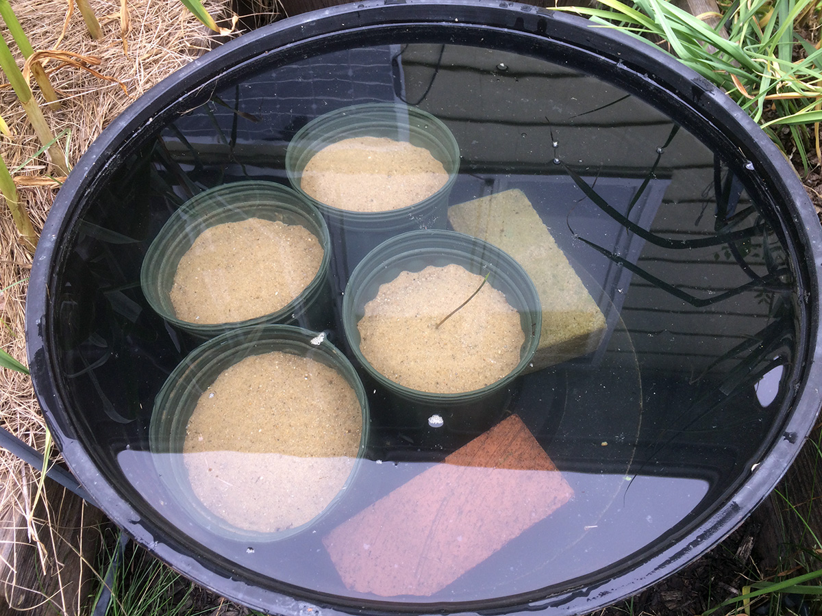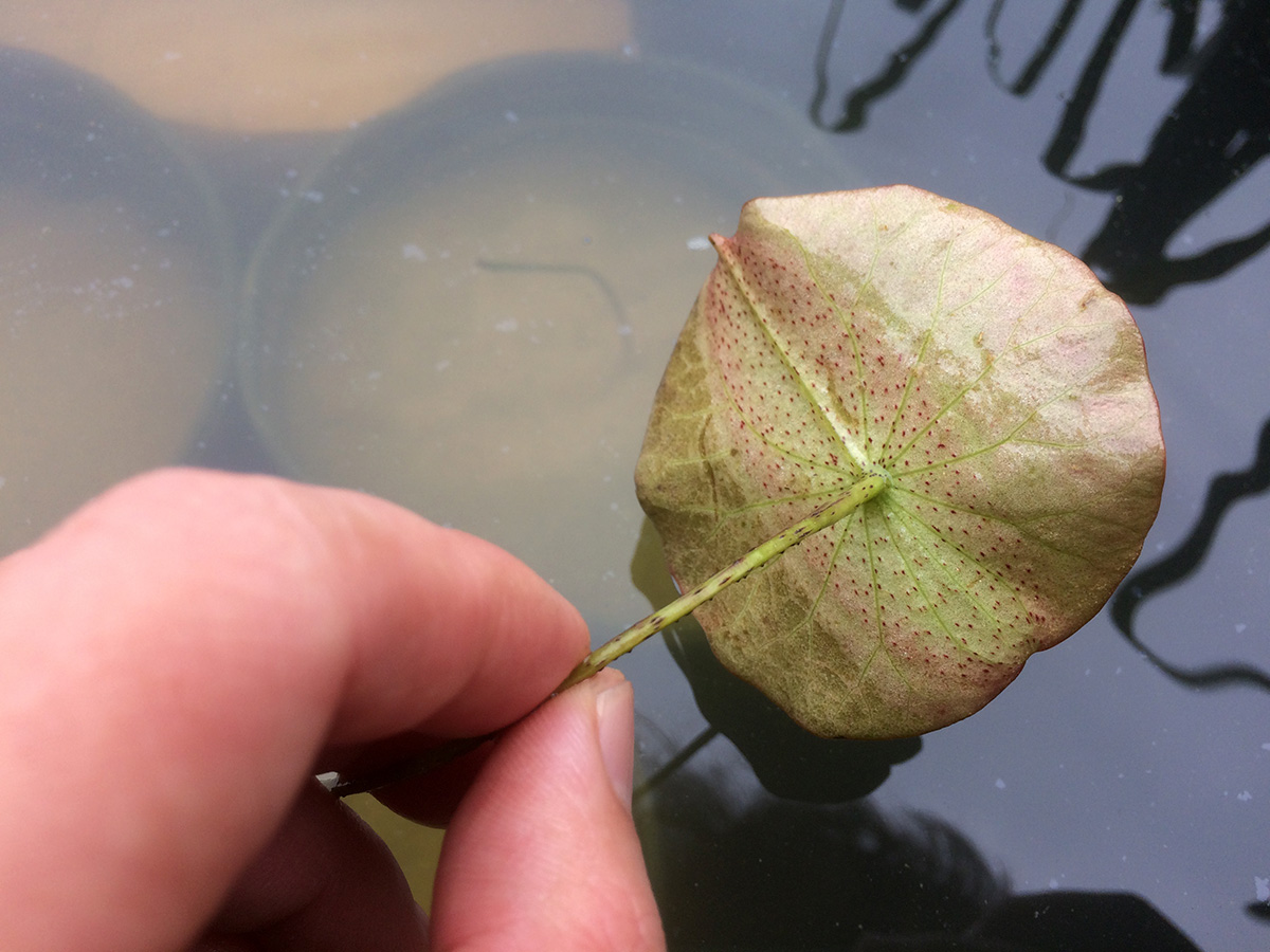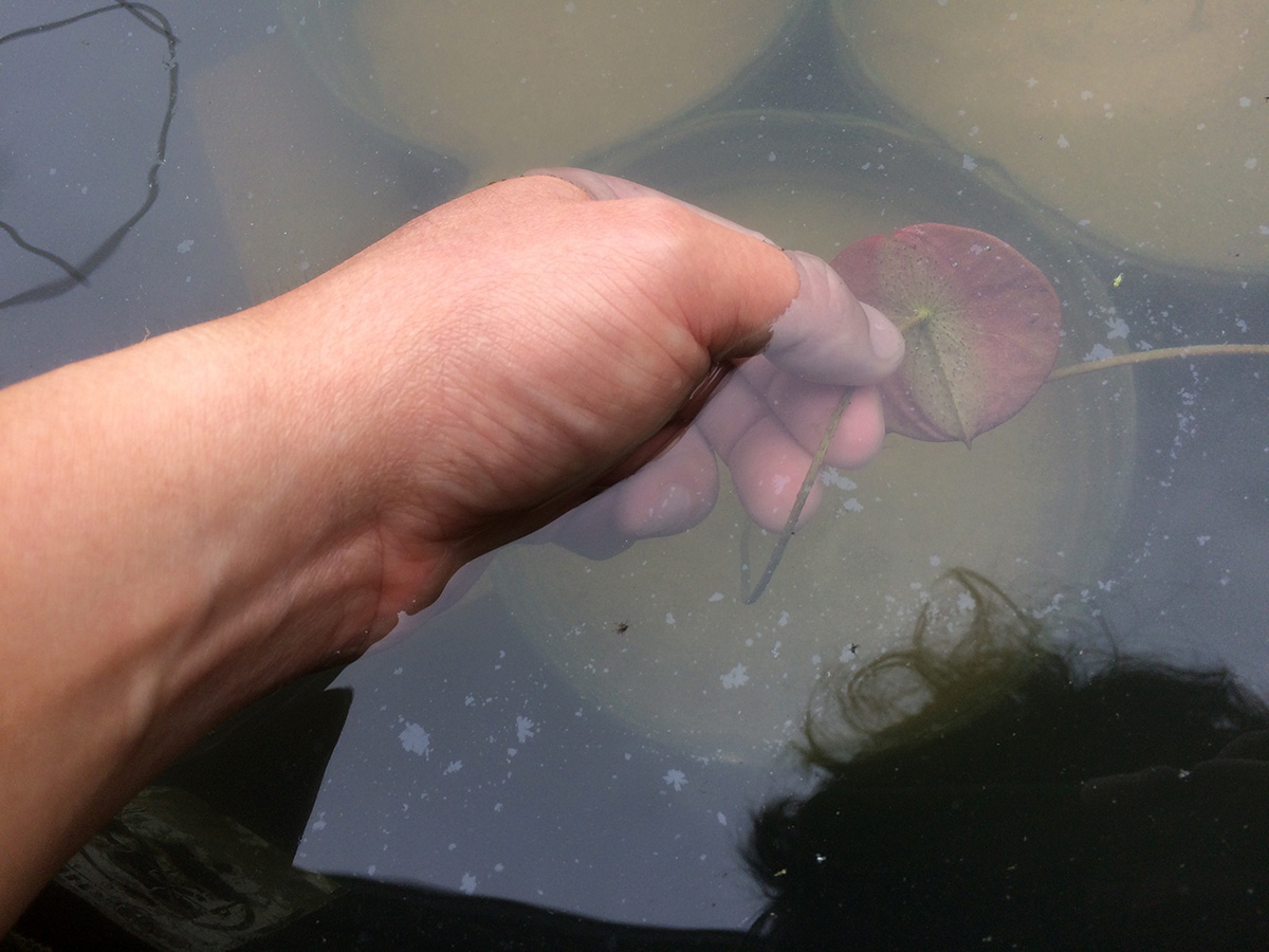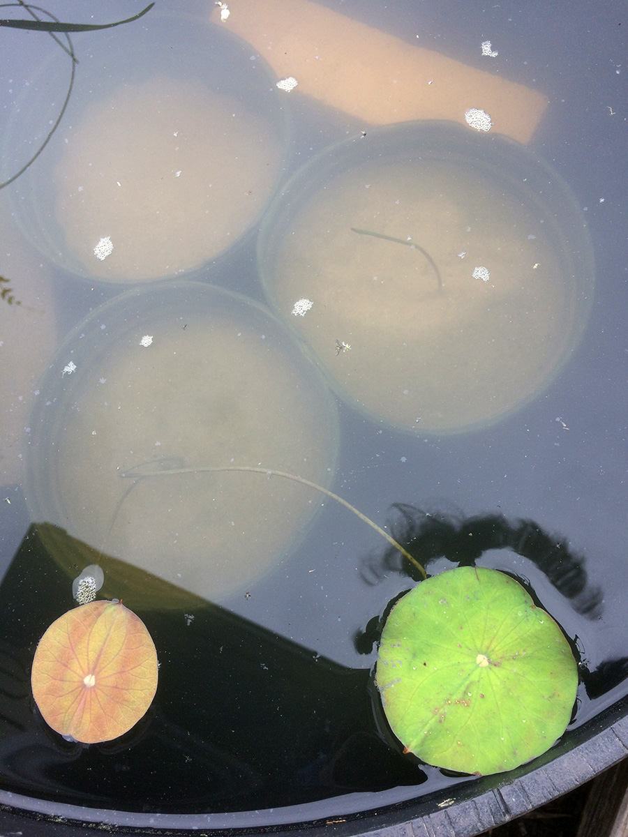 arriving in belmont, i planted one seedling in the deep barrel while the other seedling in the wide barrel. the lotus seedlings still need to grow a few more inches before they can break free from the water surface. i didn't plant them too deep, about halfway in the sand so that the second coin leaf shoot was poking out of substrate. i also examined the existing lotus leaves. on the underneath is an iron-shaped pattern of red lotus hairs that also matches the hairs on the stems. the green 1st coin lef is also green on the underside, but a more olive green. the underside of the 2nd coin leaf is definitely red, more so than the topside. i also did a partial water change but the deeper lotus barrel still looks murky; the only want to solve that is to drain the barrel completely and refill it.