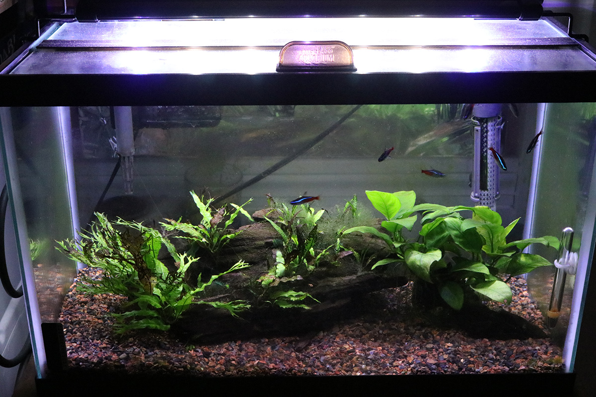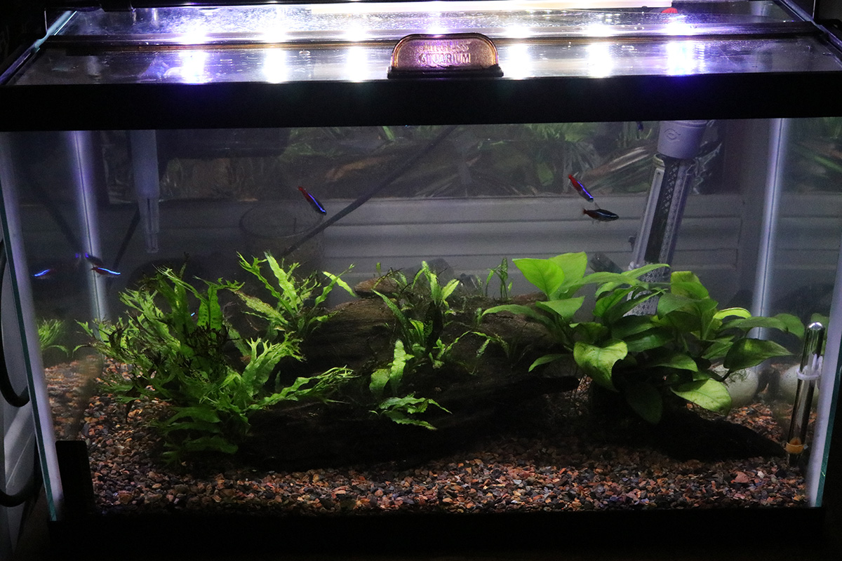 i finally got around to cleaning my aquarium tank. i'd promised myself i'd try to clean it every 2 weeks, to prevent algae from blooming, but i got lazy, and waited almost a month before cleaning again. i cleaned out the filter, adding fresh activated carbon. i didn't uproot the driftwood and associated java ferns, i just pulled off the strands of hair algae by hand.
