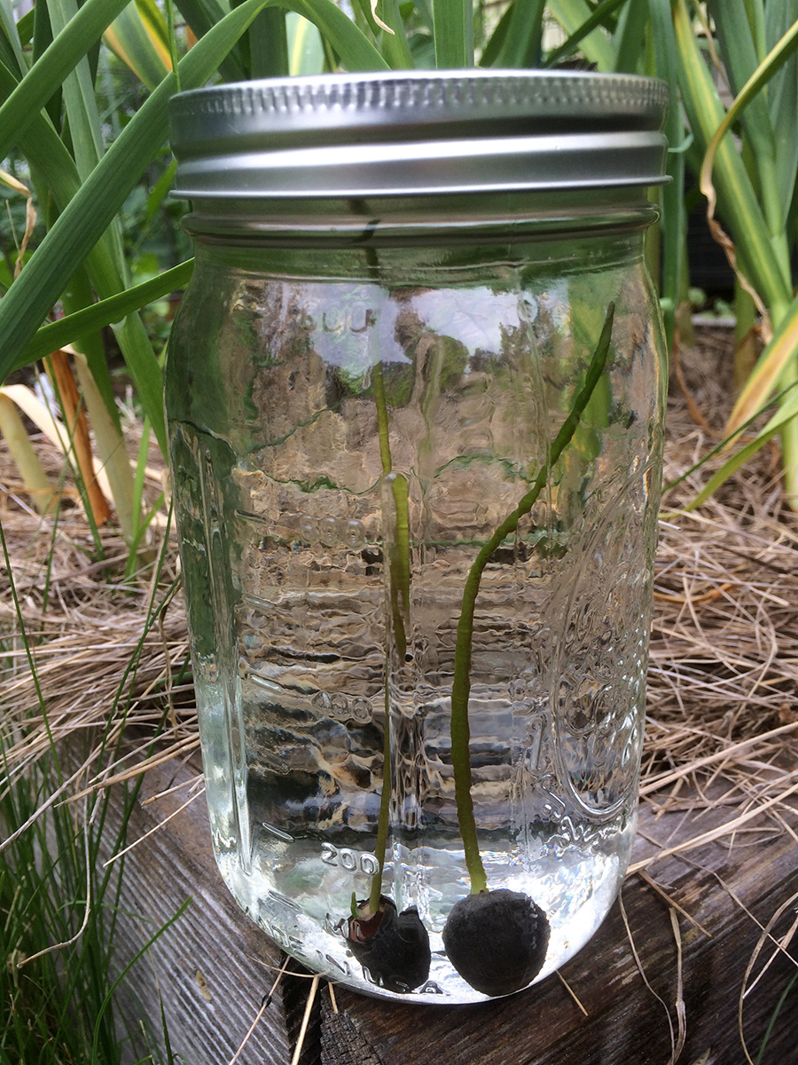 during my routine lotus jar water change, i measured the seedlings, a few of them looking particularly long. measured from the bottom of the seed, one of them was already 6" while another was 5-1/2": these two would have to be planted today, otherwise they'll grow too tall. i ended up transferring the two tall seedlings into a jar with a water tight lid. i filled the inside completely with water so it'll act as a cushion as i rid the bike the belmont to plant them in my lotus barrels.
