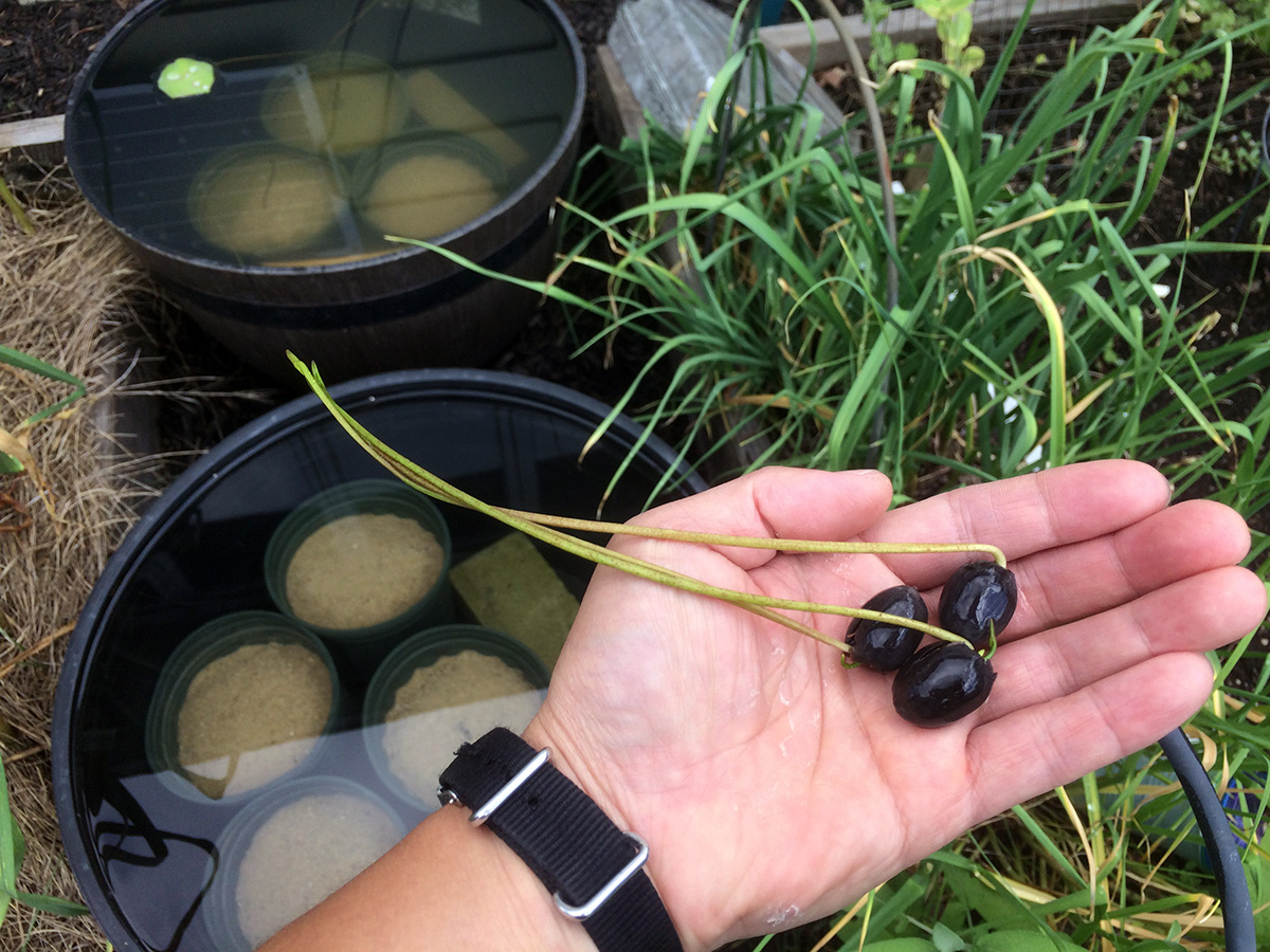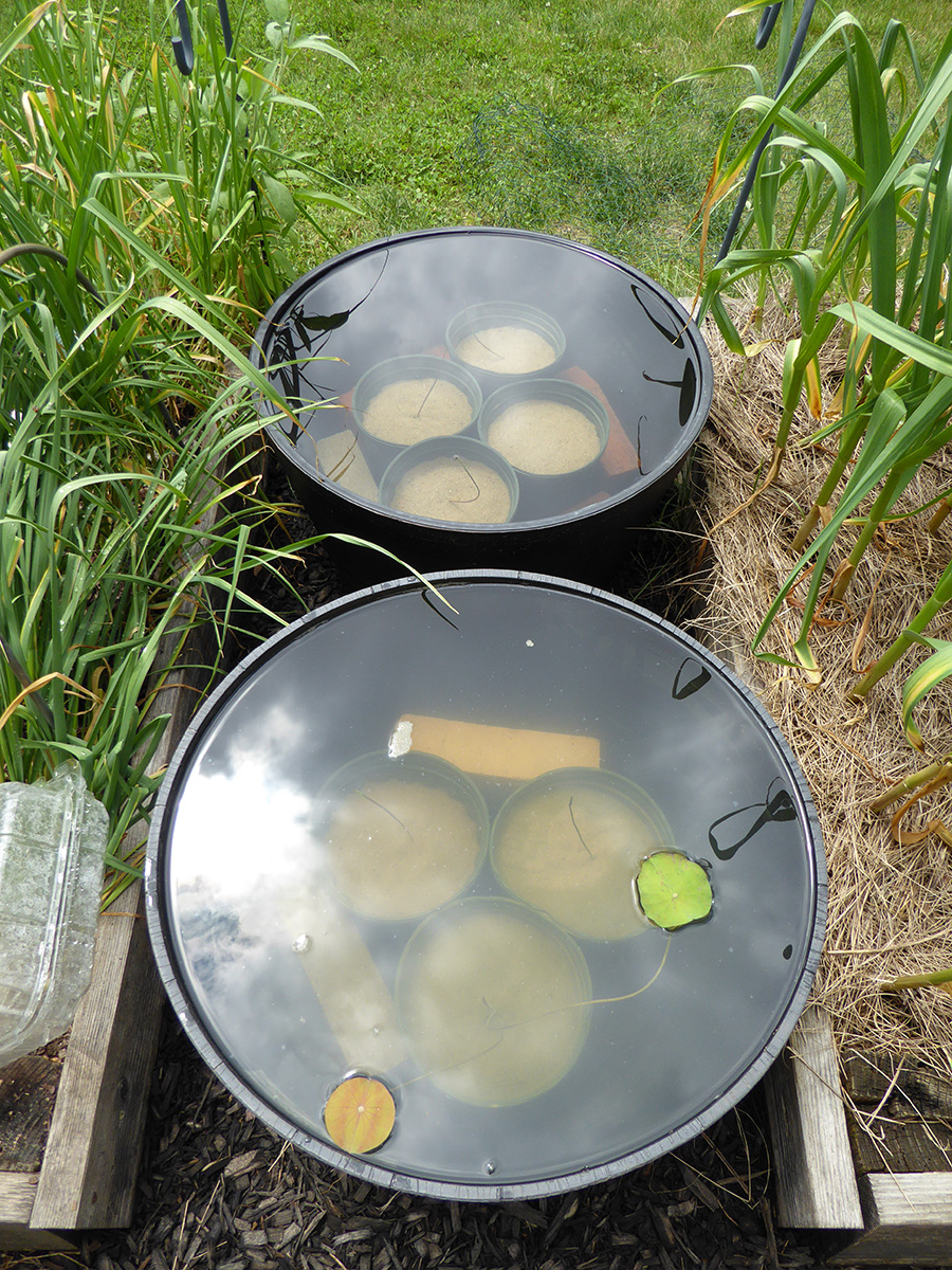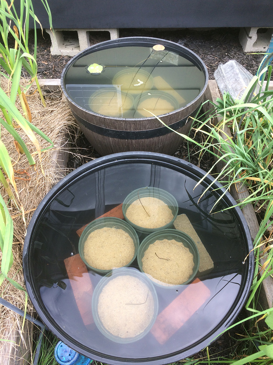 i finally left for belmont, a jar of lotus seedlings sloshing around in the water bottle pocket of my bag. i planted one lotus in the deep barrel and two in the shallow barrel. in the deep barrel the seedling needs to grow 2 more inches before it can reach the water surface, while in the shallow barrel they're practically to the top already.