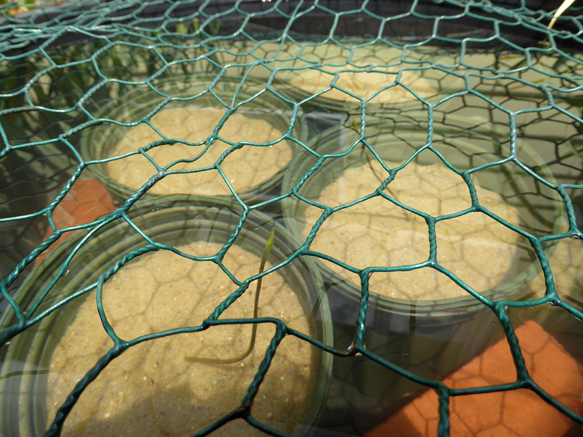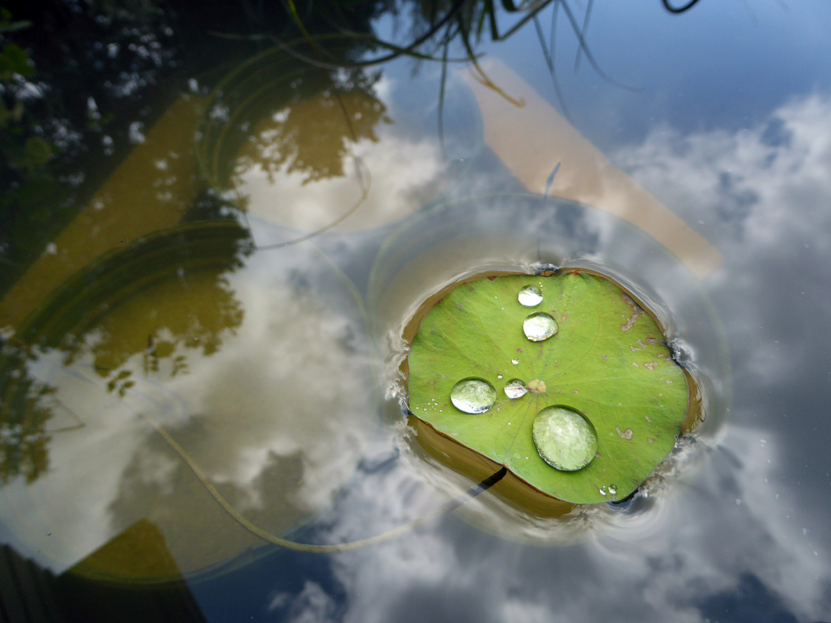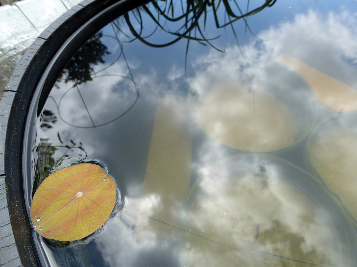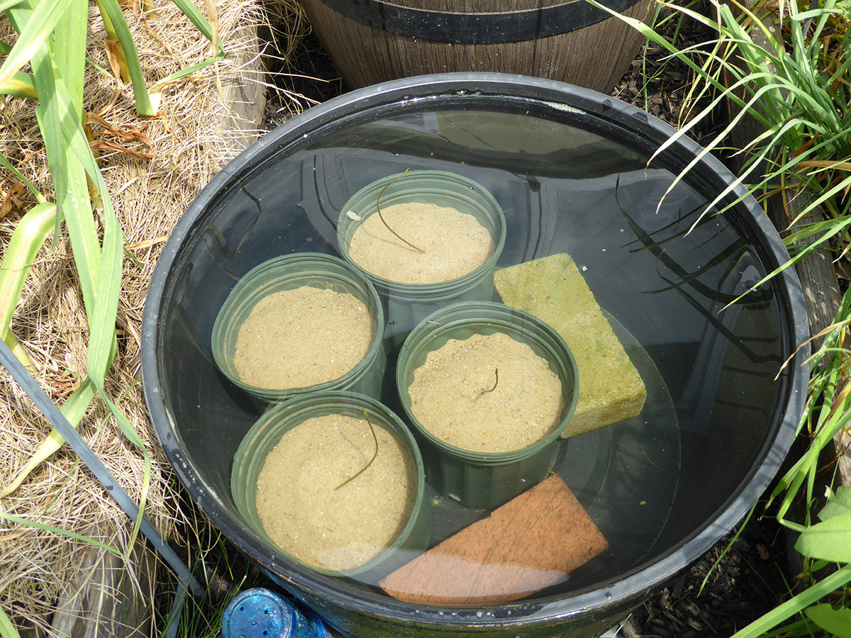 i finally left for belmont, a jar of lotus seedlings sloshing around in the water bottle pocket of my bag. i planted one lotus in the deep barrel and two in the shallow barrel. in the deep barrel the seedling needs to grow 2 more inches before it can reach the water surface, while in the shallow barrel they're practically to the top already.