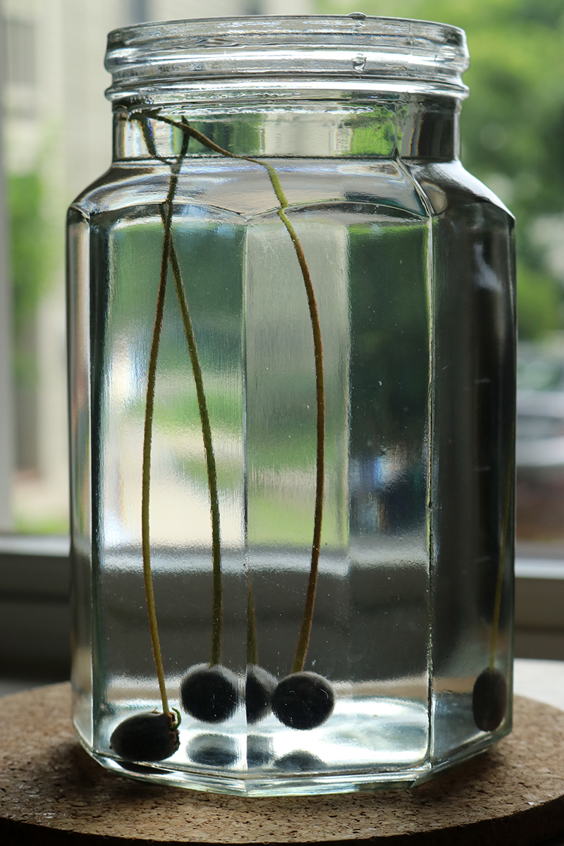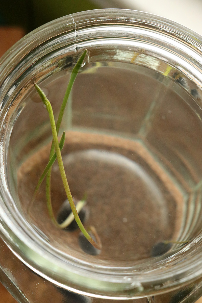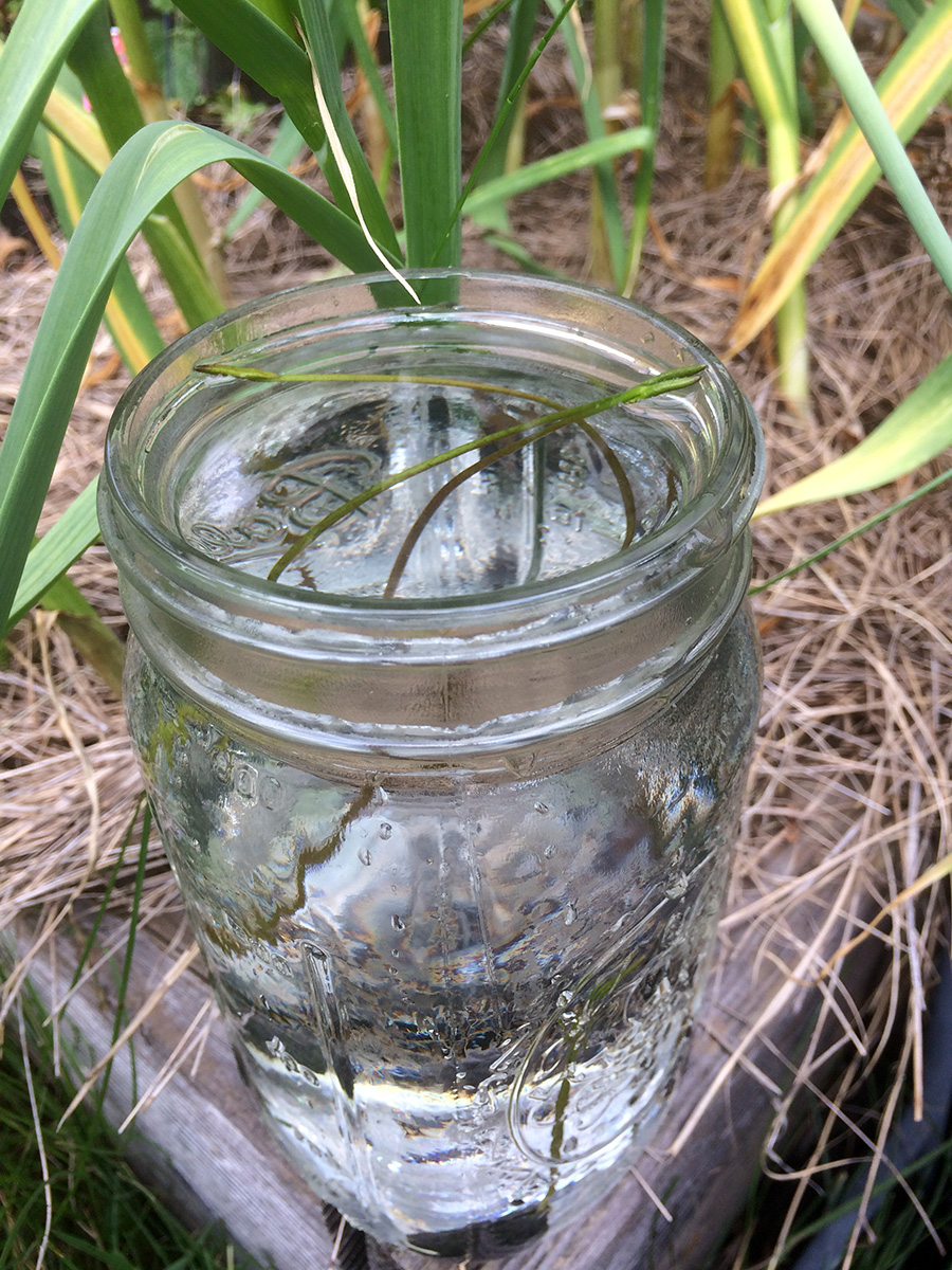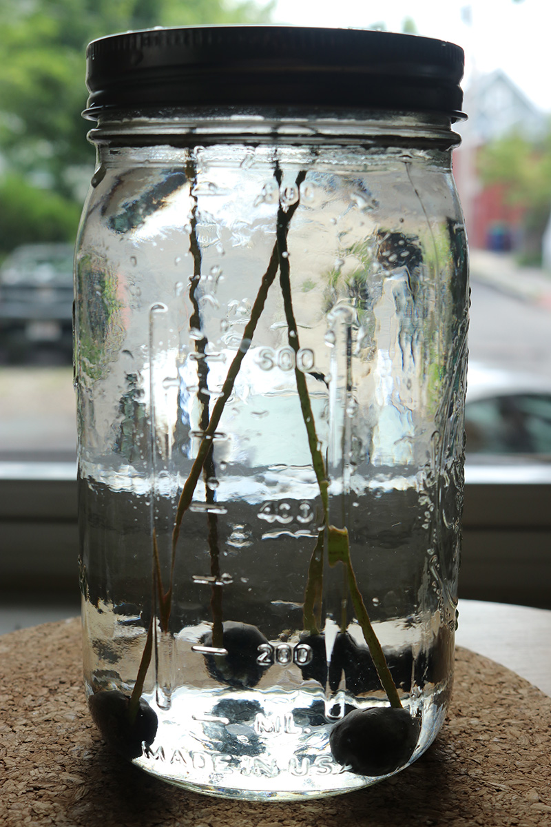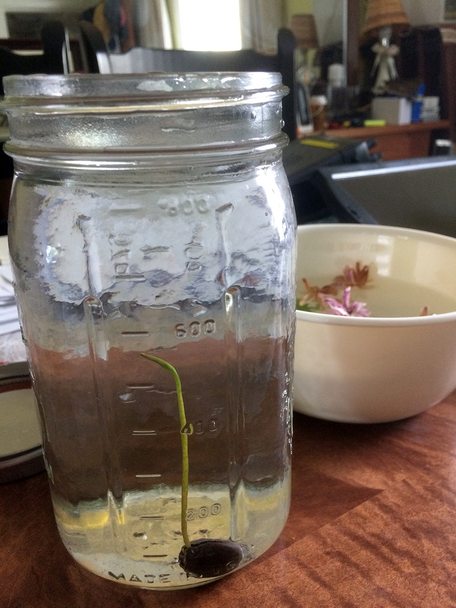 annie didn't leave for work today until almost 10am, covered up head to toe to avoid the sun. after she was gone, i got busy preparing my lotuses for transport. talk about a growth spurt: the three seedlings ready for planting were all over 7" long, the longest one at 8". the stems supposedly are hollow - like straws - which would explain why they always point upwards in the water. they're pliable yet stiff at the same time. the longest seedling was also the one that hadn't formed a 2nd coin leaf sprout yet, which was why i did some surgery last night. it didn't seem to hurt the seed, and i saw something that might be the start of a new sprout. it's vital that it makes more coin leaves otherwise it won't survive with just one leaf stalk. i put all the seedlings into an large empty canning jar full of water, had to push down the seedlings because they were poking out of the water.