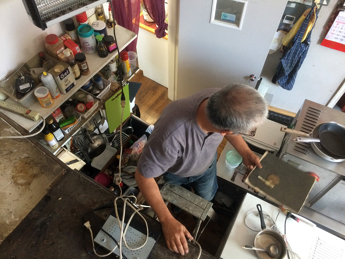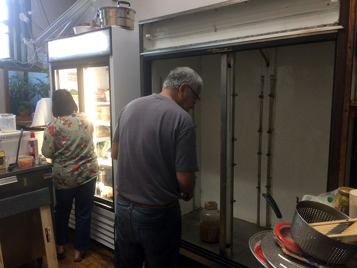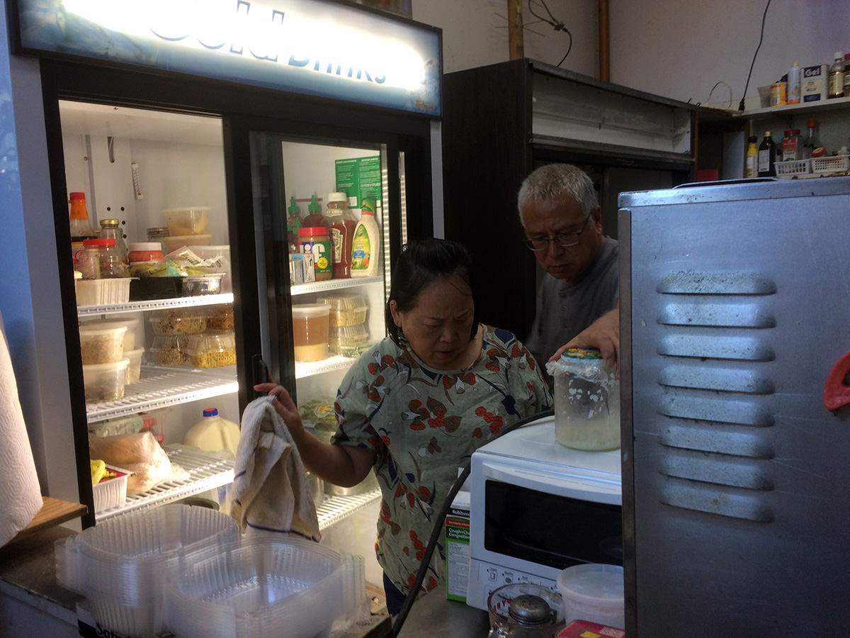close to 3pm i returned to the cafe. the refrigerator still hadn't been delivered yet, and i was starting to think maybe it'd get delayed again. i helped my father clean the top of the old fridge, taking down a heavy analog tv (you know it's old when it has faux wood paneling). by 4pm i called the restaurant supply store (after getting the number from my sister, who couldn't call them herself because she said her phone was overheating and she had to keep in the freezer). just when i was about to get the number of the supplier (who was in charge of making the delivery), a delivery guy finally showed up at the cafe.