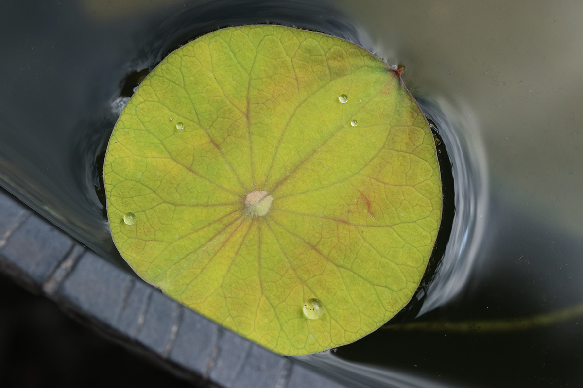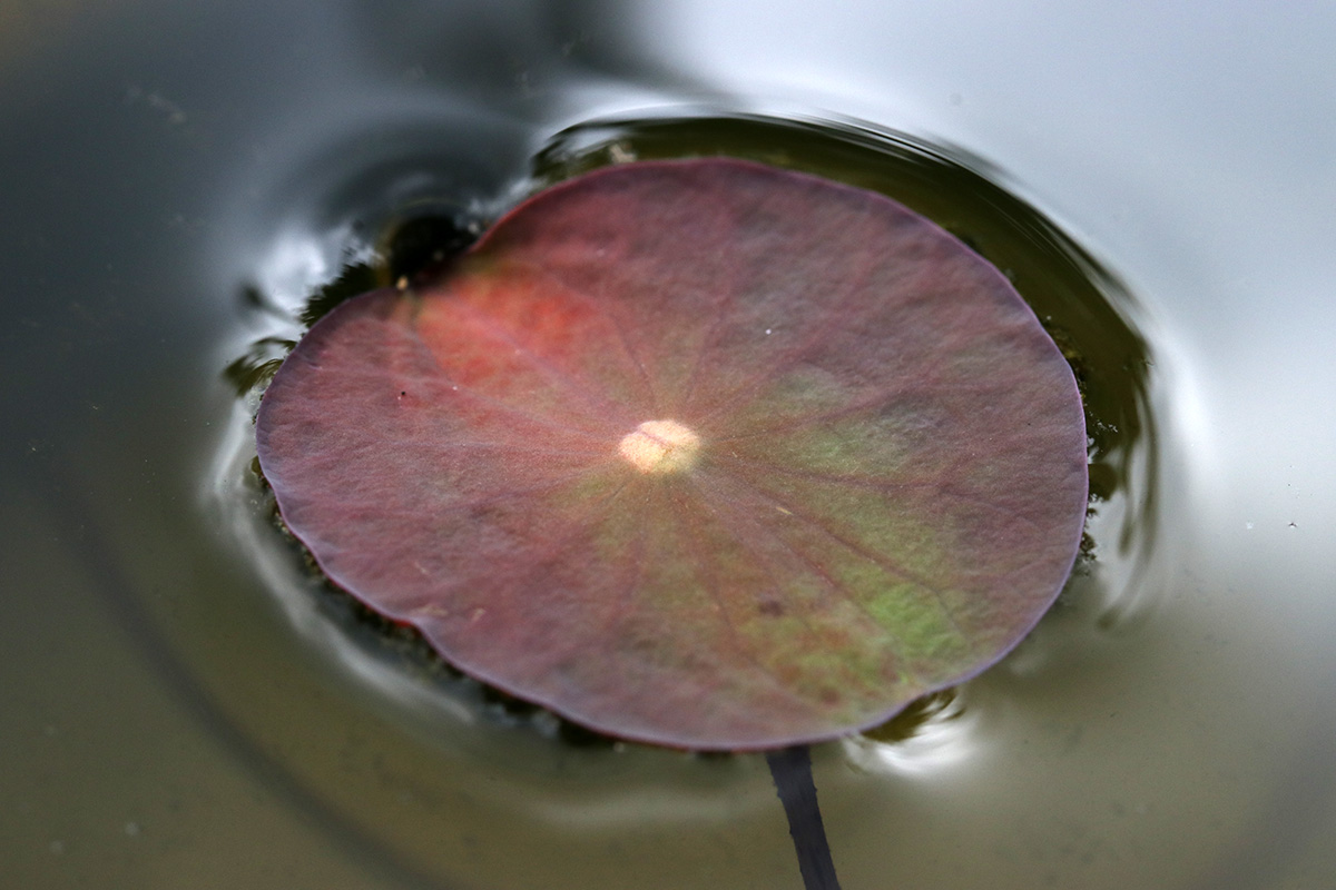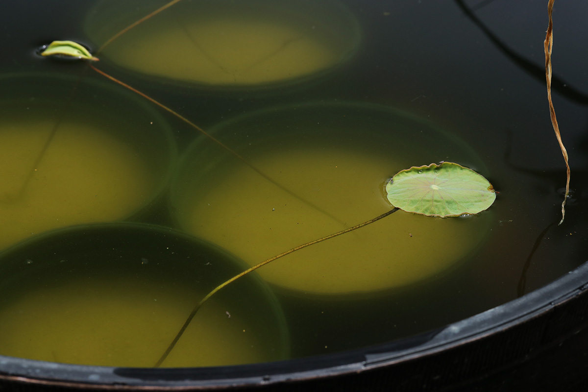 yesterday the last of the lotus coin leaves that was just a leaf bud stem has now slowly began to unfurl into a proper lotus leaf. as for the oldest lotus with the 3 coin leaves, the 3rd coin leaf was in the middle of opening up yesterday, but today has completely opened. what's weird is yesterday there was still some tinge of green, but once fully opened it's taken on a reddish purple color. the 2nd coin leaf is yellowish green, while the 1st coin leaf is entirely green. the shallow barrel which was still clear as of yesterday has now turned a murky greenish color, most likely due to algae bloom. it's an easy fix - just refill the barrel - that would also mean getting rid of the chlorine conditioned and BTi treated water. i'll keep it as is for now, unless it begins to affect the lotuses. they're used to growing in murky waters anyway, and once more lotus leaves are produced, they will cover the water surface, blocking any sunlight from reaching the bottom, thereby stopping the algae growth.
