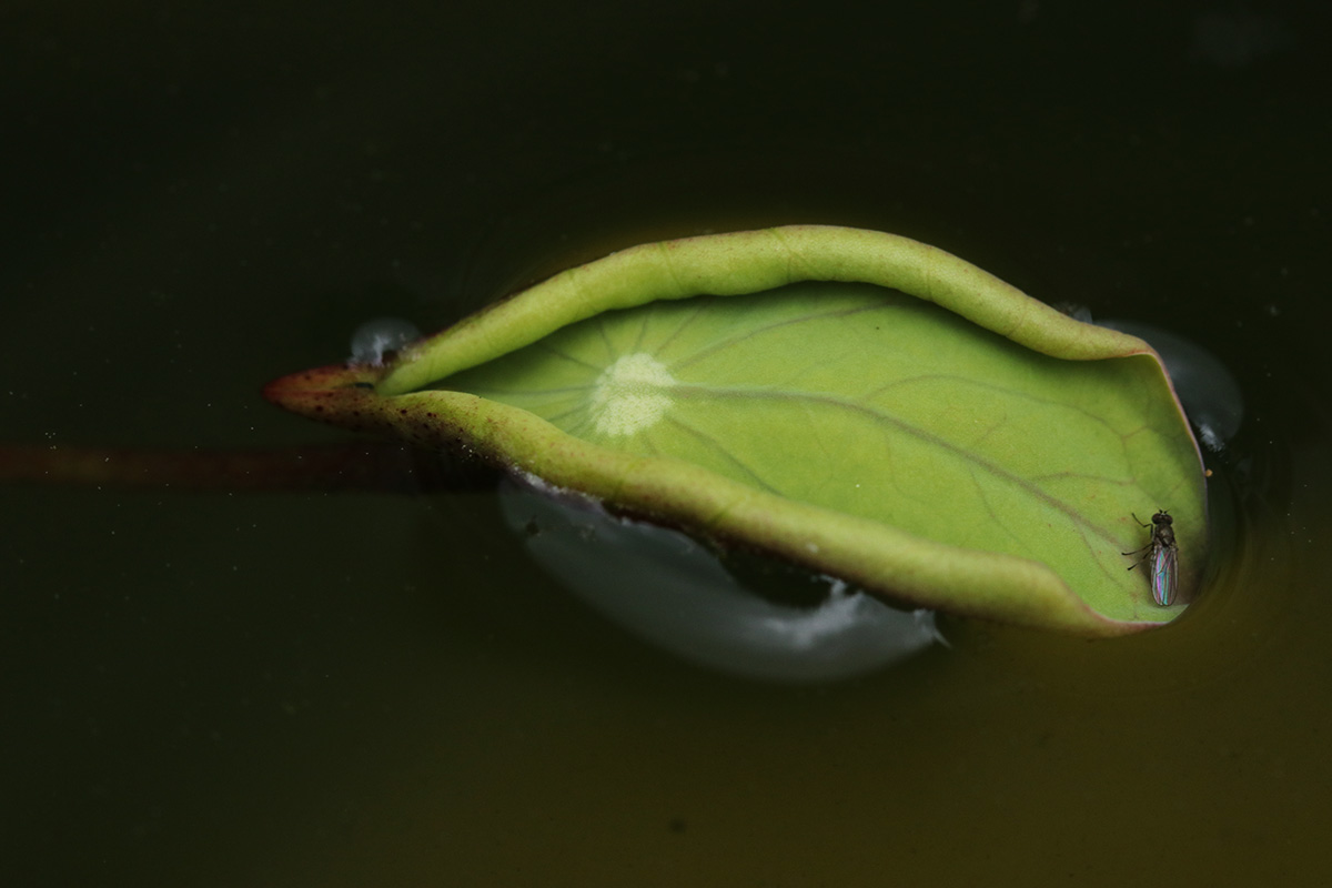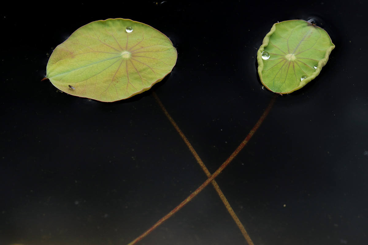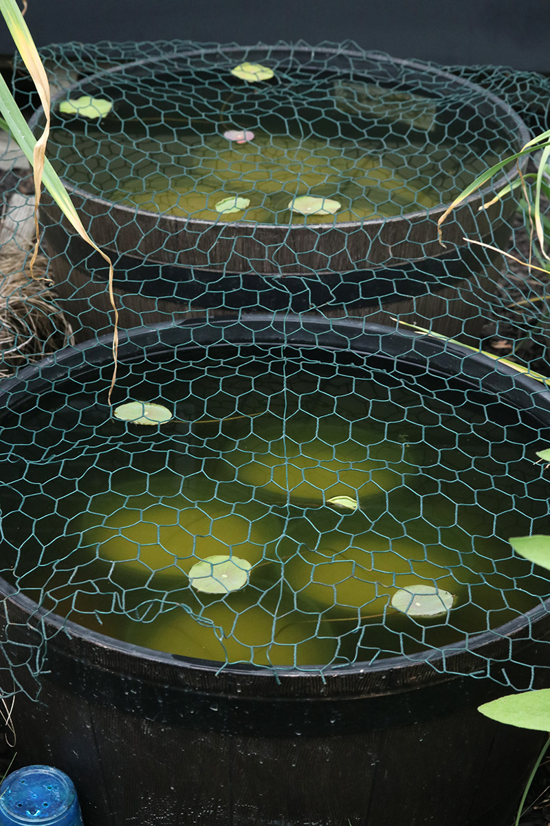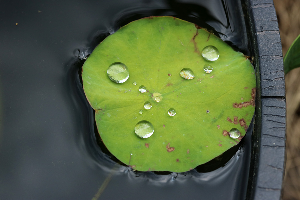 yesterday the last of the lotus coin leaves that was just a leaf bud stem has now slowly began to unfurl into a proper lotus leaf. as for the oldest lotus with the 3 coin leaves, the 3rd coin leaf was in the middle of opening up yesterday, but today has completely opened. what's weird is yesterday there was still some tinge of green, but once fully opened it's taken on a reddish purple color. the 2nd coin leaf is yellowish green, while the 1st coin leaf is entirely green. the shallow barrel which was still clear as of yesterday has now turned a murky greenish color, most likely due to algae bloom. it's an easy fix - just refill the barrel - that would also mean getting rid of the chlorine conditioned and BTi treated water. i'll keep it as is for now, unless it begins to affect the lotuses. they're used to growing in murky waters anyway, and once more lotus leaves are produced, they will cover the water surface, blocking any sunlight from reaching the bottom, thereby stopping the algae growth.