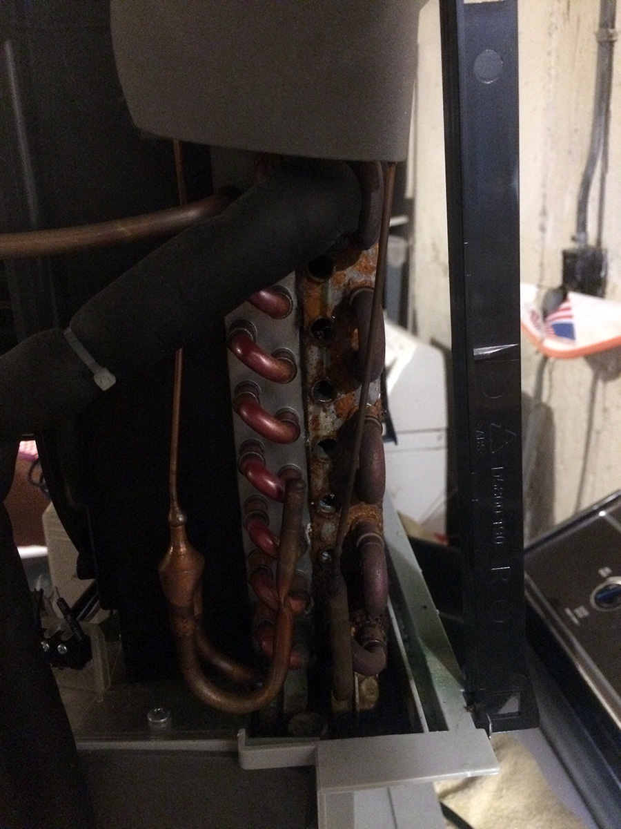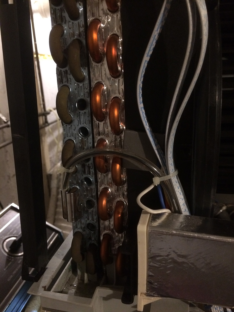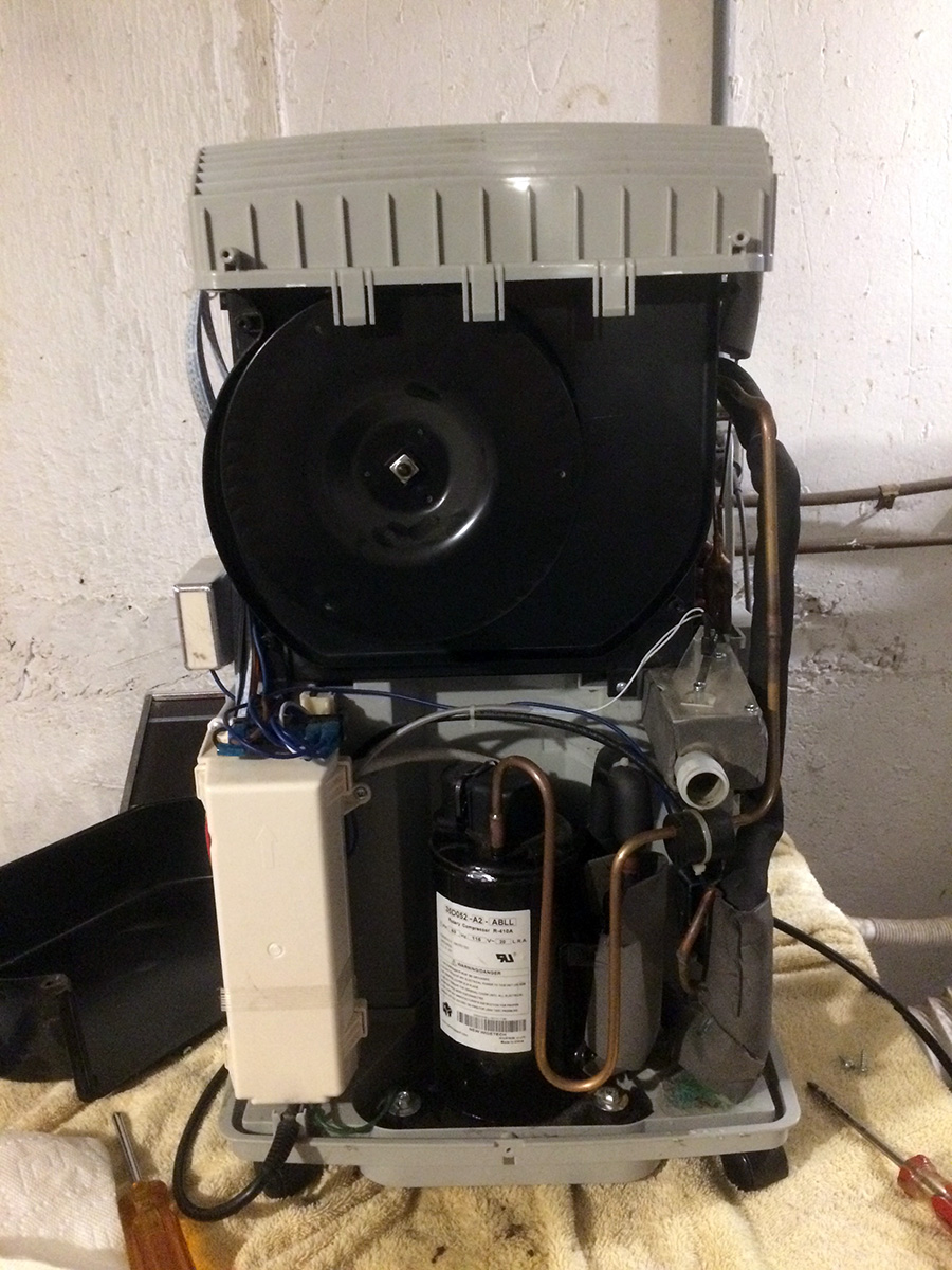 we began to suspect that the delonghi dehumidifier DD50P wasn't quite working. we shut off the pump to see how much water would collect in the tank. when we saw there was no water, we knew something was up. so we decided to open it up and look around inside. it could be as simple as cleaning the dust off of the condensors. we removed the screws but couldn't get the back cover to come off. while my father kept on trying, i went online trying to find a teardown video, but i had zero luck. finally we figured out it was because the drain cap was still attached, preventing us from removing the cover. once the cap was off, the cover came off easily. there was some dust on the condensor coils and fins, but it wasn't that bad. however the compressor was scaldingly hot, and i noticed there was a faint burning smell earlier which i now know came from the dehumidifier. after brushing and vacuuming off the dust accumulation, we opened up the fan assembly. we imagined it to be clogged with dust, but it was pristine on the inside. so the problem seems to be the compressor, but it's not a part that can be easily removed and replaced. looks like we have no choice but to buy a new dehumidifier.