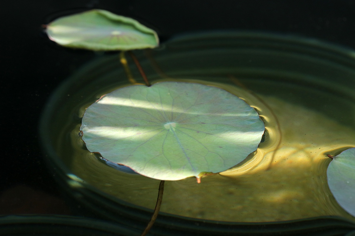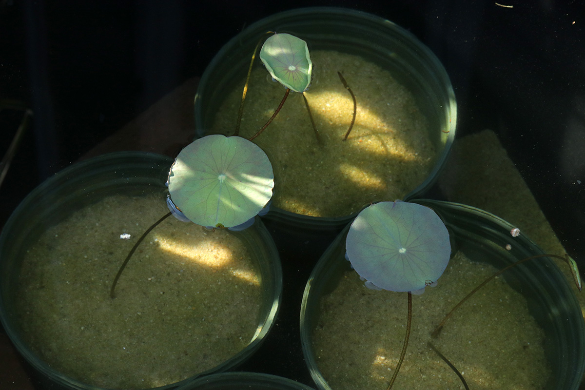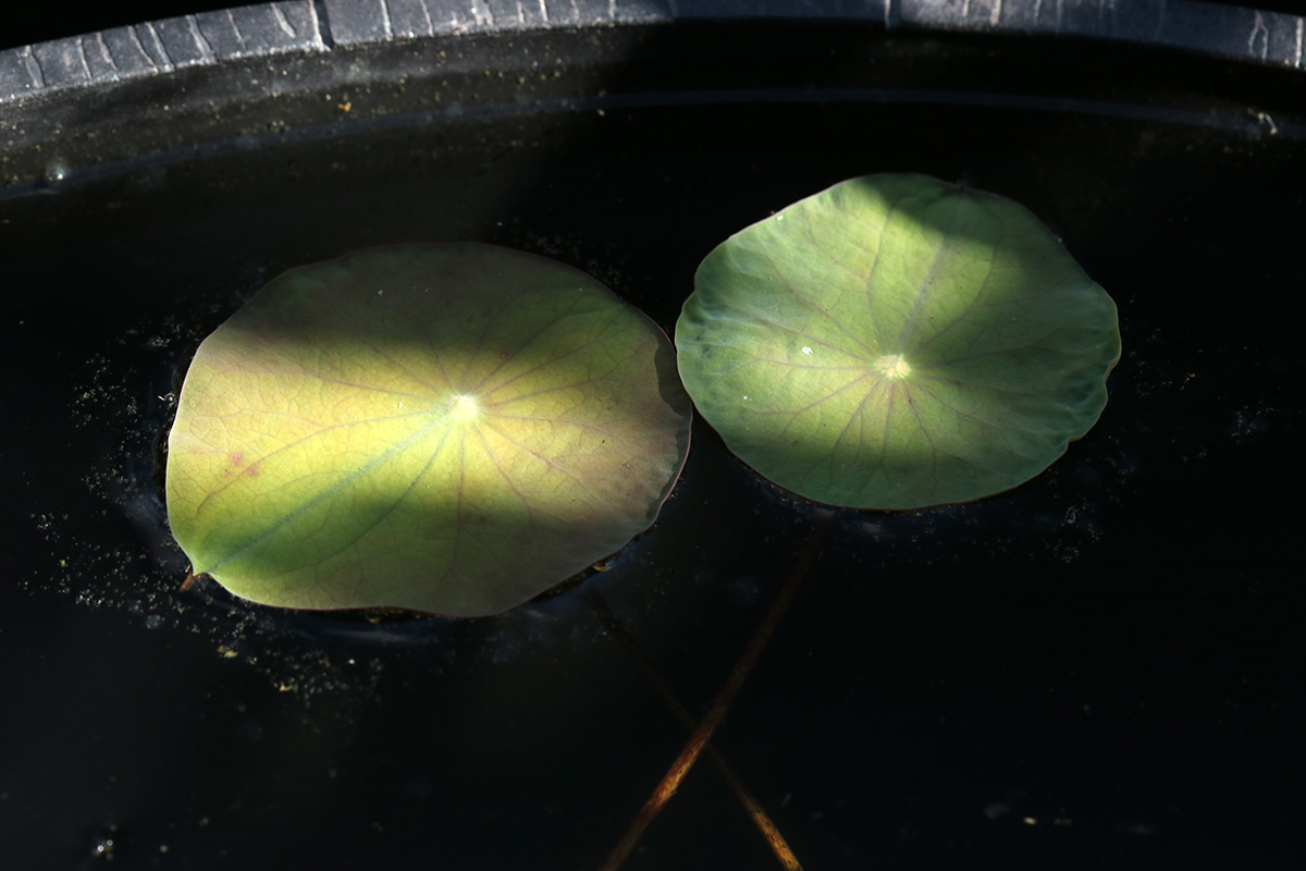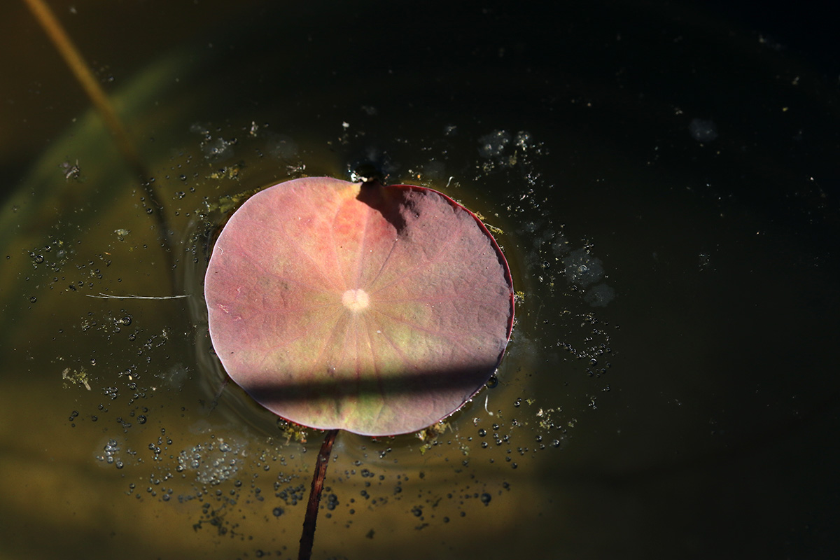 apparently all new coin leaves other than the very first one open up with a reddish color but then over time turn green. this is all based on a single lotus plant, still waiting on the other lotuses to make their 2nd coin leaves to confirm this hypothesis. coin leaves are like floating islands, and seem to attract surface debris, anything from pollen grains, dead insects, and bubble slime. when i pushed the 3rd coin leaf underwater, it started fizzing underneath from all the trapped bubbles.