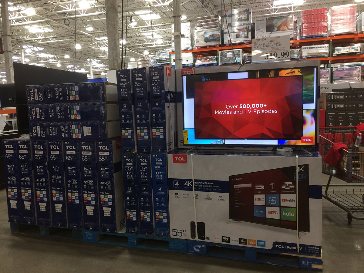 costco was surprisingly busy for a monday. my theory was because it was so close to noontime, a lot of people were there getting supplies on their lunch break. or it could be people stocking up for the 4th of july on thursday. we checked out the HDTV's as my 2nd aunt said she wanted to upgrade once they move (which is hopefully soon). they currently use an old-style glass-tube widescreen television my aunt lili originally gave to us. nowadays you can get a 32" LED HDTV with built-in roku for around $100. of course costco didn't carry any of those paltry models: instead it was selling a 55" 4K TCL HDTV with built-in roku for $320, which is an amazing deal.