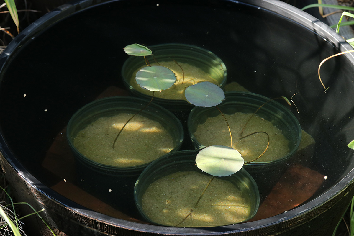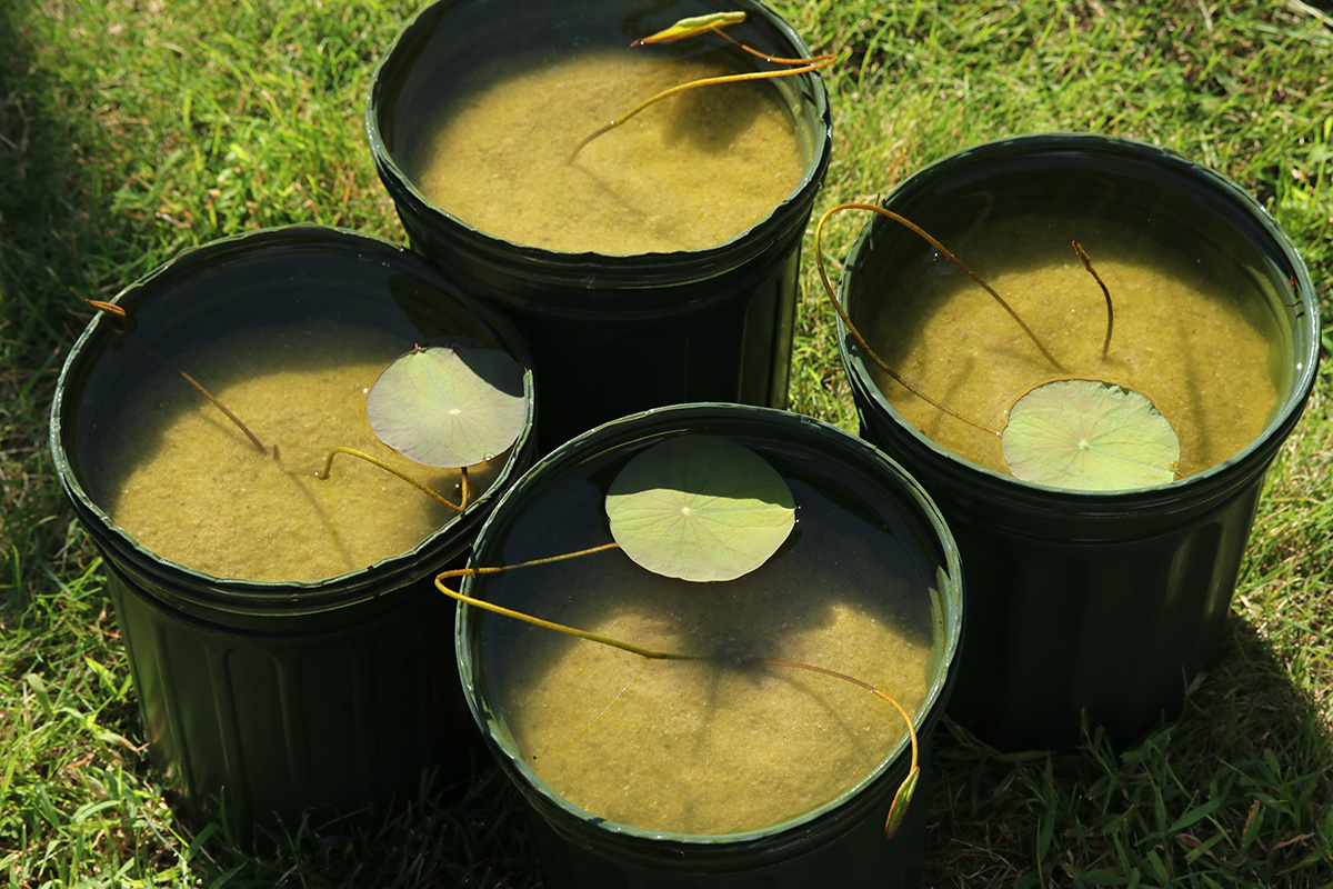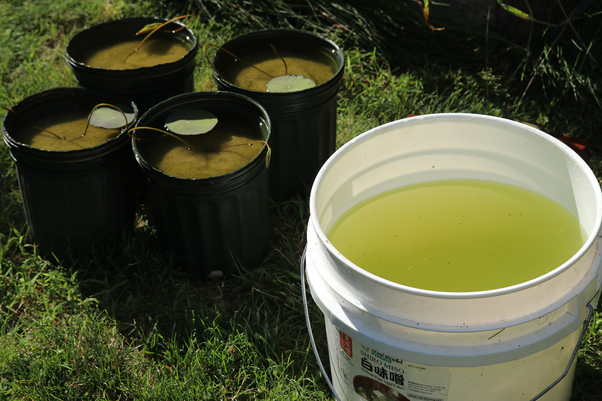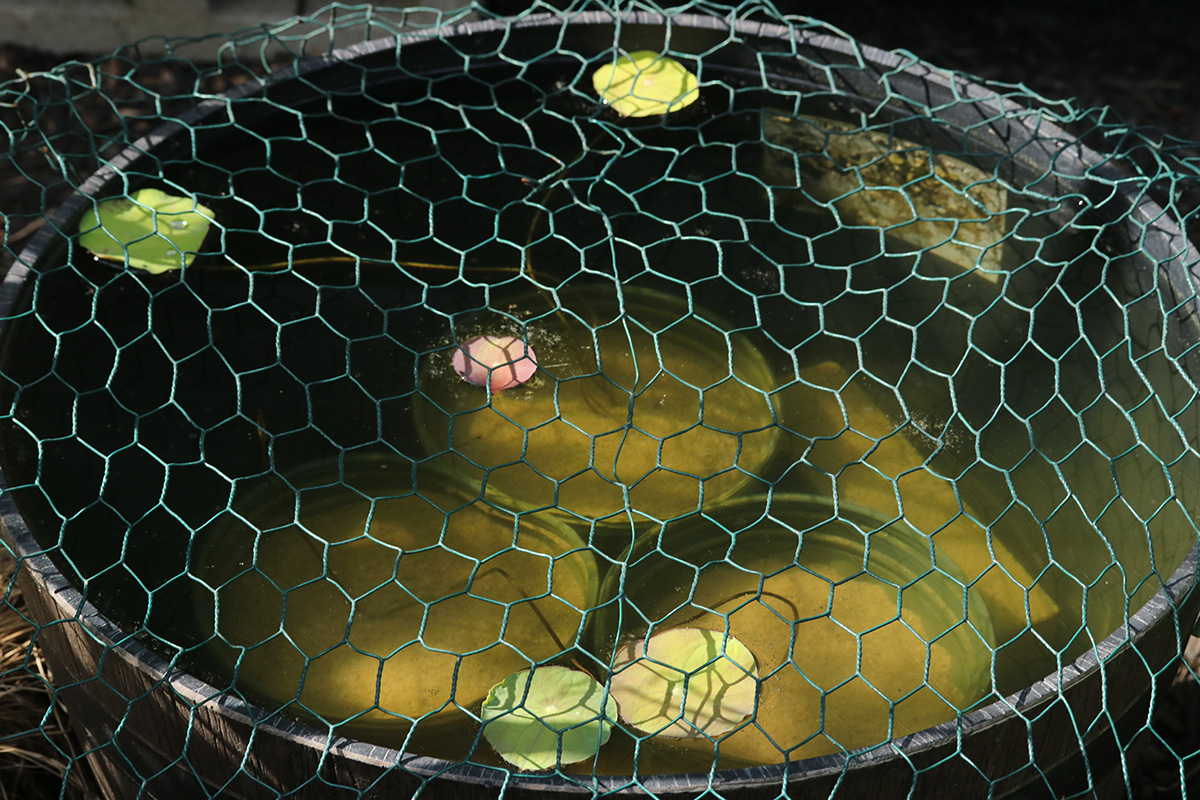 the shallow lotus barrel looked especially murky that i decided to do a water change. i was reluctant before because i thought the tap water temperature would be too low, but i took a measurement a few days ago and realized it was around 65°F, not too cold. after taking out the potted lotuses, i scooped out the water with a bucket. the water was yellowish green. it wasn't like algae was growing on the inside of the barrel, but rather the algae was suspended in the water itself. how that even happened i don't know. maybe there was some organic debris mixed in the clay that caused the algae bloom, beside i'd think the sand layer would be pretty sterile.