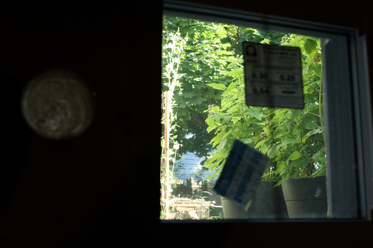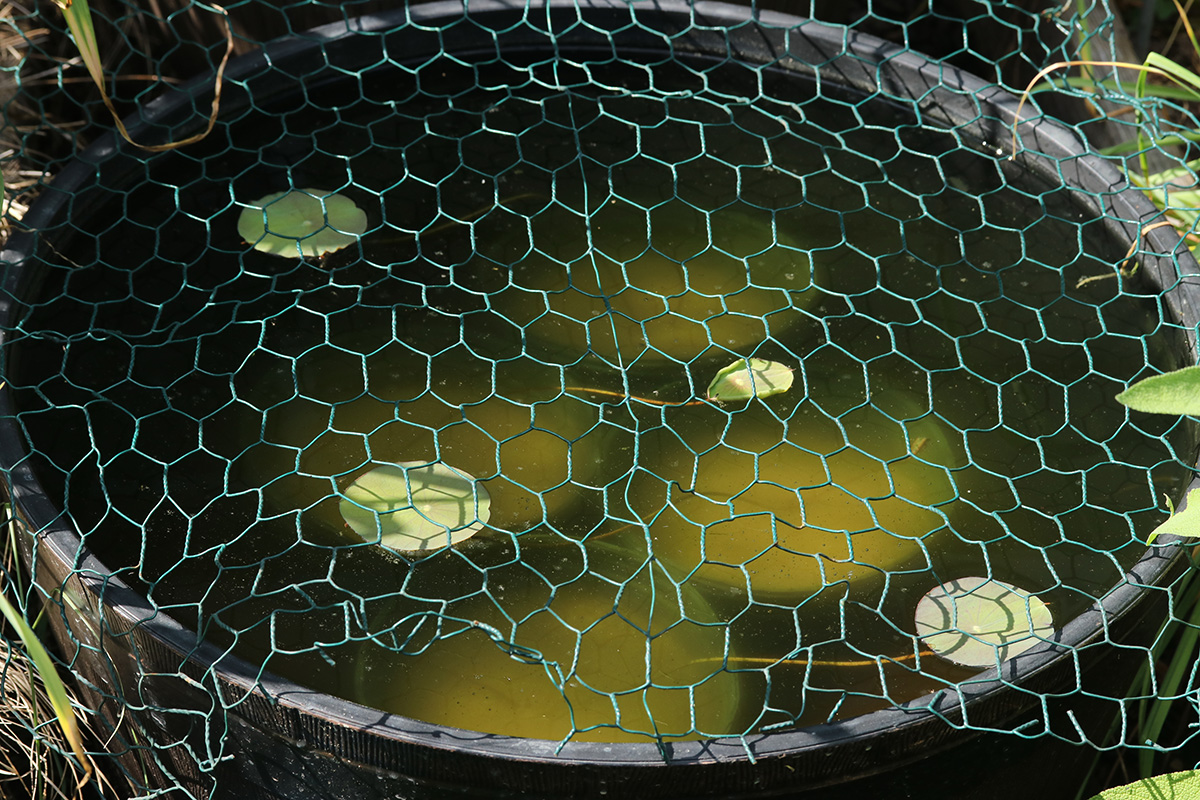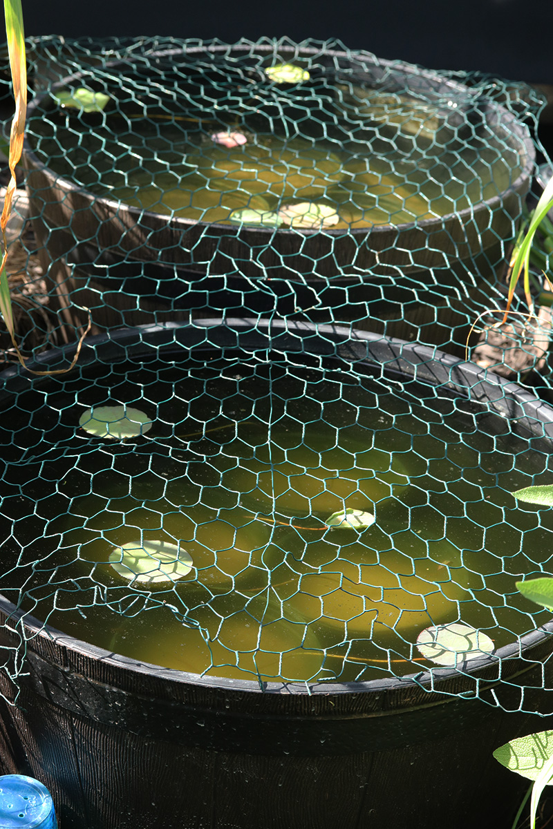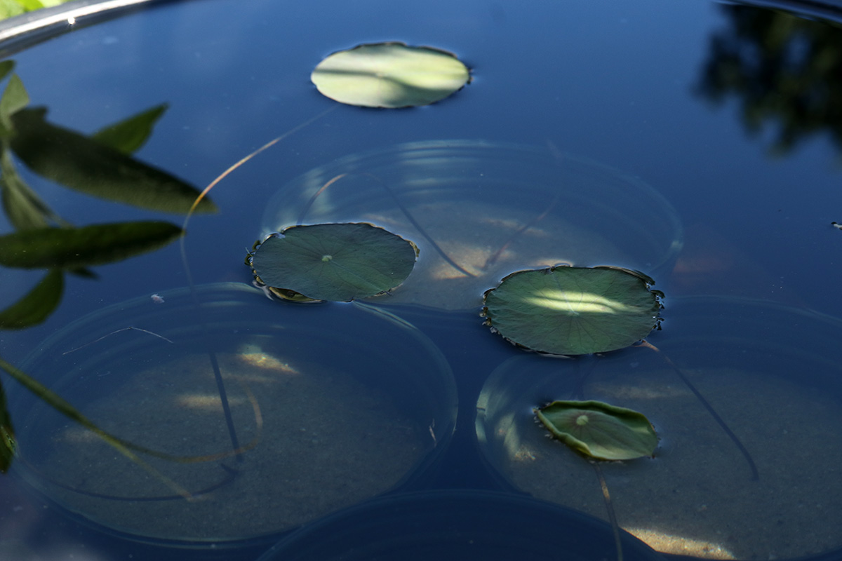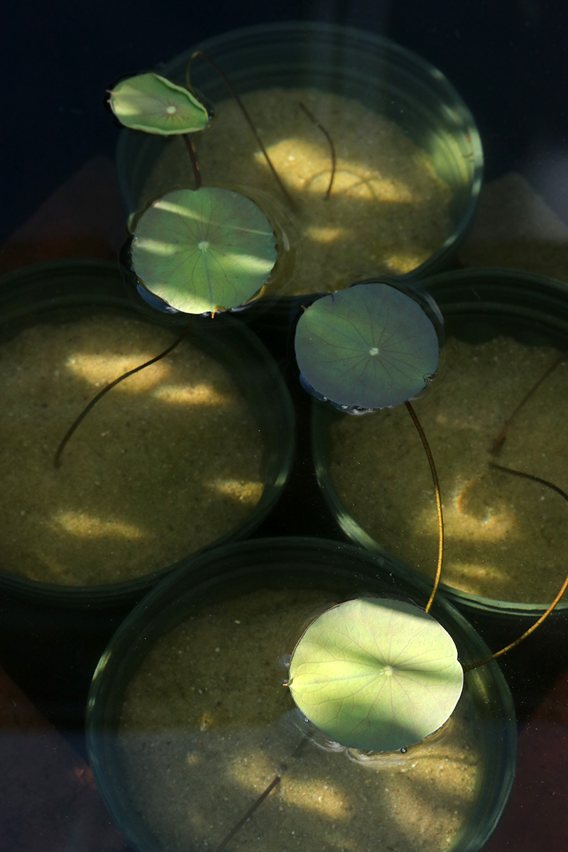 the shallow lotus barrel looked especially murky that i decided to do a water change. i was reluctant before because i thought the tap water temperature would be too low, but i took a measurement a few days ago and realized it was around 65°F, not too cold. after taking out the potted lotuses, i scooped out the water with a bucket. the water was yellowish green. it wasn't like algae was growing on the inside of the barrel, but rather the algae was suspended in the water itself. how that even happened i don't know. maybe there was some organic debris mixed in the clay that caused the algae bloom, beside i'd think the sand layer would be pretty sterile.