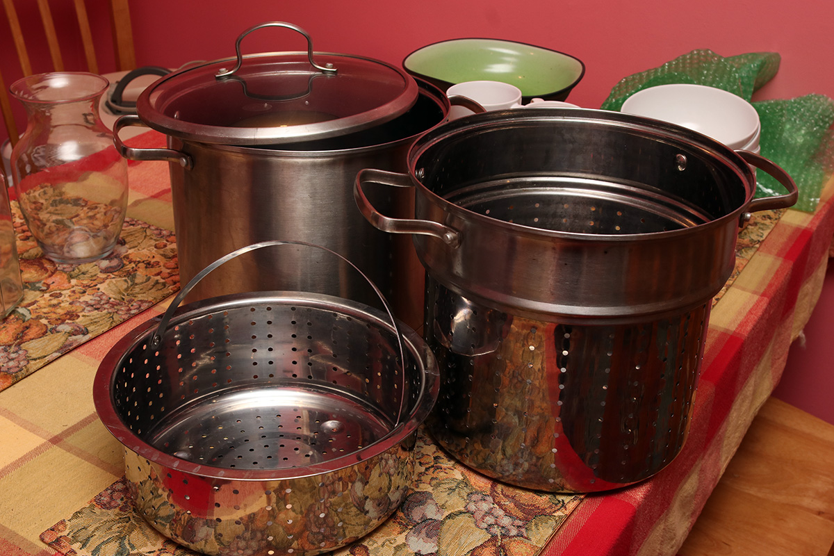 about to ride out to belmont, i noticed a neighbor had moved and left a bunch of free stuff on the curb. this is one of the perks of living in a place where a lot of people (like students) rent, because when they move out there's always a bounty of freebies. i see a lot of small furnitures and kitchenware like utensils and dishes. not a year goes by when i don't find something useful. i can go through my house and point to things i've found. i rummaged through the cardboard box and found some ikea cereal bowls and mugs, which i took. i also got what i thought was a large stainless stockpot, but it looked like a double boiler but with a perforated inner pot. i didn't know what it was but it looked expensive so i took it, along with a glass lid. later i found a smaller steamer basket that looked to be a part of the set.