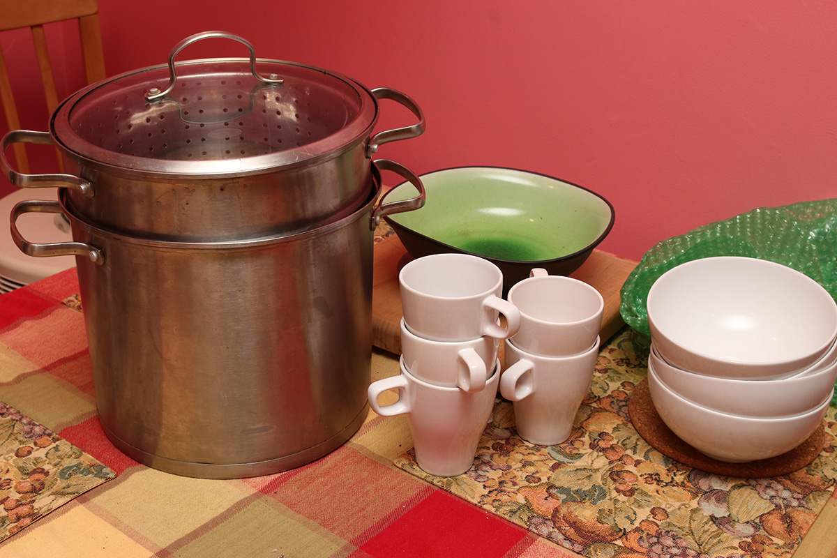 i did some research and what i found was a denmark brand stainless steel 12-quart 4-piece multi-cooker set, AKA pasta steamer (nowadays a "multi-cooker" means a pressure cooker). this one most likely came from bed bath & beyond although they no longer sell it anymore. not sure what the original price was, but i can find something very similar on amazon.com for just $35. it seems like a one-trick cookware, that you can boil pasta and strain it immediately afterwards without using a colander, with a steam basket on the top for steaming vegetables and whatnot. the steaming part seems healthy, but the pasta part not so much, and i don't know when i'd ever need to make 12-quart's worth of pasta. the stockpot might be useful but i may just put the multi-cooker in the basement. likewise with the ikea mugs and bowls, i have plenty already.