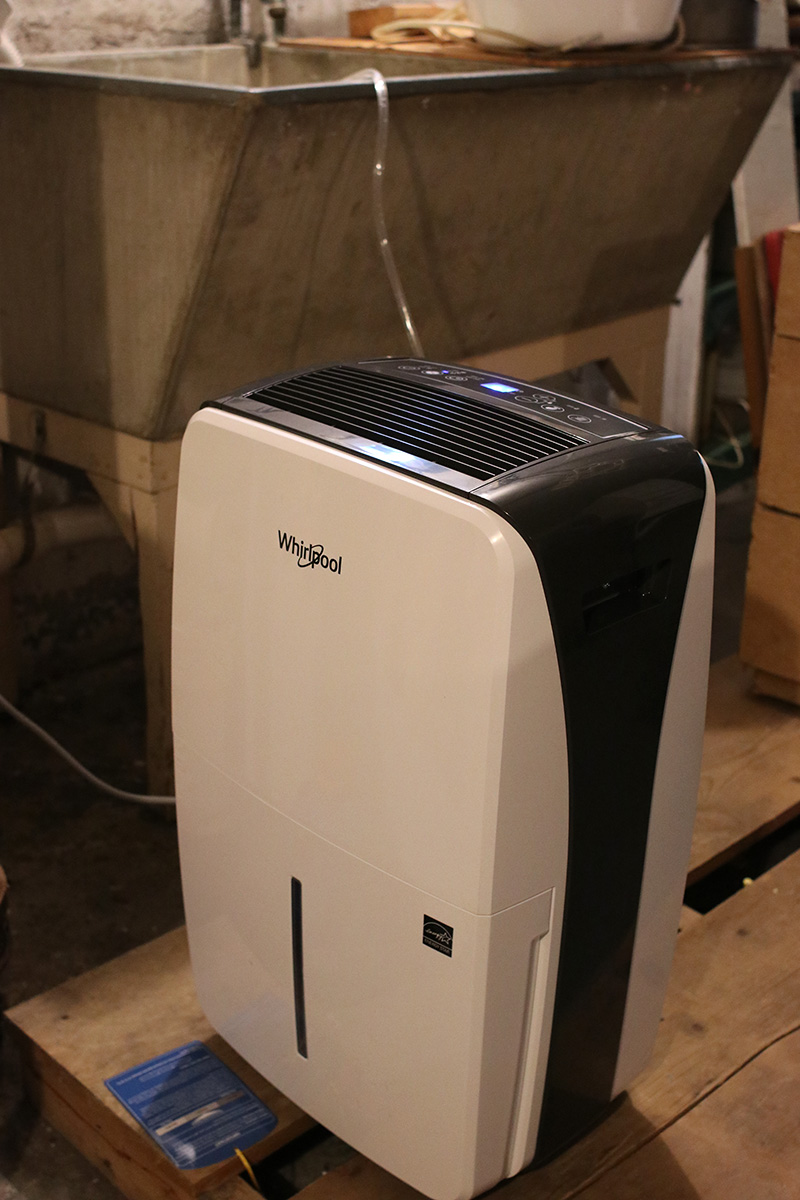 we got back home close to 3pm. after unloading everything out of the car, my father and i brought the whirlpool dehumidifier into the basement to test out. we powered the unit through a smart plug, set the humidity at 60% and put the drain hose in a bucket in the sink so we could see how much water was collecting.