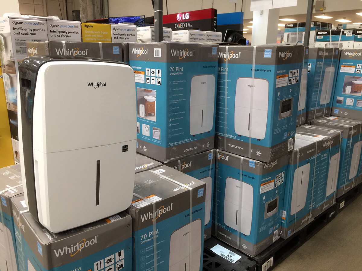 finally my father and i were there to check out costco's dehumidifier selection. on their website, they carried two energy star rated models with pumps: 70-pint hisense for $220, and a 70-pint whirlpool for $180. i preferred the hisense because it looked like a newer model. plus, i found out that whirlpool doesn't actually make their own dehumidifiers, but instead rebrand 3rd party ones as their own (case in point: we bought a TCL dehumidifier last year from OSJL that we ended up returning; whirlpool has the exact same model). so they didn't carry any hisense models but had stacks of whirlpool dehumidifiers by the entrance. seeing it in person it looked better than the photos, and surprisingly small for a 70-point dehumidifier. it was also cheaper, at $170, so we decided to get one. with the masssave dehumidifier energy rebate we'd get $30 back, and if we donate our old unit during one of those dehumidifier return programs (we have 3 old units), we could get another $30 (per unit), so in the end it'd only cost us $80-110 (before taxes).