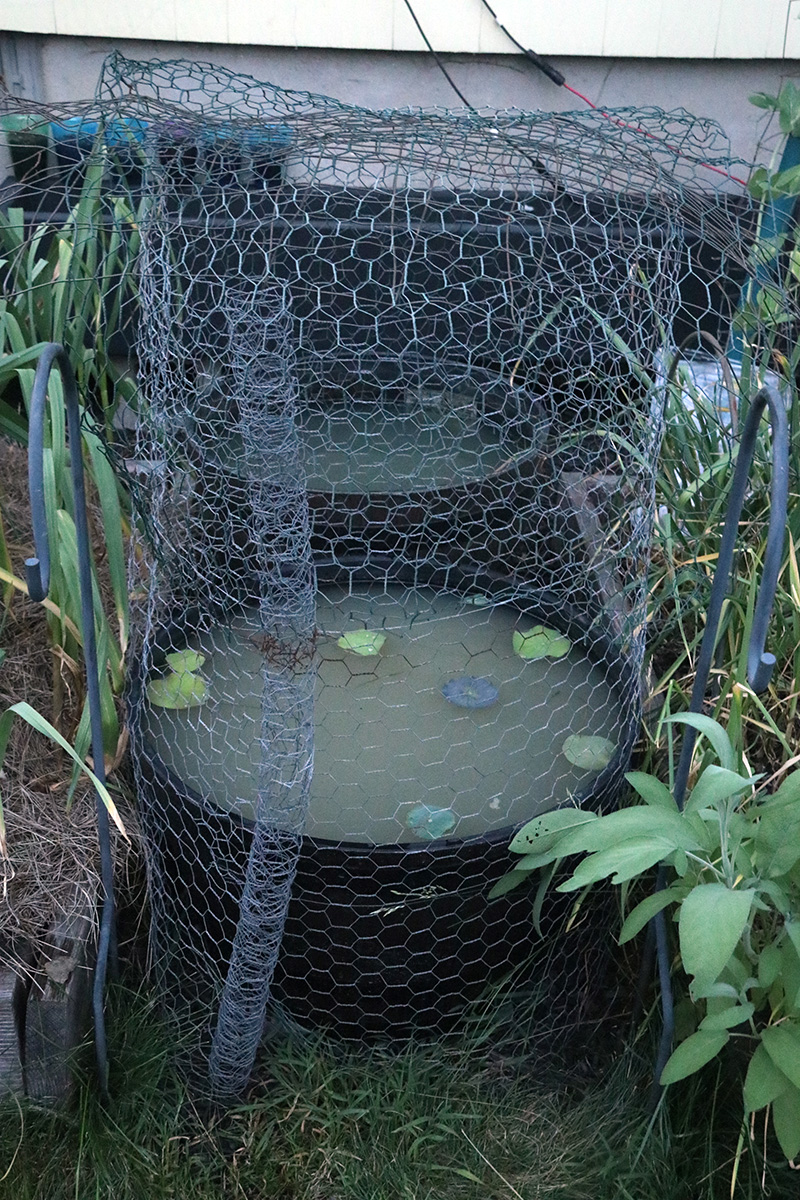 i put all the surviving lotuses back into the shallow barrel (water very warm from being out in the sun all day) and my father and i constructed a more elaborate cage. i was going to make a taller cage anyway, once the aerial leaves started forming, we're just doing it a bit early. there are only a few animals that could've done this. birds and squirrels, too light. whatever did this was heavy enough to push down the wire mesh. the only culprit i could think of would be raccoons. only they would be smart enough to try digging for food underwater. a few other hints point to raccoons: one of the buttercup plants was chewed up (the one by the evergreens) and some animal had flipped over my silver-plate bird bath dish onto the ground.