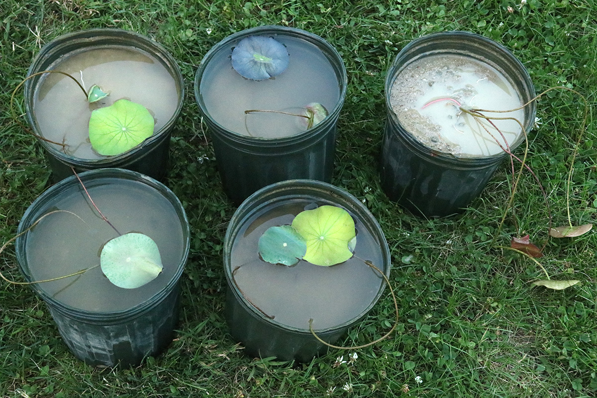 my parents were surprised but yet not too surprised to see me. both barrels are murky again after all that hard work i did yesterday keeping one of them clean. my father had taken off the chicken wires for the time being, two large sunken depressions. i started pulling up the lotus pots one by one. 2 plants were entirely dead, leaves ripped from seeds. the kicker was whatever did this ate the seeds. 5 other plants survived, in various state of damage. the oldest lotus had been entirely uprooted, but all the stems were still intact. this one plant is a real survivor, having outlasted 2 critter attacks. uprooting it actually gave me a change to see how the roots were developing and spot the running rhizome stem. a few coin leaves on the other lotuses seemed wilted. i thought maybe it was water damage, but my father suggested that maybe the leaves were out of the water the entire day and got scorched in the sun, which seems like the likely explanation. leaves they can regrow, seeds all seem intact and still buried.