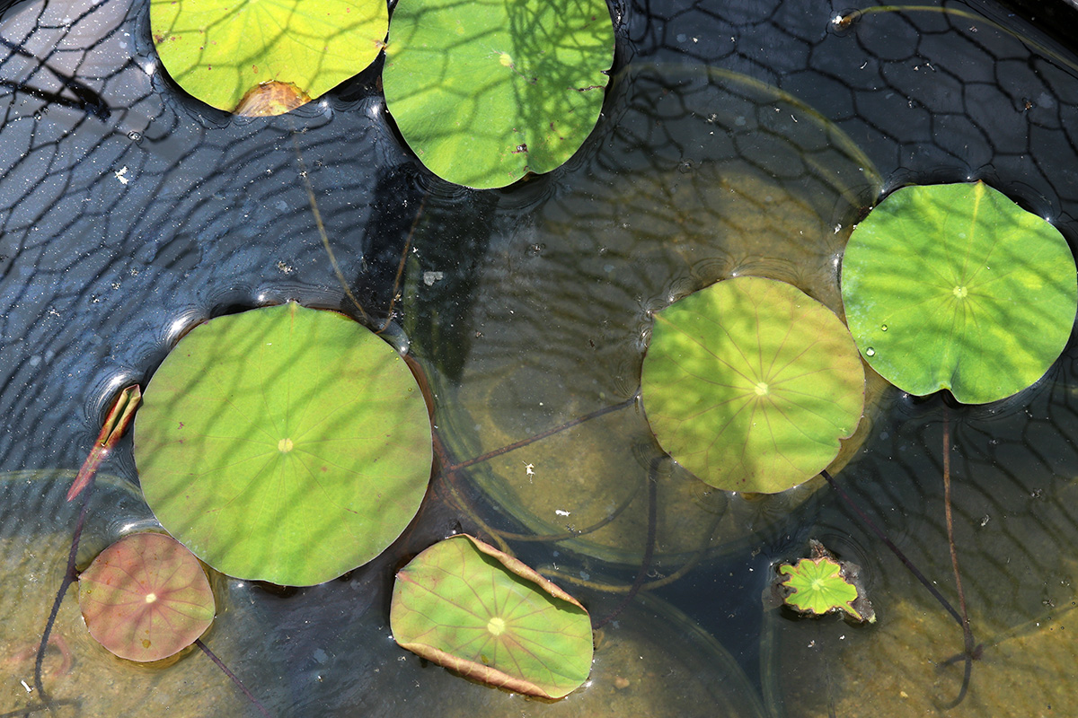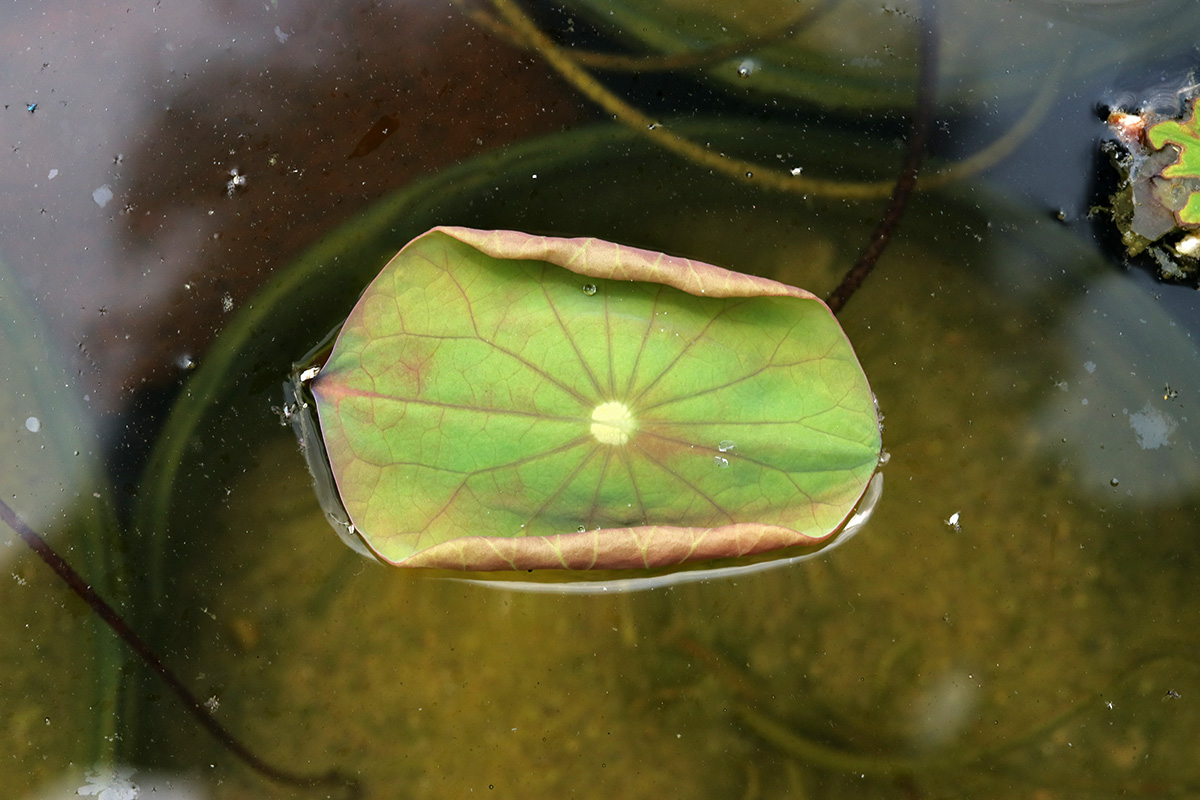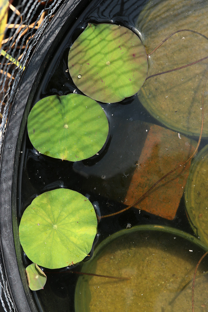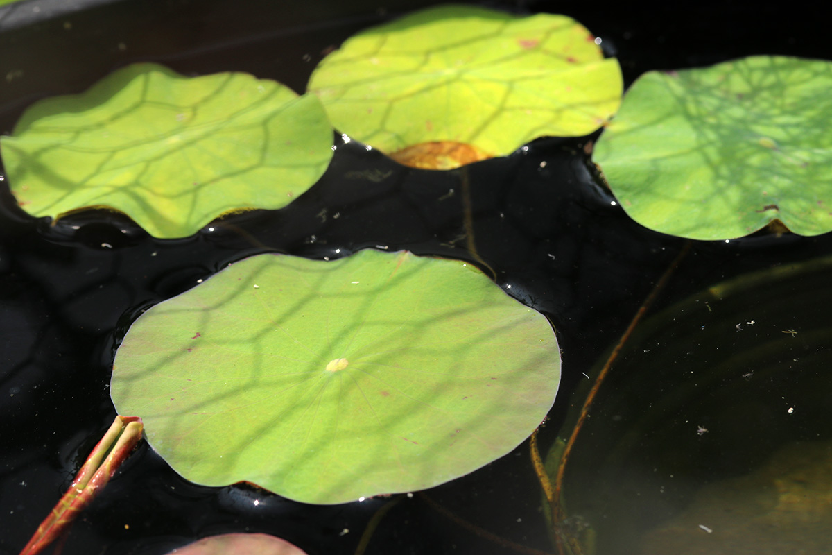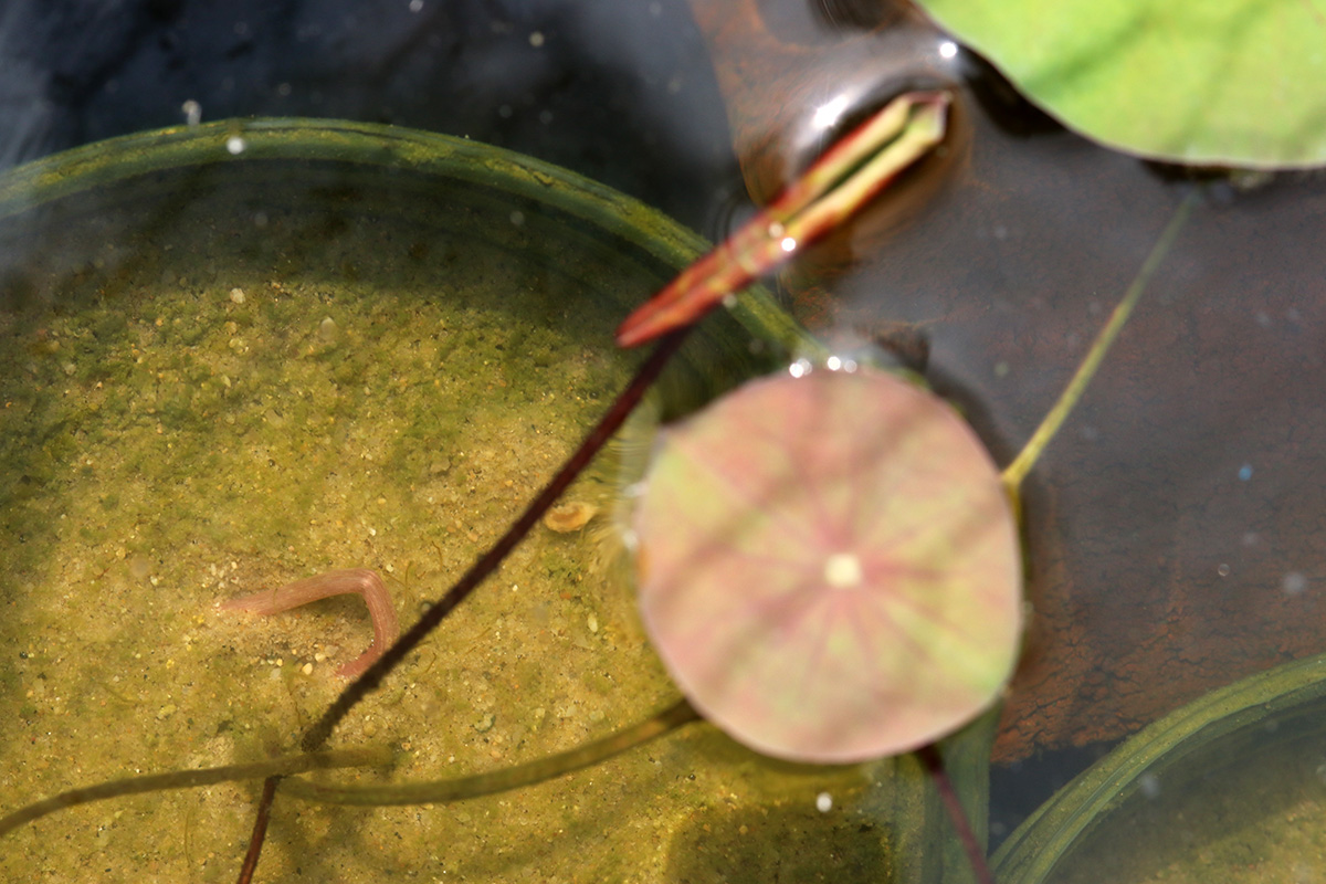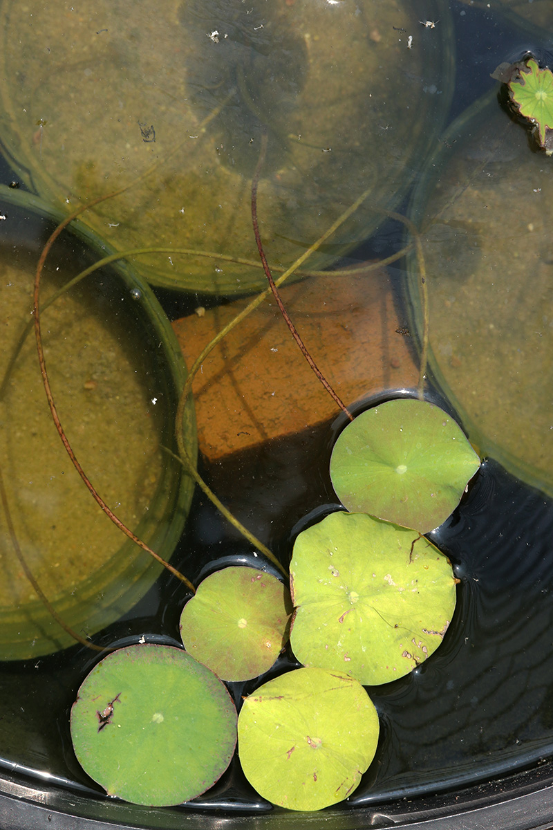 one coin leaf unfurls, another new furled coin leaf takes it place. seem like the lotuses are making a new leaf every 1-2 days. the scary root i saw yesterday, it's fully exposed now and it's not really a row of roots (like an old computer ribbon cable) but rather just the striated patterning. the surface of the barrel is littered with Bti oil slicks, bit of blown plant debris, and bodies of unwary insects. i'm tempted to overflow the barrel with a garden hose to clean off the surface, but i'm worried about the chlorine and chloramine levels. just how sensitive are lotuses to these common tap water disinfectants?