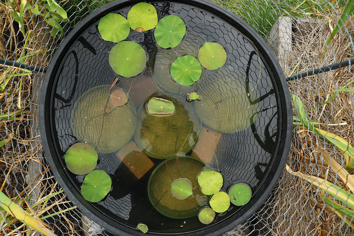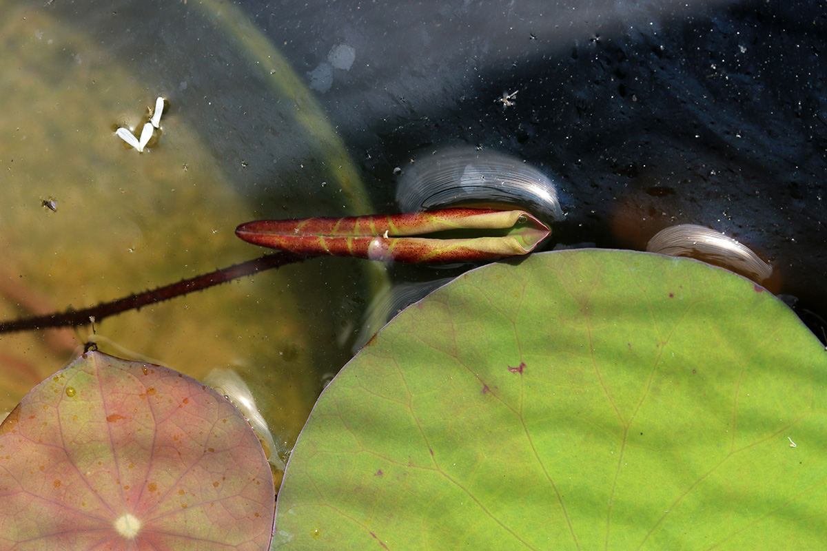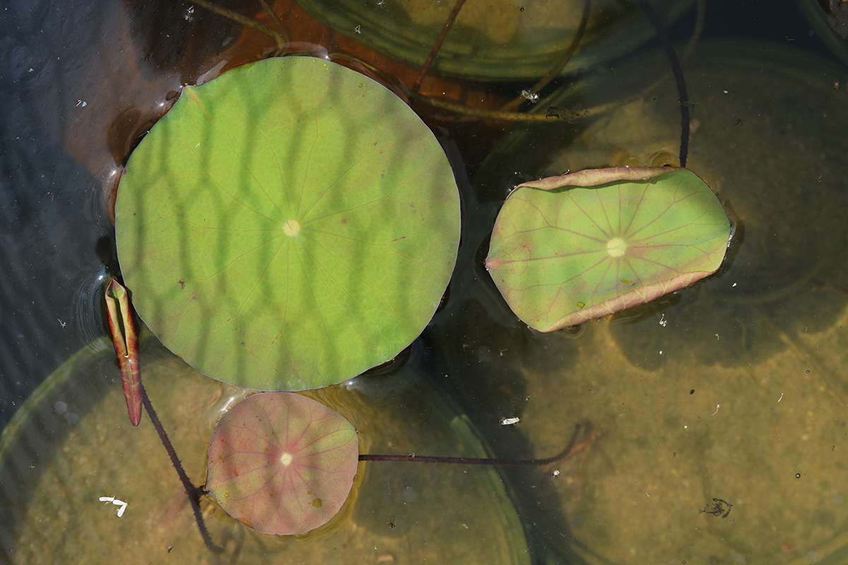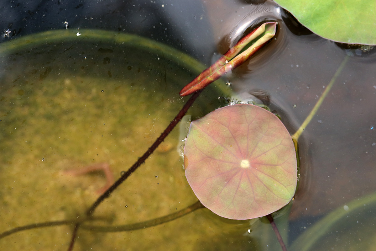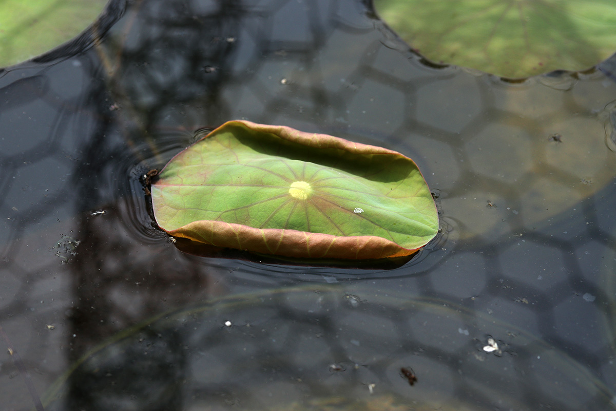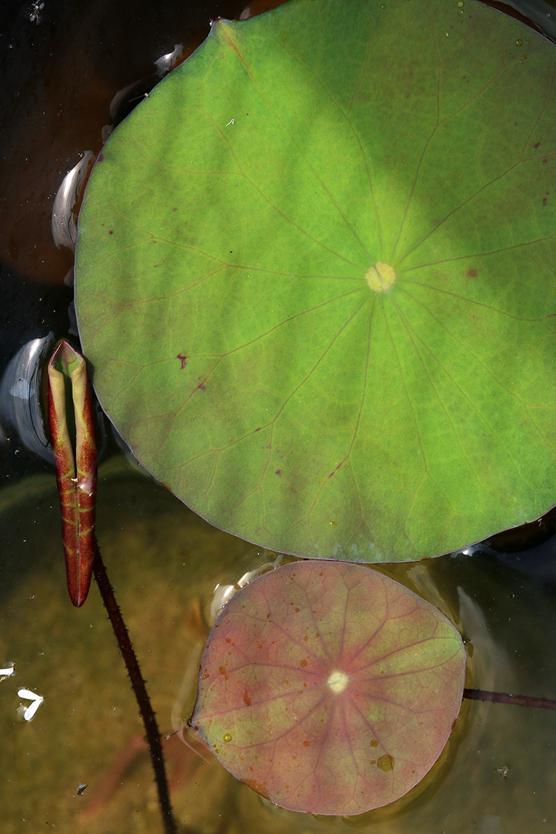 one coin leaf unfurls, another new furled coin leaf takes it place. seem like the lotuses are making a new leaf every 1-2 days. the scary root i saw yesterday, it's fully exposed now and it's not really a row of roots (like an old computer ribbon cable) but rather just the striated patterning. the surface of the barrel is littered with Bti oil slicks, bit of blown plant debris, and bodies of unwary insects. i'm tempted to overflow the barrel with a garden hose to clean off the surface, but i'm worried about the chlorine and chloramine levels. just how sensitive are lotuses to these common tap water disinfectants?