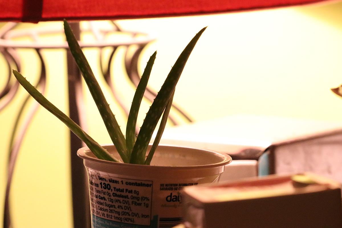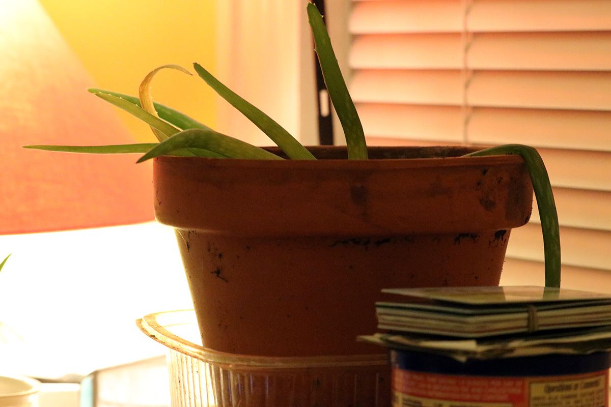 both of my aloes are growing in my living room now: there's enough sunlight to keep them happy (better than in my kitchen). i watered too much in the large pot and some of the arms are beginning to rot off, but the cluster of center branches still look healthy.