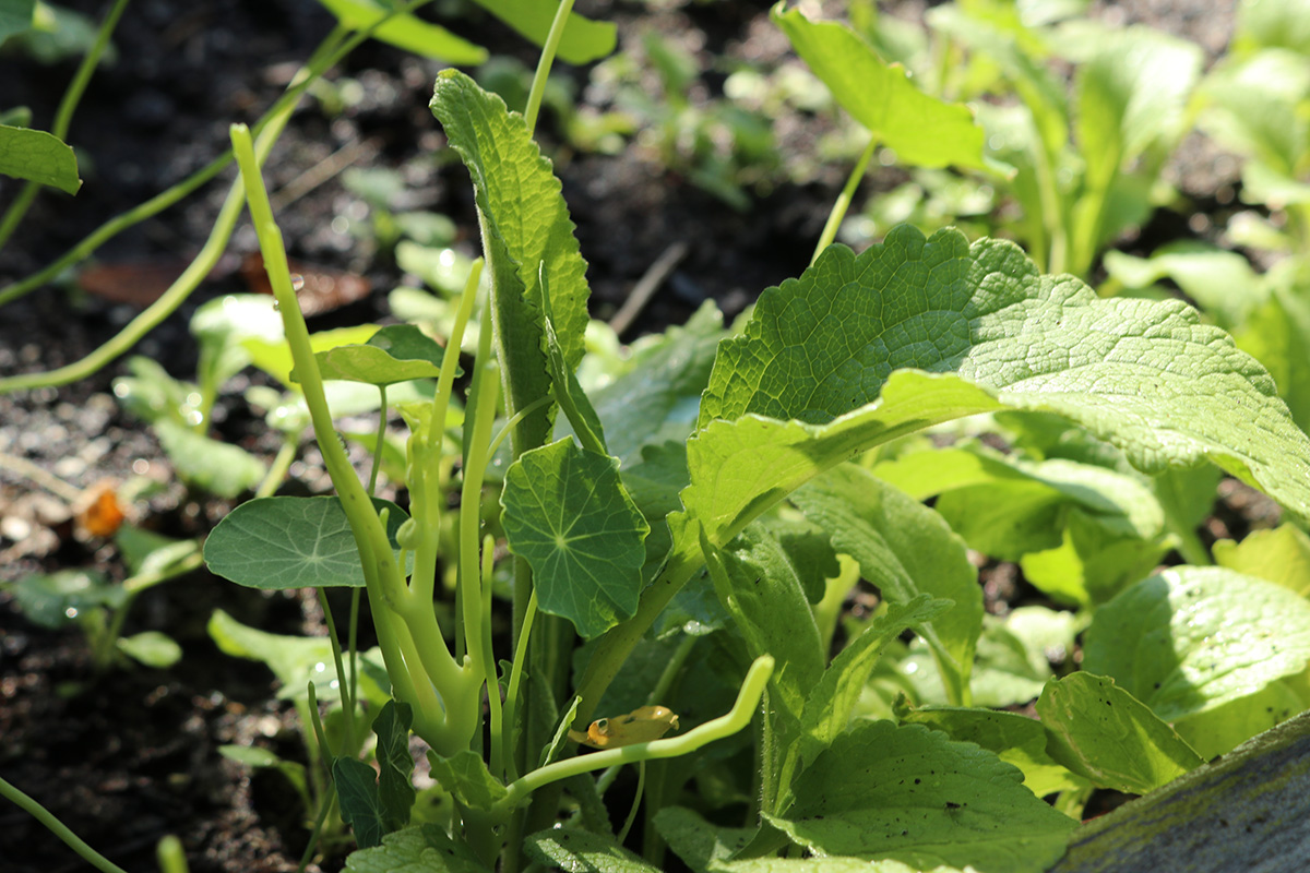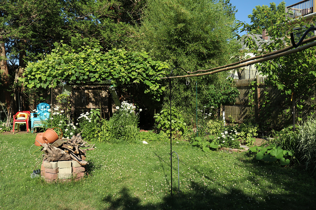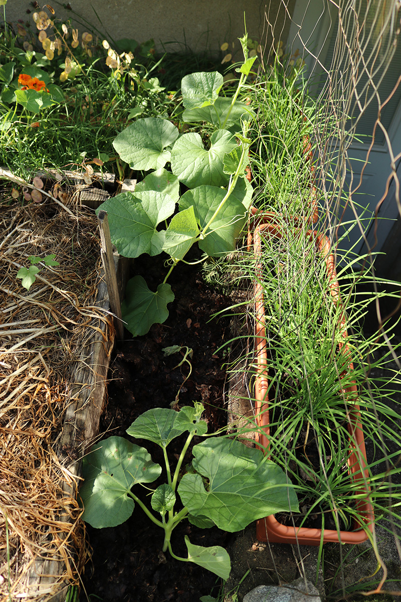 back in belmont, i did some more yard work. i inspected all the squash plants for vine borer eggs. i pruned off any spent daisies and tied a bunch together so they weren't falling apart. i noticed some critter (i'm thinking rabbits) had chewed up some of my nasturtiums and most of my ground level dill. i found a new hole underneath the southern fence where i blocked it off yesterday, so i had to seal it again, this time with a long piece of fencing plank and some rocks.