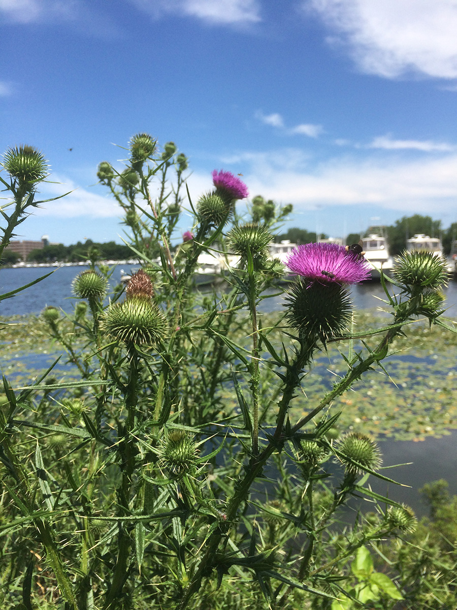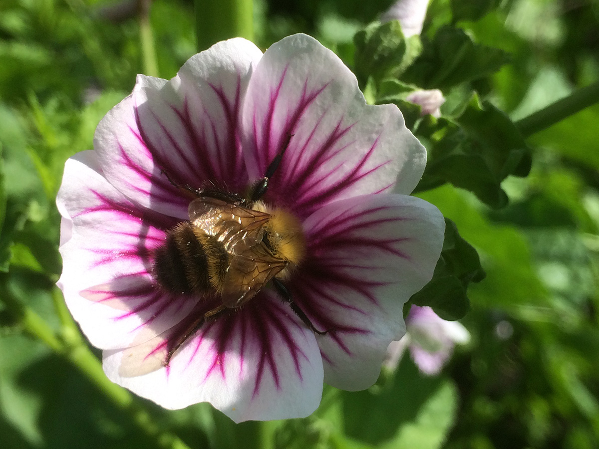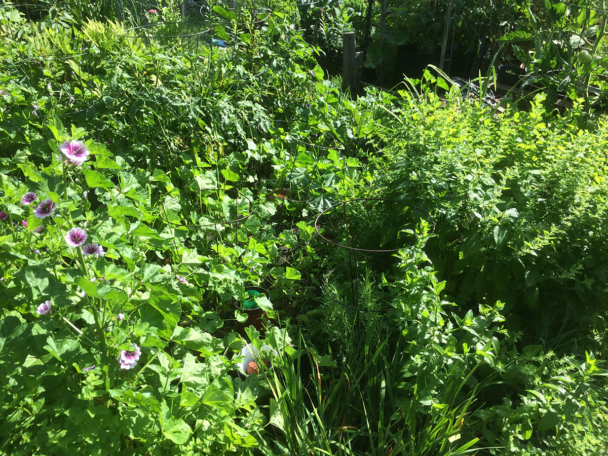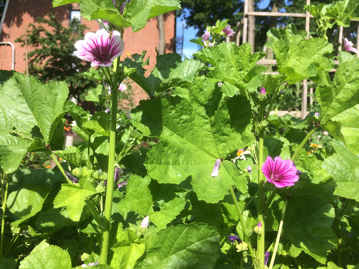 my community garden plot is a real jungle now. lemon balm takes up most of the front of the garden, while striped mallows take up the rest. i don't have the heart to pull them out even though i should and at this point it's more of a mallow hording issue. i wanted to transplant them, some to my front yard, some to my parents' backyard, but they have shallow roots and don't take well to being moved. i think i will have no choice but to remove some as they're blocking sunlight from getting onto my pepper plants, which are stunted at the moment.