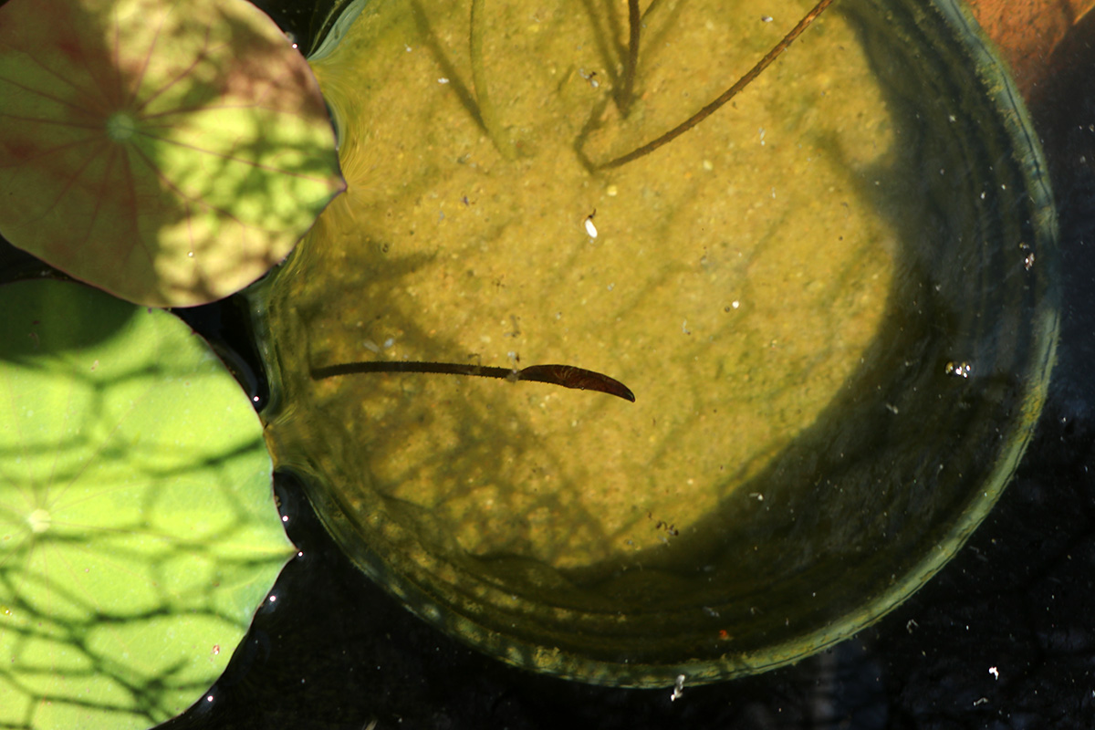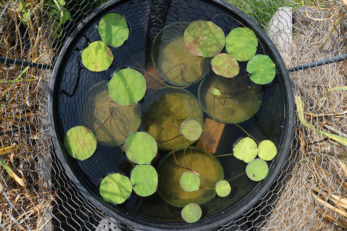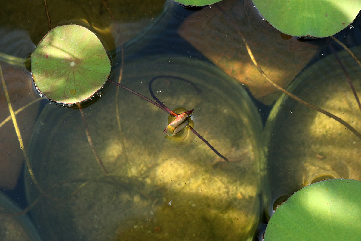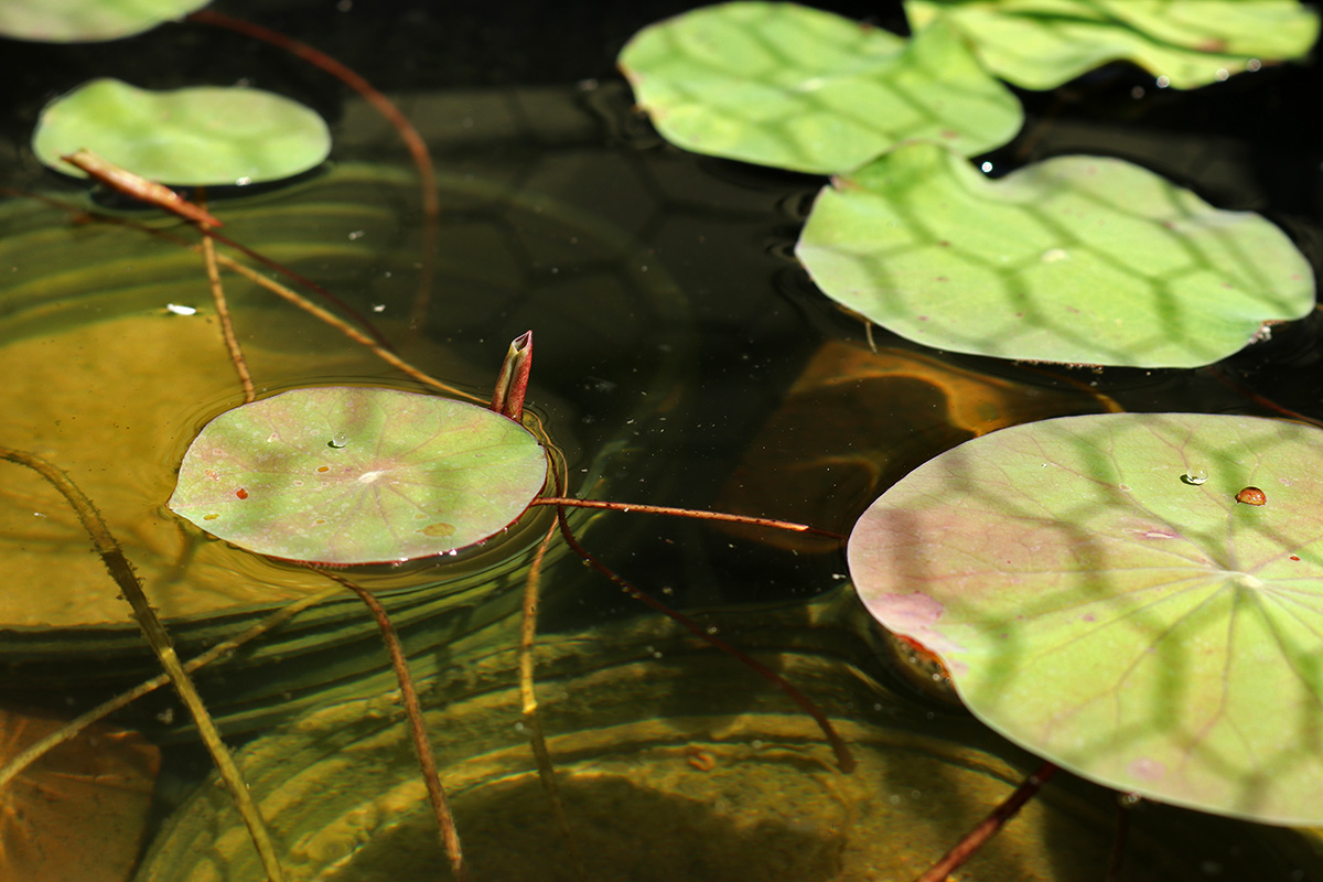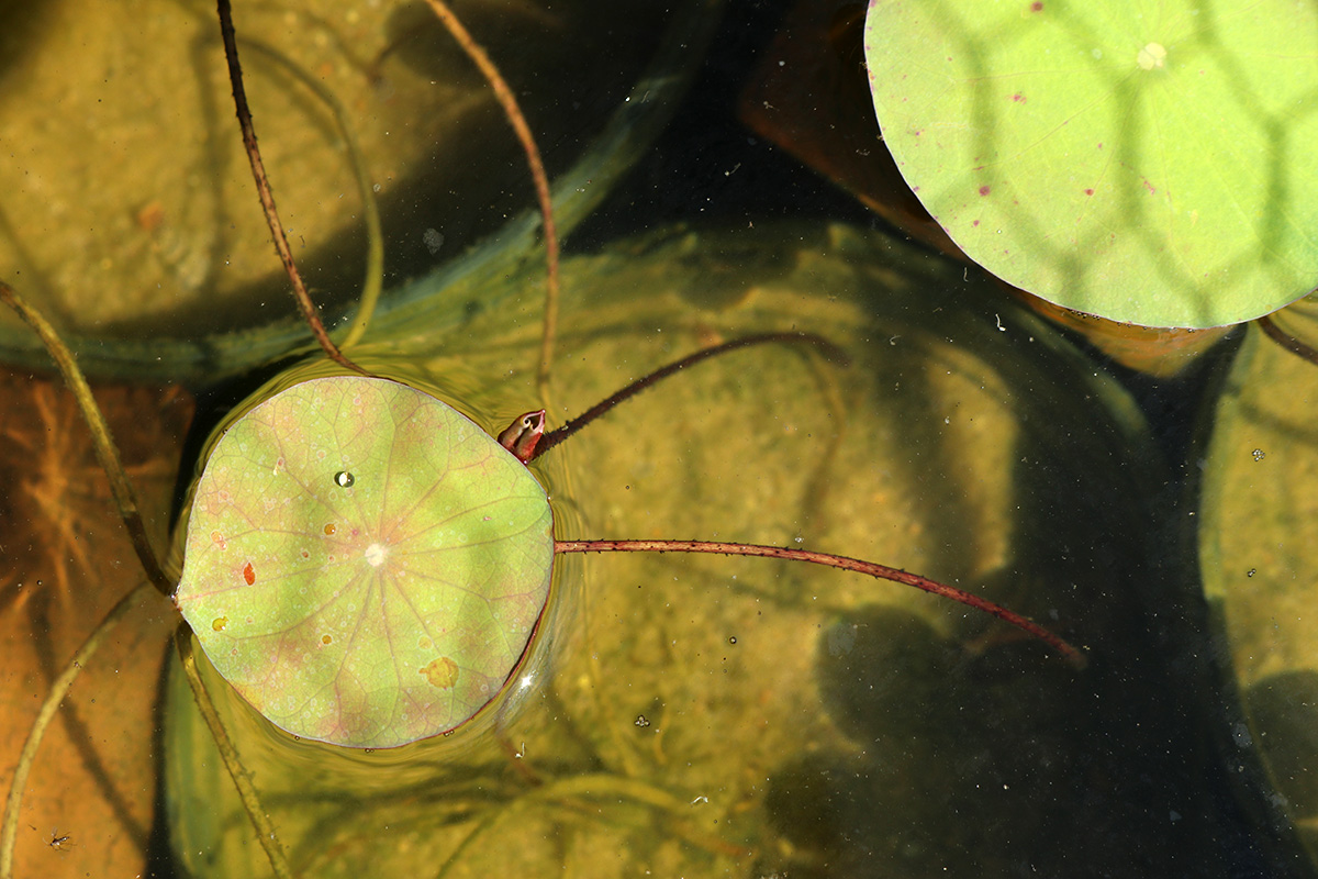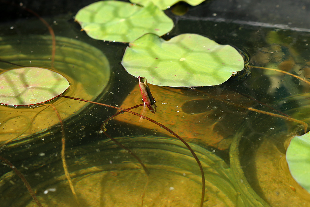 there are a few possible lotus aerial leaf candidates. there's also no reason why there should be aerial leaves at all, it's more of a developmental milestone. the lotuses would grow just as well producing only floating coin leaves. aerial leaves are also the signal to begin fertilizing. there's conflicting advice, some say not to fertilize at all the first year, while others say to fertilize but not too soon or too much or it could ruin the lotuses.
