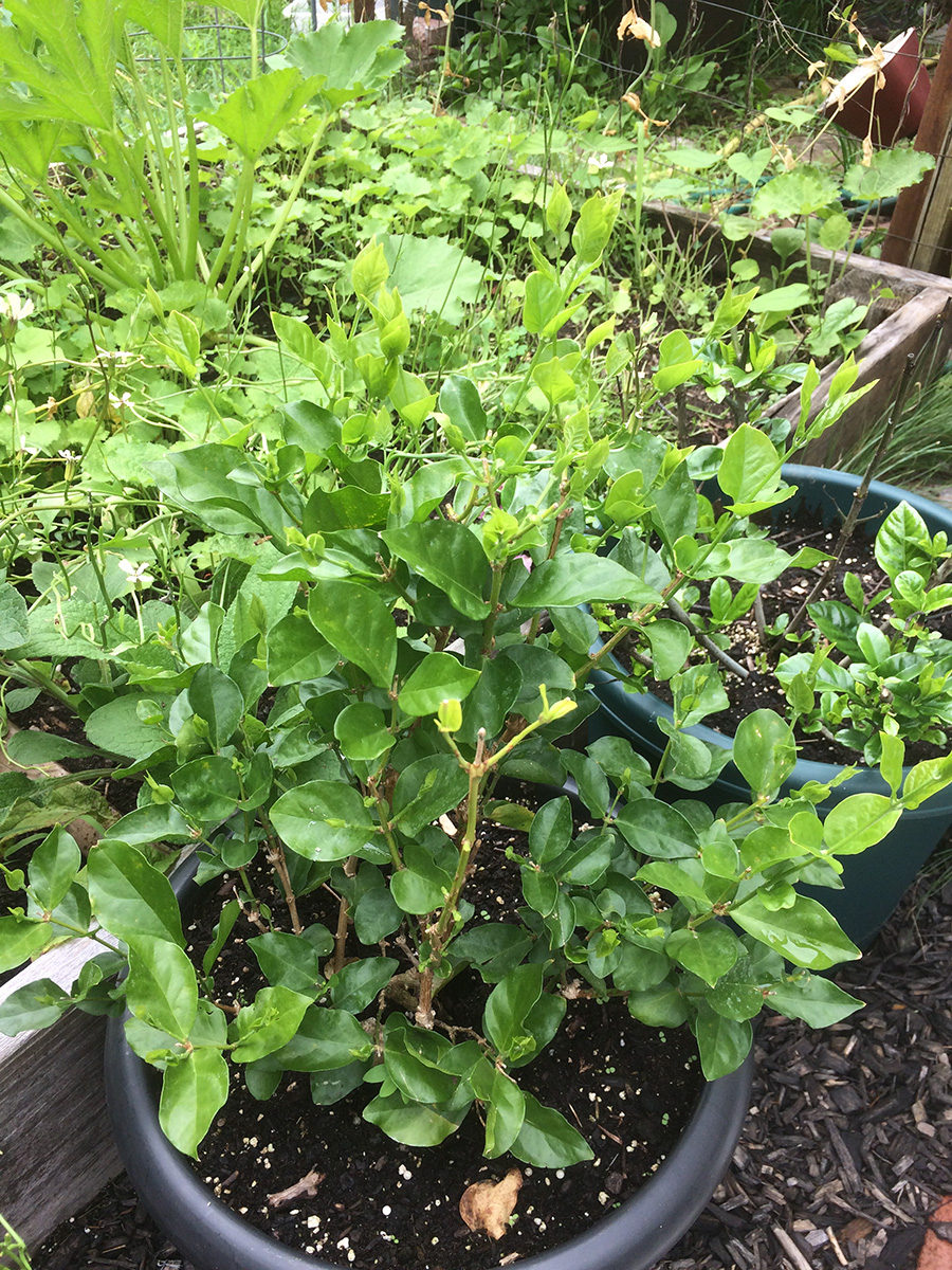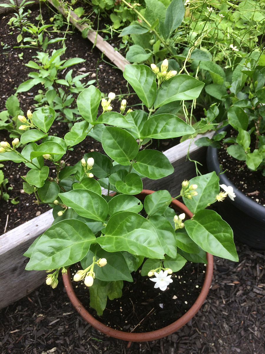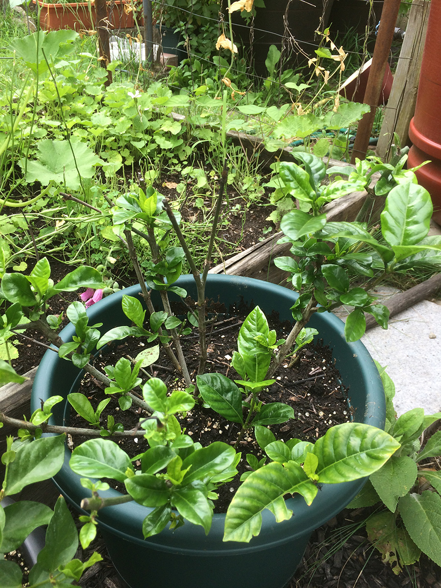 a flush of new blossoms have appeared on our regular jasmine plants while the belle of india jasmines seem slow to blossom. my father thinks it's because the roots got damaged when he divided up the plant we purchased back in the spring. when they do blossom the belle of india jasmines last for 2 days and have a stronger scent than regular jasmine. the gardenia won't flower until next spring, but we want it to leave out as much as possible, as the plant was completely defoliated a few months ago and we thought it was already dead. it seemed to have miraculously come back to life and producing so many leaves it seems to be on plant steroids.