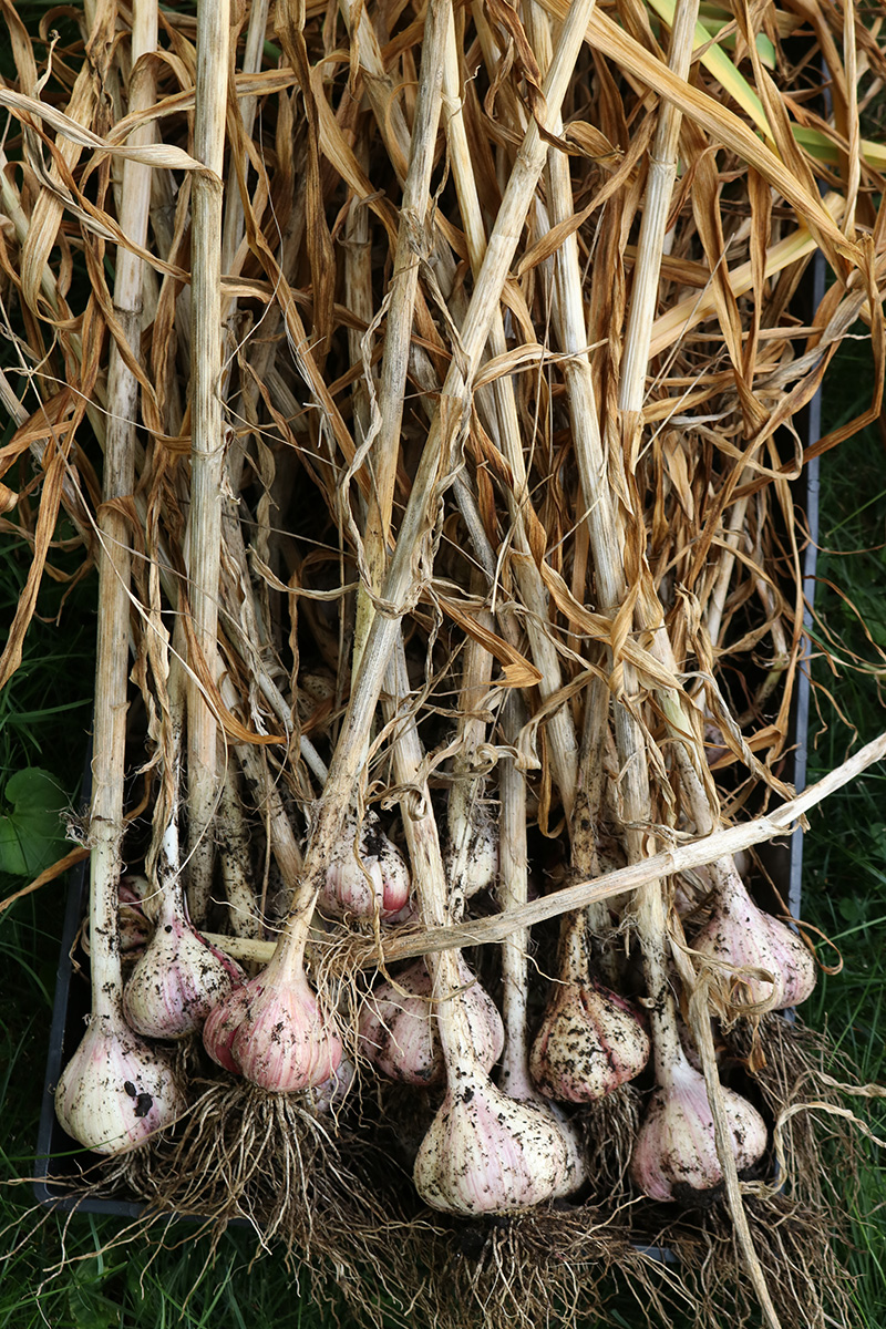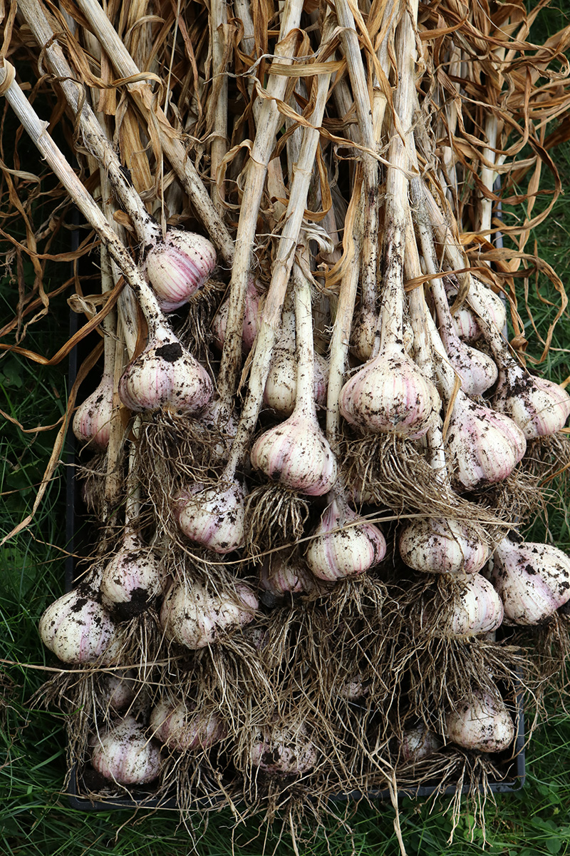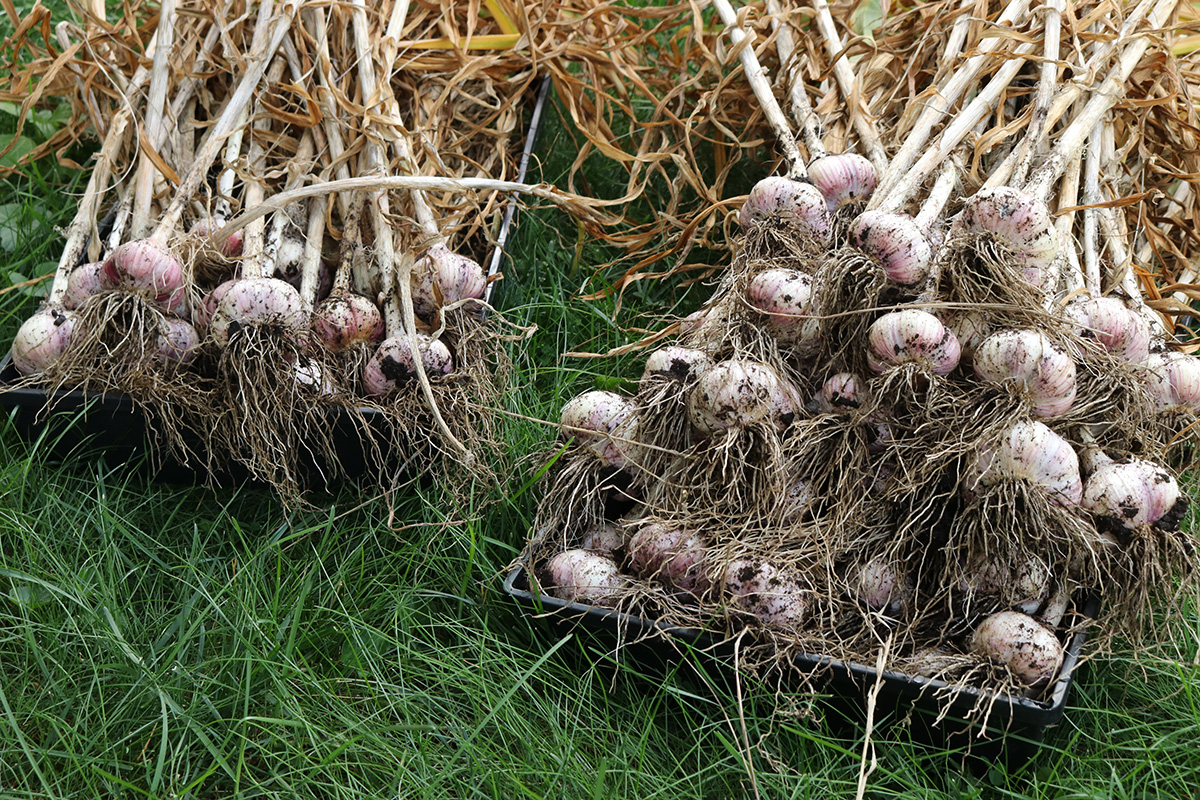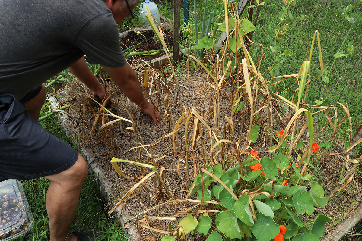 we dug up the garlics from RB4 on monday. today we dug up the rest. we continued with RB2, working down to RB1 and RB0, the garlics getting progressively bigger. there were some big ones, but i was kind of disappointed, as i thought there'd be more. the garlics on the left side of RB1 were overripe, and the heads had started to break apart into cloves. those will either be eaten or replanted since they'll be hard to keep. as for the rest, i put them in the cool dry basement so they can cure. my father and i tried a raw clove, it didn't taste particularly spicy, maybe the curing will enhance the flavor.