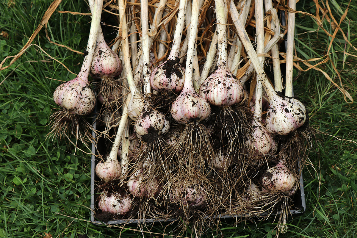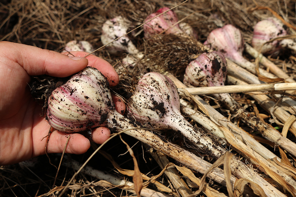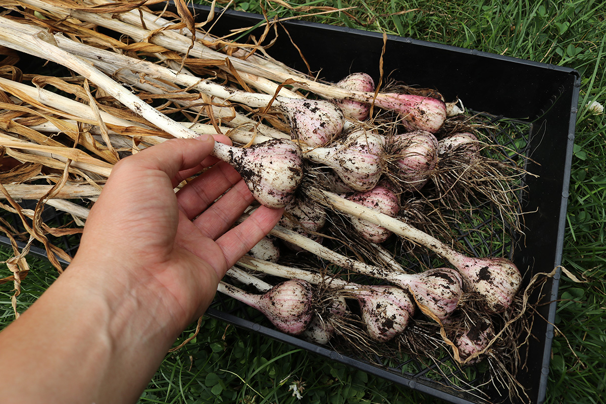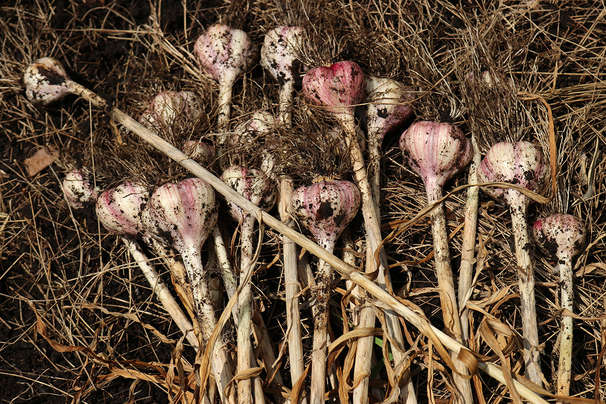 we dug up the garlics from RB4 on monday. today we dug up the rest. we continued with RB2, working down to RB1 and RB0, the garlics getting progressively bigger. there were some big ones, but i was kind of disappointed, as i thought there'd be more. the garlics on the left side of RB1 were overripe, and the heads had started to break apart into cloves. those will either be eaten or replanted since they'll be hard to keep. as for the rest, i put them in the cool dry basement so they can cure. my father and i tried a raw clove, it didn't taste particularly spicy, maybe the curing will enhance the flavor.