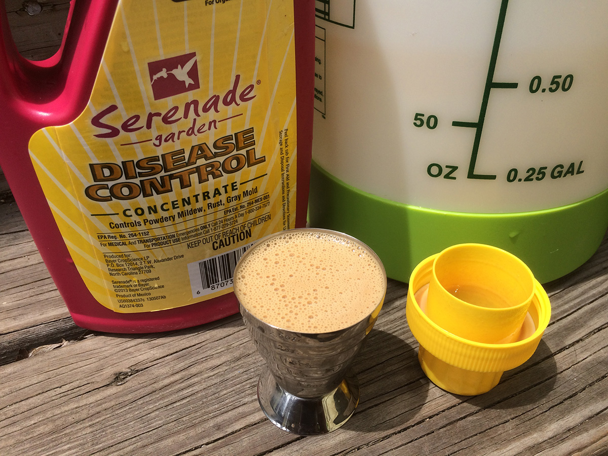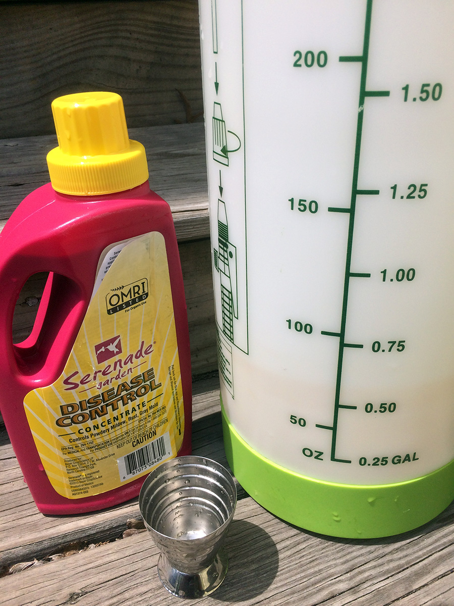 my serenade organic fungicide ($15.99 32 oz.) arrived yesterday, i was eager to put it to use. serenade contains biopesticide Bacillus subtilis (patented strain QST 713) which naturally attacks plant fungal pathogens. it's one of the recommended treatment for blight when i chatted with other gardeners. i emptied the iron solution from the garden sprayer and added 2-1/2 oz. of serenade solution to 1 gallon of water. serenade - milky brownish like coffee - has a distinctive smell - not bad but not good either. i sprayed the tomatoes which need it the most - many of the lower leaves have yellowed - and then sprayed some other vegetables as well as the grapes. i ended up using the whole gallon of serenade solution. now i just need to wait and see if it works, and keep on spraying weekly.