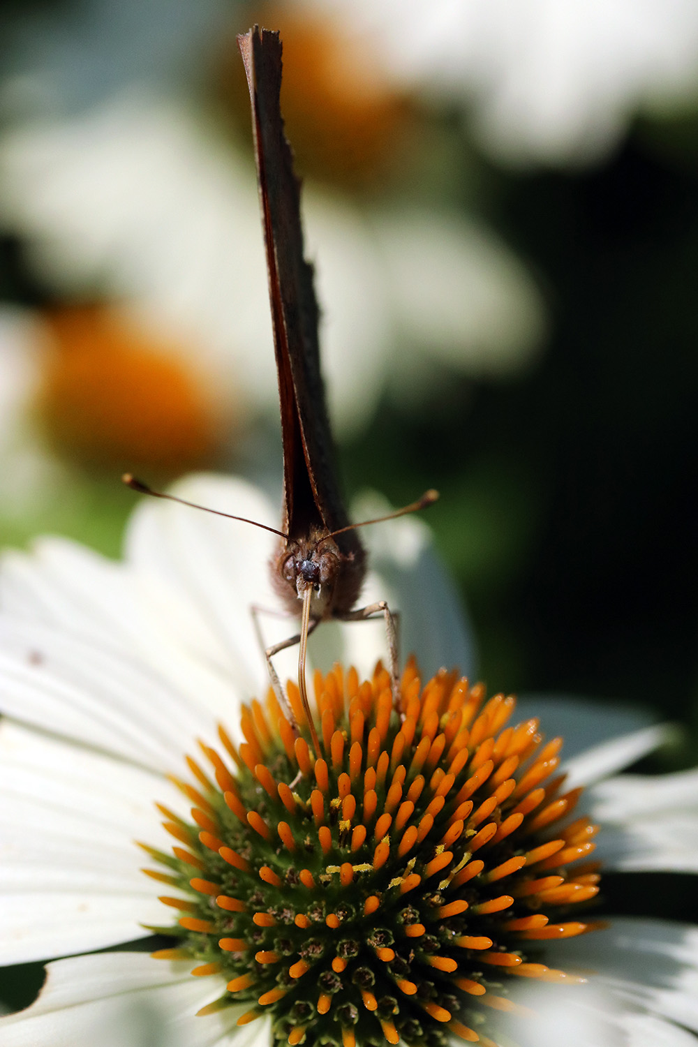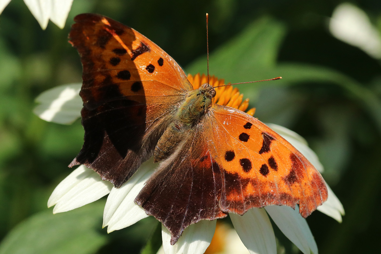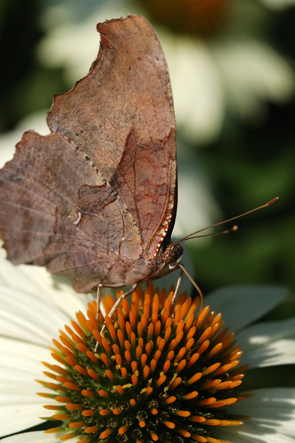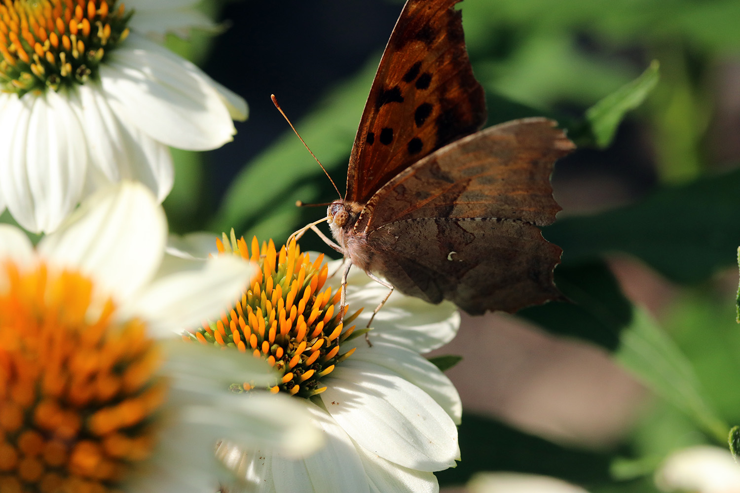 as i had my 60mm lens with me, i went around the community garden looking for insects to photograph before the sun got eclipsed by the western trees. i identified a question mark butterfly (Polygonia interrogationis), which gets its name from the white "comma" and "dot" marks on the underside of its wings. i've also seen commas in the past, as well as false commas (compton tortoiseshells). i like the challenge of photographing butterflies. different species have different characteristics, with some being very friendly and photogenic while others are very skittish and fly away when disturbed. but if you ever find yourself in a clear surrounded by wildflowers, that's the best place to capture them.