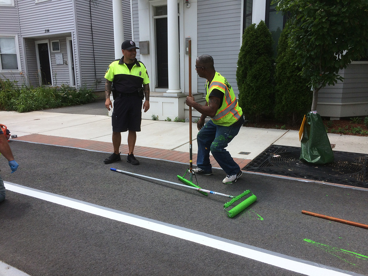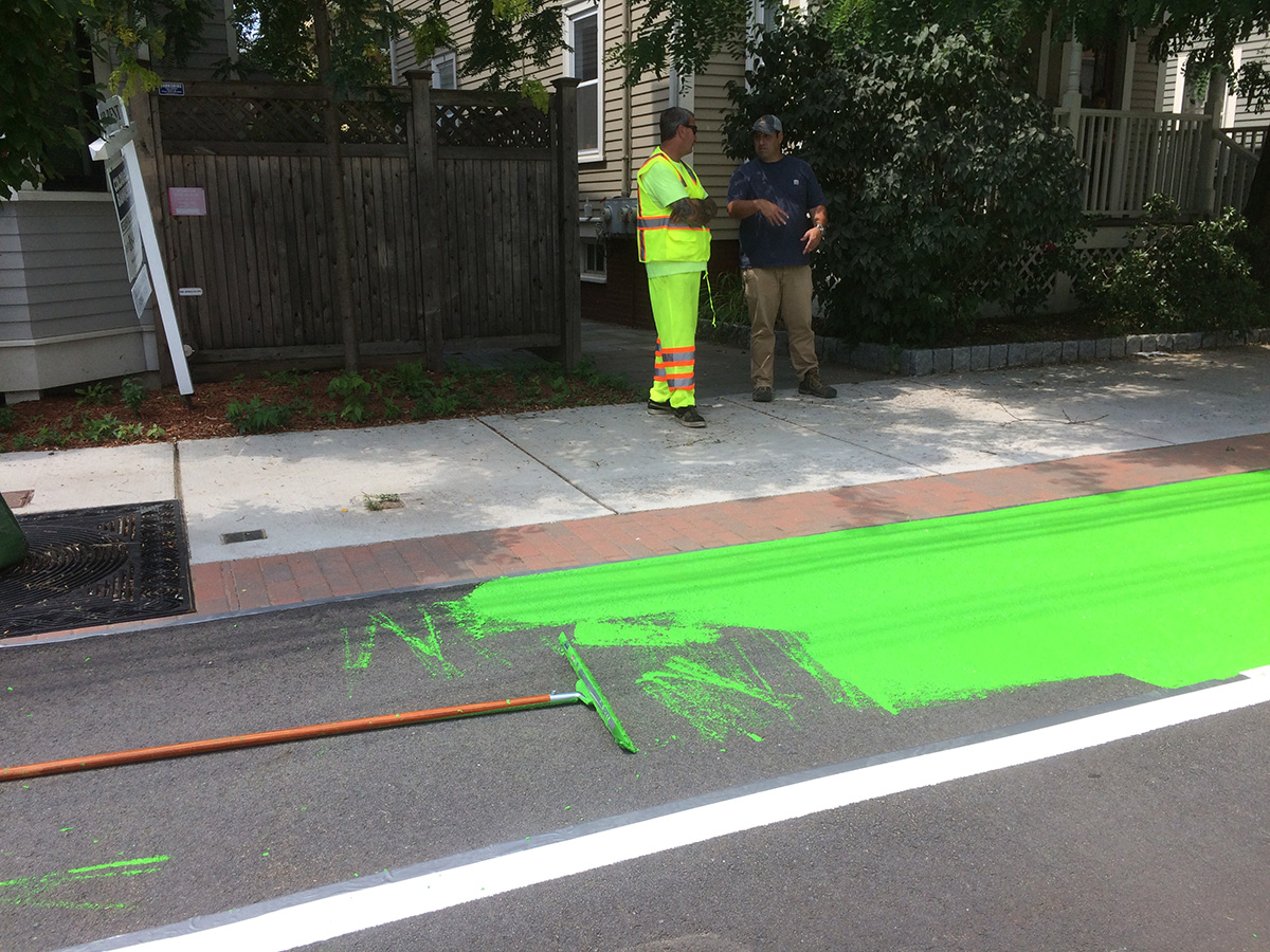 the city of somerville is painting the beacon street cycle track. it's hard to miss in its bright fluorescent green. but besides the color, it was the odor that made me first notice, a horrible melting plastic stench that i could smell from my house with all the windows closed. that cycle track seems like a neverending boondoggle. i asked the workers if they were going to paint the bike lane on the other side of the street as well, nobody knew, but the cop chimed in and said they were going to raise it up like they did on the inbound side (i doubt that's true).