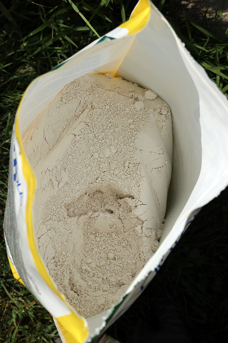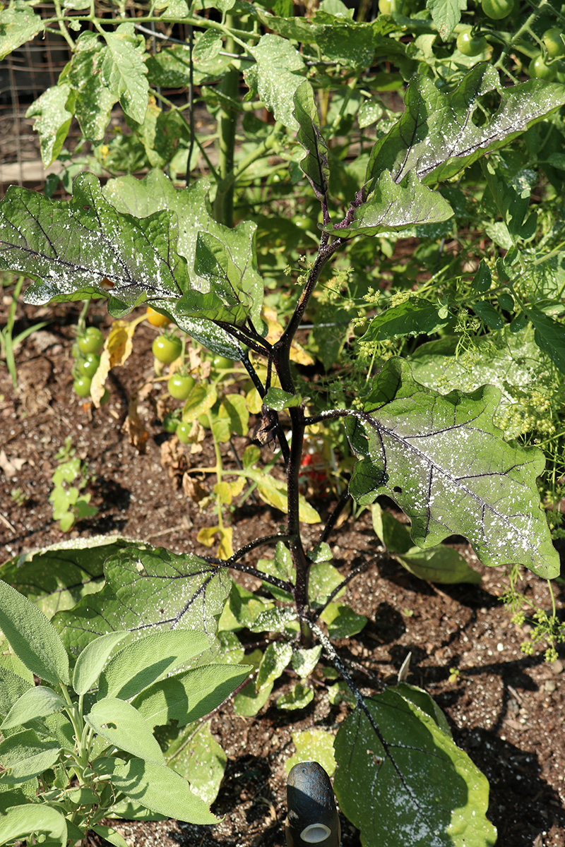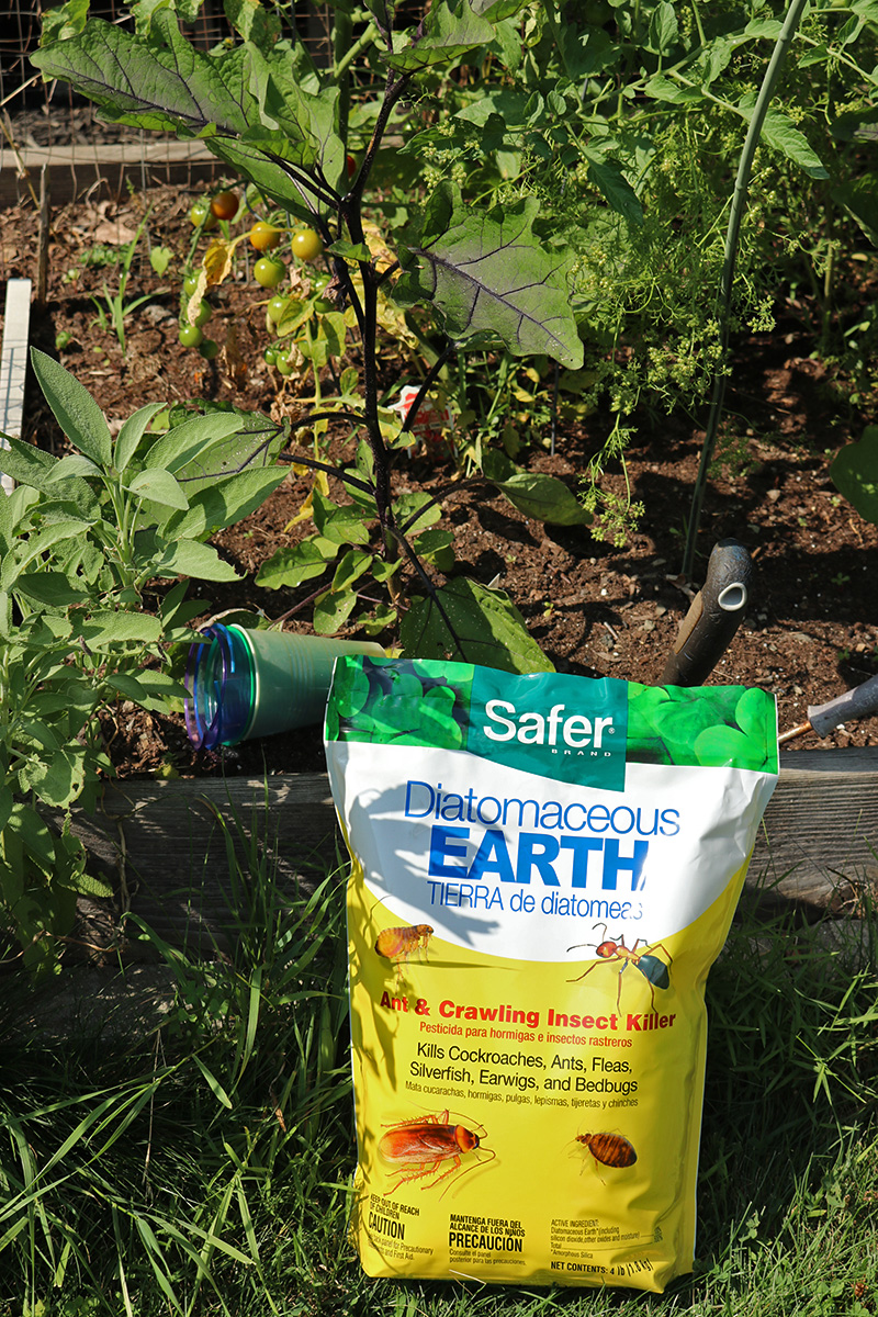 i've used a lot of different herbicide and insecticide over the years, but i've never tried diatomaceous earth (DE) even though i've heard a lot of good things about it (although in my blog search i've found a single mention where i've used it but can't find the actual posting of application). i've noticed weeks ago that the eggplants and now some of the tomatoes have been getting flea beetles. DE supposedly works to get rid of them, but one side effect is it can also hurt beneficial insects. DE comes in a powder form and requires using a duster to apply which i don't have. there are plenty of ways to make a DIY duster, but i ended up grabbing one of my seedling growing cups with holes at the bottom and using it as sprinkler. only downside is i couldn't get to the bottom of the leaves, but i'll try to find a better duster this week (dollar store is my friend).